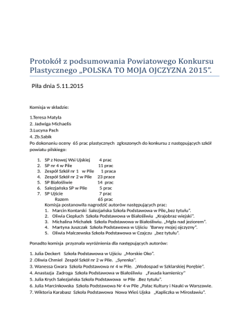Protokół z podsumowania Powiatowego Konkursu Plastycznego „POLSKA TO MOJA OJCZYZNA 2015”. Piła dnia 5.11.2015 Komisja w składzie: 1.Teresa Matyla 2. Jadwiga Michaelis 3.Lucyna Pach 4. Zb.Sabik Po dokonaniu oceny 65 prac plastycznych zgłoszonych do konkursu z następujących szkół powiatu pilskiego: 1. 2. 3. 4. 5. 6. 7. SP z Nowej Wsi Ujskiej 4 prac SP nr 4 w Pile 11 prac Zespół Szkół nr 1 w Pile 1 praca Zespół Szkół nr 2 w Pile 23 prace SP Białośliwie 14 prac Salezjańska SP w Pile 5 prac SP Ujście 7 prac Razem 65 prac Komisja postanowiła nagrodzić autorów następujących prac: 1. Marcin Kontarski Salezjańska Szkoła Podstawowa w Pile„bez tytułu”. 2. Oliwia Ciepluch Szkoła Podstawowa w Białośliwiu „Krajobraz wiejski”. 3. Michalina Michałek Szkoła Podstawowa w Białośliwiu. „Mgła nad jeziorem”. 4. Martyna Juszczak Szkoła Podstawowa w Ujściu ‘Barwy mojej ojczyzny”. 5. Oliwia Malczewska Szkoła Podstawowa w Czajczu „bez tytułu”. Ponadto komisja przyznała wyróżnienia dla następujących autorów: 1. Julia Deckert Szkoła Podstawowa w Ujściu „Morskie Oko”. 2 .Oliwia Chmiel Zespół Szkół nr 2 w Pile. „Syrenka”. 3. Wanessa Gwara Szkoła Podstawowa nr 4 w Pile. „Wodospad w Szklarskiej Porębie”. 4. Anastazja Zadroga Szkoła Podstawowa w Białośliwiu „Fasada kamienicy” 5. Julia Krych Salezjańska Szkoła Podstawowa w Pile .Bez tytułu”. 6. Julia Marcinkowska Szkoła Podstawowa Nr 4 w Pile „Pałac Kultury i Nauki w Warszawie. 7. Wiktoria Karabasz Szkoła Podstawowa Nowa Wieś Ujska „Kapliczka w Mirosławiu”. 8. Nikola Ignaczak Szkoła Podstawowa nr 4 w Pile „Kopernik”. 9. Paulina Jagła Szkoła Podstawowa w Ujściu „Widok na zamek”. 10.Oliwia Łoś Szkoła Podstawowa w Białośliwiu. „Nad morzem”. Na wystawę pokonkursową oprócz prac nagrodzonych i wyróżnionych zakwalifikowano prace następujących autorów: 1.Nikola Wejer Szkoła Podstawowa w Białośliwiu „Pieniny”. 2.Amelia Ludka Szkoła Podstawowa w Czajczu „Słonecznik”. 3.Weronika Dragacz Szkoła Podstawowa w Białośliwiu „Nad Bałtykiem”. 4.Daria Gruszka Szkoła Podstawowa w Czajczu „ Młyn”. 5.Maja Ganske Zespół Szkół nr 2 w Pile „Harcerka”. 6,Julia Kowalik Zespół Szkół nr 1 w Pile „Stadion Narodowy”. 7.Wiktoria Czyż Szkoła Podstawowa w Białośliwiu „Kościół w Lipnicy”. 8.Tomasz Troczyński Salezjańska SP w Pile „Zamek”. 9.Zuzanna Szawłowska Szkoła Podstawowa w Białośliwiu „Krajobraz Noteć”. 10.Maria Krauze Szkoła Podstawowa w Białośliwiu. ‘Białośliwskie Łąki”. 11.Nikodem Piasecki Zespół Szkół nr 2 w Pile.” POLSKA”. 12.Natalia Socha Zespół Szkół nr 2 w Pile „Altanka w Pile”. Podsumowanie konkursu ,wystawa pokonkursowa –wręczenie nagród, wyróżnień ,dyplomów za udział w wystawie dnia 14 listopada o godz.12,00 w Sali widowiskowej MDK „ISKRA” w Pile. Dyrektor MDK „ISKRA” Zb. Sabik