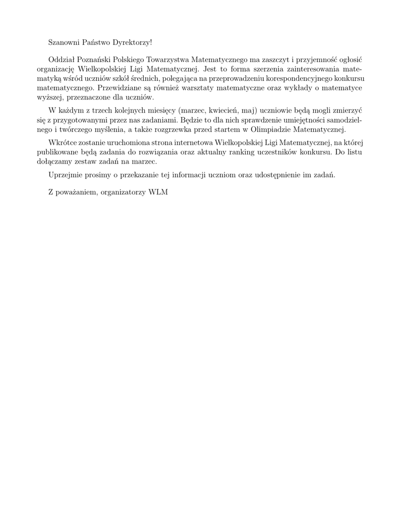 Szanowni Państwo Dyrektorzy! Oddział Poznański Polskiego Towarzystwa Matematycznego ma zaszczyt i przyjemność ogłosić organizację Wielkopolskiej Ligi Matematycznej. Jest to forma szerzenia zainteresowania matematyką wśród uczniów szkół średnich, polegająca na przeprowadzeniu korespondencyjnego konkursu matematycznego. Przewidziane są również warsztaty matematyczne oraz wykłady o matematyce wyższej, przeznaczone dla uczniów. W każdym z trzech kolejnych miesięcy (marzec, kwiecień, maj) uczniowie będą mogli zmierzyć się z przygotowanymi przez nas zadaniami. Będzie to dla nich sprawdzenie umiejętności samodzielnego i twórczego myślenia, a także rozgrzewka przed startem w Olimpiadzie Matematycznej. Wkrótce zostanie uruchomiona strona internetowa Wielkopolskiej Ligi Matematycznej, na której publikowane będą zadania do rozwiązania oraz aktualny ranking uczestników konkursu. Do listu dołączamy zestaw zadań na marzec. Uprzejmie prosimy o przekazanie tej informacji uczniom oraz udostępnienie im zadań. Z poważaniem, organizatorzy WLM Wielkopolska Liga I WLM – ZESTAW A Matematyczna Zadanie A1. Ciąg (a) liczb całkowitych dodatnich spełnia dla każdego n całkowitego dodatniego warunki a2n = 3an − 1, a2n+1 = 3an + 1. Wykazać, że ciąg ten jest ściśle rosnący. Zadanie A2. W czworokącie wypukłym ABCD spełniony jest warunek AB = BC + DA. Dwusieczne kątów ABC i DAB przecinają się w punkcie P . Udowodnić, że CP = DP . Zadanie A3. Niech n będzie liczbą całkowitą dodatnią. Trójkąt równoboczny o boku n rozcięto na t trójkątów równobocznych o boku 1 oraz pewną liczbę rombów o boku 1 i kącie ostrym 60◦ . Udowodnić, że t n. Zadanie A4. Liczby a, b, c są całkowite dodatnie, przy czym a2 + b2 = c2 . Dowieść, że liczba c2 + 23 ab jest całkowita i złożona. Rozwiązania powyższych zadań należy przesłać listem poleconym lub dostarczyć na następujący adres: Wielkopolska Liga Matematyczna Collegium Mathematicum ul.Umultowska 87 61-614 Poznań w terminie do 31 marca 2010r. (decyduje towego). data stempla pocz- Wszystkie nadesłane przez uczestnika rozwiązania powinny być zapisane na oddzielnych kartkach formatu A4, zapisanych po jednej stronie. W lewym, górnym narożniku każdego arkusza uczestnik wpisuje swoje imię i nazwisko, a także nazwę szkoły i klasy. Przed wysłaniem rozwiązań należy zapoznać się z regulaminem WLM. Wszelkie informacje o Wielkopolskiej Lidze Matematycznej, w tym regulamin, treści zadań oraz aktualny ranking uczestników, można znaleźć pod adresem www.astagor.net/wlm