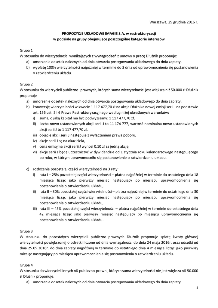 Warszawa, 29 grudnia 2016 r. PROPOZYCJE UKŁADOWE IMAGIS S.A. w restrukturyzacji w podziale na grupy obejmujące poszczególne kategorie interesów Grupa 1 W stosunku do wierzytelności wynikających z wynagrodzeń z umowy o pracę Dłużnik proponuje: a) umorzenie odsetek należnych od dnia otwarcia postępowania układowego do dnia zapłaty, b) wypłatę 100% wierzytelności najpóźniej w terminie do 3 dnia od uprawomocnienia się postanowienia o zatwierdzeniu układu. Grupa 2 W stosunku do wierzycieli publiczno–prawnych, których suma wierzytelności jest większa niż 50.000 zł Dłużnik proponuje a) umorzenie odsetek należnych od dnia otwarcia postępowania układowego do dnia zapłaty, b) konwersję wierzytelności w kwocie 1 117 477,70 zł na akcje Dłużnika nowej emisji serii J na podstawie art. 156 ust. 5 i 6 Prawa Restrukturyzacyjnego według niżej określonych warunków: i) suma, o jaką kapitał ma być podwyższany: 1 117 477,70 zł, ii) liczba nowo ustanowionych akcji serii J to 11 174 777, wartość nominalna nowo ustanowionych akcji serii J to 1 117 477,70 zł, iii) objęcie akcji serii J następuje z wyłączeniem prawa poboru, iv) akcje serii J są na okaziciela, v) cena emisyjna akcji serii J wynosi 0,10 zł za jedną akcję, vi) akcje serii J będą uczestniczyć w dywidendzie od 1 stycznia roku kalendarzowego następującego po roku, w którym uprawomocniło się postanowienie o zatwierdzeniu układu. c) rozłożenie pozostałej części wierzytelności na 3 raty: i) rata I – 25% pozostałej części wierzytelności – płatna najpóźniej w terminie do ostatniego dnia 18 miesiąca licząc jako pierwszy miesiąc następujący po miesiącu uprawomocnienia się postanowienia o zatwierdzeniu układu, ii) rata II – 30% pozostałej części wierzytelności – płatna najpóźniej w terminie do ostatniego dnia 30 miesiąca licząc jako pierwszy miesiąc następujący po miesiącu uprawomocnienia się postanowienia o zatwierdzeniu układu, iii) rata III – 45% pozostałej części wierzytelności – płatna najpóźniej w terminie do ostatniego dnia 42 miesiąca licząc jako pierwszy miesiąc następujący po miesiącu uprawomocnienia się postanowienia o zatwierdzeniu układu. Grupa 3 W stosunku do pozostałych wierzycieli publiczno–prawnych Dłużnik proponuje spłatę kwoty głównej wierzytelności powiększonej o odsetki liczone od dnia wymagalności do dnia 24 maja 2016r. oraz odsetki od dnia 25.05.2016r. do dnia zapłaty najpóźniej w terminie do ostatniego dnia 4 miesiąca licząc jako pierwszy miesiąc następujący po miesiącu uprawomocnienia się postanowienia o zatwierdzeniu układu. Grupa 4 W stosunku do wierzycieli innych niż publiczno-prawni, których suma wierzytelności nie jest większa niż 50.000 zł Dłużnik proponuje: a) umorzenie odsetek należnych od dnia otwarcia postępowania układowego do dnia zapłaty, 1 b) rozłożenie wierzytelności objętych układem na 3 raty: i) rata I – 1/3 sumy kwoty głównej powiększonej o odsetki liczone od dnia wymagalności do dnia 24 maja 2016r. – płatna najpóźniej w terminie do ostatniego dnia 6 miesiąca, licząc jako pierwszy, miesiąc następujący po miesiącu uprawomocnienia się postanowienia o zatwierdzeniu układu; ii) rata II – 1/3 sumy kwoty głównej powiększonej o odsetki liczone od dnia wymagalności do dnia 24 maja 2016r. – płatna najpóźniej w terminie do ostatniego dnia 12 miesiąca, licząc jako pierwszy, miesiąc następujący po miesiącu uprawomocnienia się postanowienia o zatwierdzeniu układu; iii) rata III – 1/3 sumy kwoty głównej powiększonej o odsetki liczone od dnia wymagalności do dnia 24 maja 2016r. – płatna najpóźniej w terminie do ostatniego dnia 18 miesiąca, licząc jako pierwszy, miesiąc następujący po miesiącu uprawomocnienia się postanowienia o zatwierdzeniu układu. Grupa 5 W stosunku do wierzycieli innych niż publiczno-prawni, których suma wierzytelności jest większa niż 50.000 zł oraz nie większa niż 100.000 zł Dłużnik proponuje: b) umorzenie odsetek należnych od dnia otwarcia postępowania układowego do dnia zapłaty, c) rozłożenie wierzytelności objętych układem na 3 raty: i) rata I – 1/3 sumy kwoty głównej powiększonej o odsetki liczone od dnia wymagalności do dnia 24 maja 2016r. – płatna najpóźniej w terminie do ostatniego dnia 12 miesiąca licząc jako pierwszy miesiąc następujący po miesiącu uprawomocnienia się postanowienia o zatwierdzeniu układu, ii) rata II – 1/3 sumy kwoty głównej powiększonej o odsetki liczone od dnia wymagalności do dnia 24 maja 2016r. – płatna najpóźniej w terminie do ostatniego dnia 24 miesiąca licząc jako pierwszy miesiąc następujący po miesiącu uprawomocnienia się postanowienia o zatwierdzeniu układu, iii) rata III – 1/3 sumy kwoty głównej powiększonej o odsetki liczone od dnia wymagalności do dnia 24 maja 2016r. – płatna najpóźniej w terminie do ostatniego dnia 36 miesiąca licząc jako pierwszy miesiąc następujący po miesiącu uprawomocnienia się postanowienia o zatwierdzeniu układu, Grupa 6 W stosunku do wierzycieli innych niż publiczno-prawni, których suma wierzytelności jest większa niż 100.000 zł Dłużnik proponuje: d) umorzenie odsetek należnych od dnia otwarcia postępowania układowego do dnia zapłaty, d) konwersję wierzytelności w kwocie 3.904.709,60 zł na akcje Dłużnika nowej emisji serii J na podstawie art. 156 ust. 5 i 6 Prawa Restrukturyzacyjnego według niżej określonych warunków: i) suma, o jaką kapitał ma być podwyższany: 3.904.709,60 zł, ii) liczba nowo ustanowionych akcji serii J to 39.047.096, wartość nominalna nowo ustanowionych akcji serii J to 3.904.709,60 zł, iii) objęcie akcji serii J następuje z wyłączeniem prawa poboru, iv) akcje serii J są na okaziciela, v) cena emisyjna akcji serii J wynosi 0,10 zł za jedną akcję, vi) akcje serii J będą uczestniczyć w dywidend