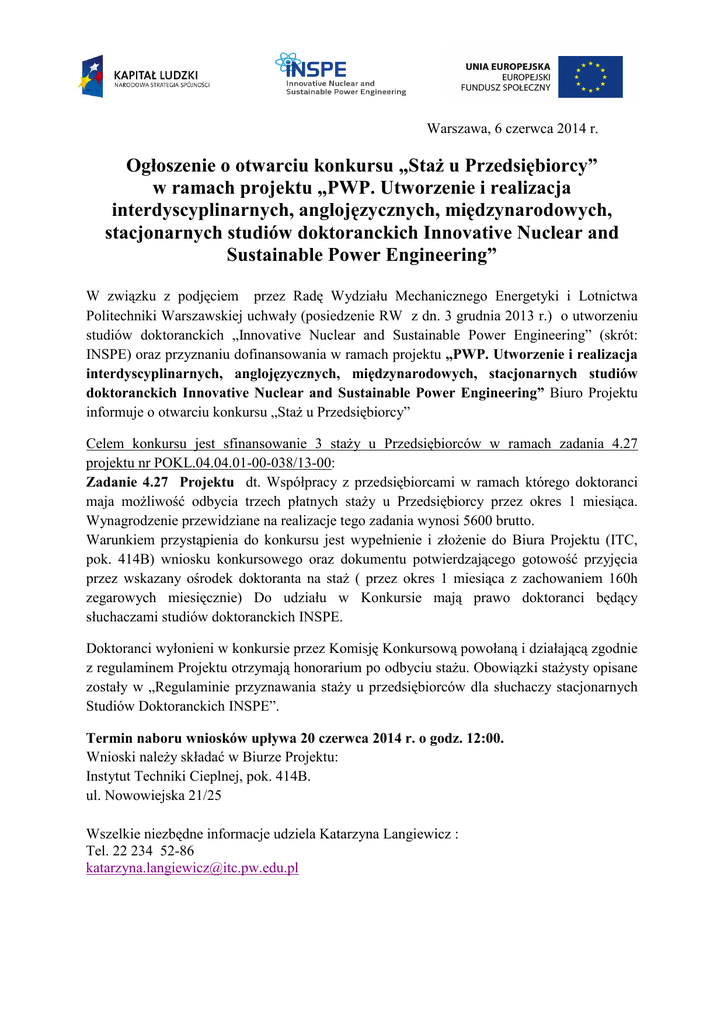Warszawa, 6 czerwca 2014 r. Ogłoszenie o otwarciu konkursu „Staż u Przedsiębiorcy” w ramach projektu „PWP. Utworzenie i realizacja interdyscyplinarnych, anglojęzycznych, międzynarodowych, stacjonarnych studiów doktoranckich Innovative Nuclear and Sustainable Power Engineering” W związku z podjęciem przez Radę Wydziału Mechanicznego Energetyki i Lotnictwa Politechniki Warszawskiej uchwały (posiedzenie RW z dn. 3 grudnia 2013 r.) o utworzeniu studiów doktoranckich „Innovative Nuclear and Sustainable Power Engineering” (skrót: INSPE) oraz przyznaniu dofinansowania w ramach projektu „PWP. Utworzenie i realizacja interdyscyplinarnych, anglojęzycznych, międzynarodowych, stacjonarnych studiów doktoranckich Innovative Nuclear and Sustainable Power Engineering” Biuro Projektu informuje o otwarciu konkursu „Staż u Przedsiębiorcy” Celem konkursu jest sfinansowanie 3 staży u Przedsiębiorców w ramach zadania 4.27 projektu nr POKL.04.04.01-00-038/13-00: Zadanie 4.27 Projektu dt. Współpracy z przedsiębiorcami w ramach którego doktoranci maja możliwość odbycia trzech płatnych staży u Przedsiębiorcy przez okres 1 miesiąca. Wynagrodzenie przewidziane na realizacje tego zadania wynosi 5600 brutto. Warunkiem przystąpienia do konkursu jest wypełnienie i złożenie do Biura Projektu (ITC, pok. 414B) wniosku konkursowego oraz dokumentu potwierdzającego gotowość przyjęcia przez wskazany ośrodek doktoranta na staż ( przez okres 1 miesiąca z zachowaniem 160h zegarowych miesięcznie) Do udziału w Konkursie mają prawo doktoranci będący słuchaczami studiów doktoranckich INSPE. Doktoranci wyłonieni w konkursie przez Komisję Konkursową powołaną i działającą zgodnie z regulaminem Projektu otrzymają honorarium po odbyciu stażu. Obowiązki stażysty opisane zostały w „Regulaminie przyznawania staży u przedsiębiorców dla słuchaczy stacjonarnych Studiów Doktoranckich INSPE”. Termin naboru wniosków upływa 20 czerwca 2014 r. o godz. 12:00. Wnioski należy składać w Biurze Projektu: Instytut Techniki Cieplnej, pok. 414B. ul. Nowowiejska 21/25 Wszelkie niezbędne informacje udziela Katarzyna Langiewicz : Tel. 22 234 52-86 [email protected]