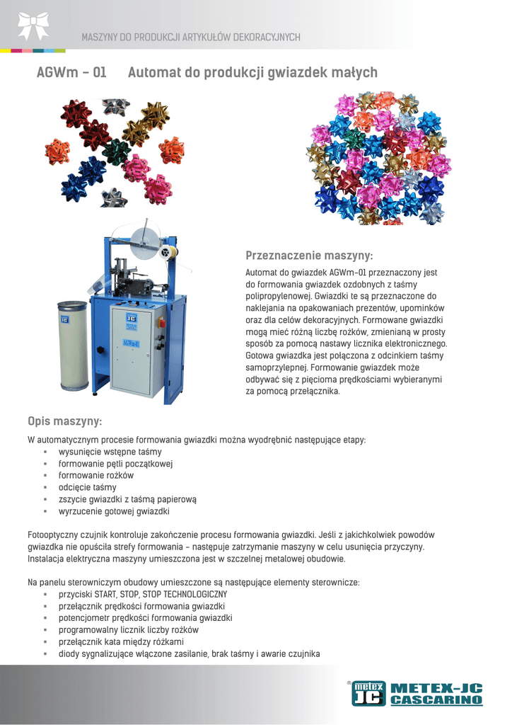 AGWm - 01 Automat do produkcji gwiazdek małych Przeznaczenie maszyny: Automat do gwiazdek AGWm-01 przeznaczony jest do formowania gwiazdek ozdobnych z taśmy polipropylenowej. Gwiazdki te są przeznaczone do naklejania na opakowaniach prezentów, upominków oraz dla celów dekoracyjnych. Formowane gwiazdki mogą mieć różną liczbę rożków, zmienianą w prosty sposób za pomocą nastawy licznika elektronicznego. Gotowa gwiazdka jest połączona z odcinkiem taśmy samoprzylepnej. Formowanie gwiazdek może odbywać się z pięcioma prędkościami wybieranymi za pomocą przełącznika. Opis maszyny: W automatycznym procesie formowania gwiazdki można wyodrębnić następujące etapy: wysunięcie wstępne taśmy formowanie pętli początkowej formowanie rożków odcięcie taśmy zszycie gwiazdki z taśmą papierową wyrzucenie gotowej gwiazdki Fotooptyczny czujnik kontroluje zakończenie procesu formowania gwiazdki. Jeśli z jakichkolwiek powodów gwiazdka nie opuściła strefy formowania - następuje zatrzymanie maszyny w celu usunięcia przyczyny. Instalacja elektryczna maszyny umieszczona jest w szczelnej metalowej obudowie. Na panelu sterowniczym obudowy umieszczone są następujące elementy sterownicze: przyciski START, STOP, STOP TECHNOLOGICZNY przełącznik prędkości formowania gwiazdki potencjometr prędkości formowania gwiazdki programowalny licznik liczby rożków przełącznik kata między różkami diody sygnalizujące włączone zasilanie, brak taśmy i awarie czujnika Dane techniczne automatu do produkcji gwiazdek AGW-01m: Oznaczenie: Jedn.: Wielkość: mm 5 - średnica otworu / średnica tarczy x długość mm 16 / 88 x 112 Szerokość samoprzylepnej taśmy papierowej mm 10 Średnica krążków samoprzylepnej taśmy papierowej mm do 320 Średnica gwiazdek (regulowana bezstopniowo) mm od 25 do 35 Liczba rożków gwiazdki (programowana licznikiem) szt. do 18 Szerokość taśmy polipropylenowej Cewka tarczowa z taśma polipropylenową: Kąt rozstawienia rożków gwiazdki (wybierany przełącznikiem) Pojemność magazynka zszywacza 2100 lub 2250 szt. do 350 Liczba stopni prędkości procesu formowania gwiazdek 5 Wydajność w zależności od liczby rożków: - dla 12 rożków - dla 16 rożków do 540 szt./godz. do 460 - dla 28 rożków Wymiary gabarytowe (długość x szerokość x wysokość) do 420 mm 680 x 600 x 1350 kg 75 Znamionowa prędkość obrotowa silnika obr./min. 1380 Silnik 3-faz napędu zszywacza o mocy kW 0,25 Napięcie zasilania V 1 Ph 230 N/PE Prąd znamionowy A 2,5 VDC 24 Hz 50 - 60 Ciśnienie sieci pneumatycznej MPa 0,6 Orientacyjne zużycie powietrza Nl/min ~3 dB 65 Masa maszyny Napięcie sterowania Częstotliwość napięcia zasilania Poziom hałasu METEX-JC Cascarino Pawlikowice 58 95-200 PABIANICE POLSKA www.metexjc.com.pl Tel: (042) 214 05 42 Tel: (042) 226 71 82 Fax: (042) 214 07 47 [email protected]
