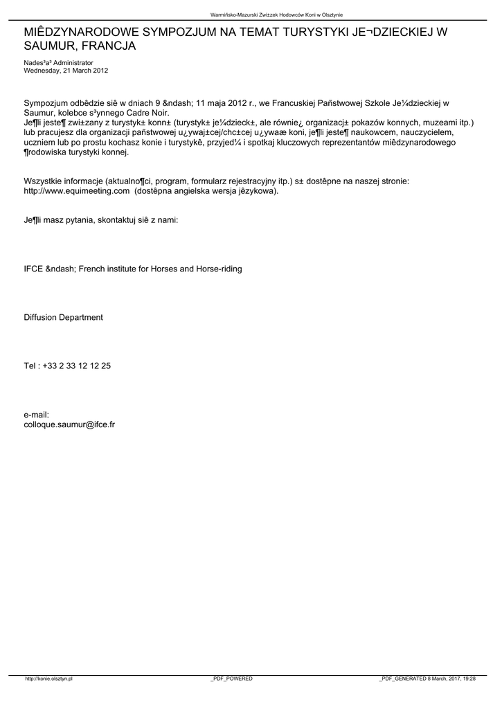 Warmiñsko-Mazurski Zwi±zek Hodowców Koni w Olsztynie MIÊDZYNARODOWE SYMPOZJUM NA TEMAT TURYSTYKI JE¬DZIECKIEJ W SAUMUR, FRANCJA Nades³a³ Administrator Wednesday, 21 March 2012 Sympozjum odbêdzie siê w dniach 9 – 11 maja 2012 r., we Francuskiej Pañstwowej Szkole Je¼dzieckiej w Saumur, kolebce s³ynnego Cadre Noir. Je¶li jeste¶ zwi±zany z turystyk± konn± (turystyk± je¼dzieck±, ale równie¿ organizacj± pokazów konnych, muzeami itp.) lub pracujesz dla organizacji pañstwowej u¿ywaj±cej/chc±cej u¿ywaæ koni, je¶li jeste¶ naukowcem, nauczycielem, uczniem lub po prostu kochasz konie i turystykê, przyjed¼ i spotkaj kluczowych reprezentantów miêdzynarodowego ¶rodowiska turystyki konnej. Wszystkie informacje (aktualno¶ci, program, formularz rejestracyjny itp.) s± dostêpne na naszej stronie: http://www.equimeeting.com (dostêpna angielska wersja jêzykowa). Je¶li masz pytania, skontaktuj siê z nami: IFCE – French institute for Horses and Horse-riding Diffusion Department Tel : +33 2 33 12 12 25 e-mail: [email protected] http://konie.olsztyn.pl _PDF_POWERED _PDF_GENERATED 8 March, 2017, 19:28