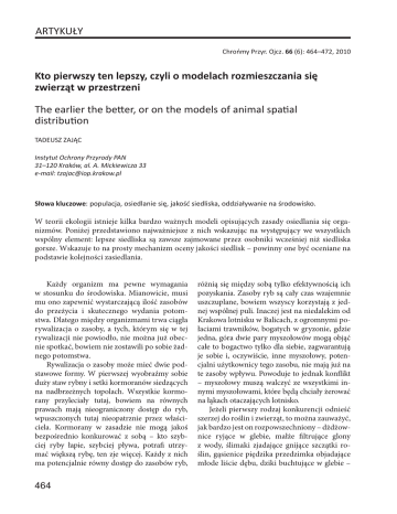 ARTYKUŁY Chrońmy Przyr. Ojcz. 66 (6): 464–472, 2010 Kto pierwszy ten lepszy, czyli o modelach rozmieszczania się zwierząt w przestrzeni The earlier the be�er, or on the models of animal spa�al distribu�on TADEUSZ ZAJĄC Instytut Ochrony Przyrody PAN 31–120 Kraków, al. A. Mickiewicza 33 e-mail: [email protected] Słowa kluczowe: populacja, osiedlanie się, jakość siedliska, oddziaływanie na środowisko. W teorii ekologii istnieje kilka bardzo ważnych modeli opisujących zasady osiedlania się organizmów. Poniżej przedstawiono najważniejsze z nich wskazując na występujący we wszystkich wspólny element: lepsze siedliska są zawsze zajmowane przez osobniki wcześniej niż siedliska gorsze. Wskazuje to na prosty mechanizm oceny jakości siedlisk – powinny one być oceniane na podstawie kolejności zasiedlania. Każdy organizm ma pewne wymagania w stosunku do środowiska. Mianowicie, musi mu ono zapewnić wystarczającą ilość zasobów do przeżycia i skutecznego wydania potomstwa. Dlatego między organizmami trwa ciągła rywalizacja o zasoby, a tych, którym się w tej rywalizacji nie powiodło, nie można już obecnie spotkać, bowiem nie zostawili po sobie żadnego potomstwa. Rywalizacja o zasoby może mieć dwie podstawowe formy. W pierwszej wyobraźmy sobie duży staw rybny i setki kormoranów siedzących na nadbrzeżnych topolach. Wszystkie kormorany przyleciały tutaj, bowiem na równych prawach mają nieograniczony dostęp do ryb, wpuszczonych tutaj nieopatrznie przez właściciela. Kormorany w zasadzie nie mogą jakoś bezpośrednio konkurować z sobą – kto szybciej ryby łapie, szybciej pływa, potrafi utrzymać większą rybę, ten zje więcej. Każdy z nich ma potencjalnie równy dostęp do zasobów ryb, 464 różnią się między sobą tylko efektywnością ich pozyskania. Zasoby ryb są cały czas wzajemnie uszczuplane, bowiem wszyscy korzystają z jednej wspólnej puli. Inaczej jest na niedalekim od Krakowa lotnisku w Balicach, z ogromnymi połaciami trawników, bogatych w gryzonie, gdzie jedna, góra dwie pary myszołowów mogą objąć całe to bogactwo tylko dla siebie, zagwarantują je sobie i, oczywiście, inne myszołowy, potencjalni użytkownicy tego zasobu, nie mają już na te zasoby wpływu. Powoduje to jednak konflikt – myszołowy muszą walczyć ze wszystkimi innymi myszołowami, które będą chciały żerować na łąkach otaczających lotnisko. Jeżeli pierwszy rodzaj konkurencji odnieść szerzej do roślin i zwierząt, to można zauważyć, jak bardzo jest on rozpowszechniony – dżdżownice ryjące w glebie, małże filtrujące glony z wody, ślimaki zjadające gnijące szczątki roślin, gąsienice piędzika przedzimka objadające młode liście dębu, dziki buchtujące w glebie – T. Zając – wszystkie te organizmy konkurują z sobą, kto szybciej i lepiej zje. Angielski biolog Nicholson (1954) określił tę rywalizację jako konkurencję przez rozchwytywanie (ang. scramble competition). Drugi rodzaj konkurencji, w którym każdy zabiera porcję zasobów na wyłączność, rezerwuje sobie jakieś zasoby tylko dla siebie, dochodzi do sytuacji konfliktowych, według nomenklatury Nicholsona (1954) to konkurencja przez zatarg (ang. contest competition). Tutaj mamy całą gamę organizmów potrafiących dominować: para osobników dominujących w watasze wilków rezerwująca sobie priorytetowy dostęp do upolowanej zdobyczy, kapitalny byk izolujący swoją chmarę łań od innych byków czy jako klasyczny przykład – terytorialne ptaki, które wyłączają pewną przestrzeń tylko dla siebie i swojego potomstwa. By się przekonać, na czym polega konkurencja przez rozchwytywanie i przez zatarg wystarczy rzucić kawałek chleba kaczkom w zimie. Jeżeli ten sam kawałek chleba rzucimy pokrojony w drobną kosteczkę, kaczki wyjedzą go w spokoju, jeżeli rzucimy im jeden kawałek w całości – rozgorzeje gwałtowna bitwa, bowiem każda z kaczek będzie chciała przejąć cały kawałek tylko dla siebie. Wyobraźmy sobie teraz osobnika, który pragnie gdzieś się osiedlić, mniej lub bardziej na stałe, i musi podjąć decyzję, gdzie zostać, by eksploatować środowisko na potrzeby swojego przeżycia i wydania potomstwa. Nie bardzo wiemy jak wygląda sam proces osiedlania się organizmów, jakie rządzą nim reguły, bardzo trudno się ten okres w życiu osobnika bada. A jest to zagadnienie niezmiernie ważne z punktu widzenia ochrony przyrody, bowiem coraz częściej decyzja o osiedlaniu się przedstawicieli tych najciekawszych gatunków jest w wielu miejscach Polski negatywna, a my nie wiemy dlaczego. Ponadto jest mnóstwo przybyszów z obcych krajów, bardzo niepożądanych, którym ewidentnie się w Polsce podoba; a powodują niepowetowane szkody w naszej przyrodzie. Nasza ojczyzna rozwija się niezwykle dynamicznie, ale jest to proces dla przyrody dość niebezpieczny. Wiele decyzji dotyczących zagospodarowania Modele rozmieszczania się zwierząt w przestrzeni przestrzeni musi być podejmowanych niemal natychmiast, podczas gdy mają one ogromny wpływ na funkcjonowanie chronionych gatunków i siedlisk. Aby nie popełniać błędów rzutujących przecież na setki lat (np. budowa autostrady), trzeba obowiązkowo znać zasady rządzące rozmieszczaniem się zwierząt w przestrzeni. De facto podstawowy mechanizm został zaproponowany już w latach 50. przez dwóch niderlandzkich badaczy H.N. Kluyvera i L. Tinbergena (1953). Zajmowali się oni liczebnością sikor w różnych rodzajach lasów. Wykazali, że las mieszany, niewątpliwie bogatszy w pokarm i miejsca gniazdowe, charakteryzuje się liczną i bardzo stabilną populacją sikor, niezależnie od liczebności całkowitej ich populacji. Natomiast w lesie sosnowym populacja sikor była zawsze mniej liczna i podlegała większym rocznym zmianom liczebności. Ten dość skromny jak na dzisiejsze standardy materiał Kluyver i Tinbergen zinterpretowali następująco: 