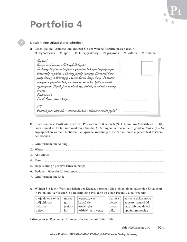 P4 Portfolio 4 Dossier: eine Urlaubskarte schreiben a Lesen Sie die Postkarte und kreuzen Sie an: Welche Begriffe passen dazu? y wypoczynek y sport y kurs językowy y przyroda y kultura Kochani! Gorące pozdrowienia z Ustrzyk Dolnych! Jesteśmy tutaj na wakacjach w gospodarstwie agroturystycznym. Bieszczady są piękne. Zbieramy jagody i grzyby, Basia robi kurs jazdy konnej, a dziewczyny chętnie karmią kozy i kury. Ja czasem pomagam w gospodarstwie, a czasem nic nie robię, tylko po prostu wypoczywam. Pogoda jest bardzo ładna. Szkoda, że wkrótce musimy wracać. Pozdrowienia Rafał, Basia, Ania i Kinga P.S. Jedzenie jest wspaniałe – domowa kuchnia i codziennie świeże jajka! y rodzina ......................................... ......................................... ......................................... b Lesen Sie diese Postkarte sowie die Postkarten im Kursbuch (S. 114) und im Arbeitsbuch (S. 84) noch einmal im Detail und markieren Sie die Äußerungen, in denen die folgenden Punkte (1 – 6) angesprochen werden. Notieren Sie typische Wendungen, die Sie in Ihrem eigenen Text verwenden können. 1. Grußformeln am Anfang: ..................................................................................................................................................... 2. Wetter: ........................................................................................................................................................................................... 3. Aktivitäten: ................................................................................................................................................................................. 4. Essen: ............................................................................................................................................................................................ 5. Begeisterung / positive Einschätzung: ........................................................................................................................... 6. Bedauern über das Urlaubsende: ...................................................................................................................................... 7. Grußformeln am Ende: ......................................................................................................................................................... c Wählen Sie je ein Wort aus jedem der Kästen, versetzen Sie sich an einen passenden Urlaubsort in Polen und verfassen Sie daraufhin eine Postkarte an einen Freund / eine Freundin. moja dziewczyna mój chłopak rodzina dzieci morze góry jeziora las wypoczywać kąpać się łowić ryby jeździć na rowerze walizka plecak rower piłka zatrucie pokarmowe zepsuty samochód przeziębione dzieci opóźniony pociąg Lösungsvorschläge zu den Übungen finden Sie auf Seite 137b. dziewięćdziesiąt dwa Witam! Portfolio, ISBN 978–3–19–055369–3, © 2009 Hueber Verlag, Ismaning 92 a Lernstrategien: Worauf will ich mich beim Lernen konzentrieren? Auch in einem organisierten Sprachkurs hat jeder Lerner andere Stärken oder Schwachstellen, jeder lernt mit anderen Zielen und unterschiedlich viel Zeit. Deshalb macht es Sinn, den eigenen Lernprozess ein Stück weit selbst in die Hand zu nehmen. Wie finden Sie heraus, was für Sie besonders wichtig ist? Kreuzen Sie an. y Ich benutze ein Sprachenportfolio, in dem ich meine Ziele und Fortschritte beim Lernen dokumentiere. y Ich schreibe immer wieder eigene kleine Texte zu interessanten Themen und bitte meine/n Kursleiter/in, diese zu verbessern. y Ich mache mir eine Liste mit Grammatikproblemen, bei denen ich mir immer unsicher bin; diese Fragen kann ich dann gezielt nachschlagen oder wiederholen. y Ich führe mein ganz persönliches Vokabelheft, in dem ich mir eine Auswahl aus dem Lernwortschatz und zusätzliche, für mich wichtige Wörter notiere. y Ich frage meine/n Kursleiter/in, was ich besonders trainieren soll. Haben Sie andere Vorschläge? Tauschen Sie sich mit den anderen im Kurs darüber aus, wie Sie Ihr Lernen selbst organisieren. ☺ ✔ Resümee nach den Lektionen 10 – 12 Ich kann jetzt … Kursbuch … Körperteile benennen und Beschwerden beschreiben. L10: Ü1, 3, 5 … Ratschläge geben. L10: Ü3 … etwas vergleichen. L10: Ü1, 2 … eine Fahrkarte kaufen. L11: Ü3 … die Zahlen ab 101. L11: Ü5 … mit dem Auto unterwegs zurechtkommen. L11: Ü4 … über Urlaubsaktivitäten sprechen. L12: Ü1, 3, 4 … Sehenswürdigkeiten beschreiben. L12: Ü2 … über Erlebtes berichten. L12: Ü4 … eine Postkarte schreiben. L12: Ü3 Außerdem habe ich gelernt: ............................................................................................................................................................................................................. ............................................................................................................................................................................................................. 92 b dziewięćdziesiąt dwa Witam! Portfolio, ISBN 978–3–19–055369–3, © 2009 Hueber Verlag, Ismaning