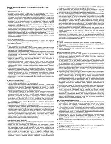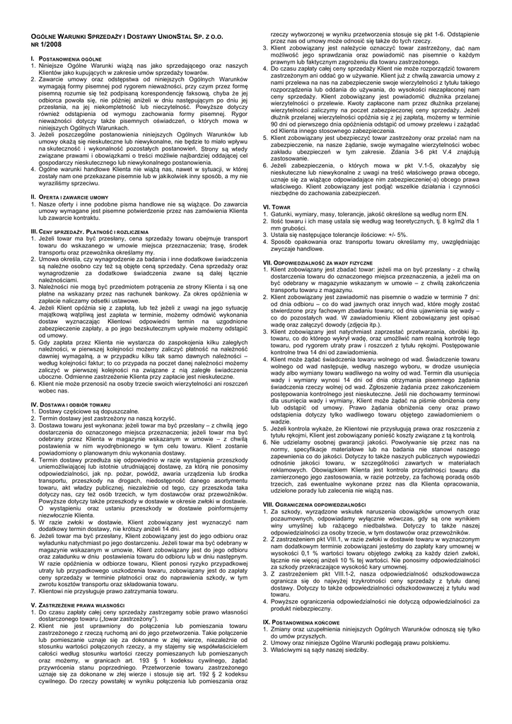OGÓLNE WARUNKI SPRZEDAY I DOSTAWY UNIONSTAL SP. Z O.O. NR 1/2008 I. POSTANOWIENIA OGÓLNE 1. Niniejsze Ogólne Warunki wi nas jako sprzedajcego oraz naszych Klientów jako kupujcych w zakresie umów sprzeday towarów. 2. Zawarcie umowy oraz odstpstwa od niniejszych Ogólnych Warunków wymagaj formy pisemnej pod rygorem niewanoci, przy czym przez form pisemn rozumie si te podpisan korespondencj faksow, chyba e jej odbiorca powoa si, nie póniej anieli w dniu nastpujcym po dniu jej przesania, na jej niekompletno lub nieczytelno. Powysze dotyczy równie odstpienia od wymogu zachowania formy pisemnej. Rygor niewanoci dotyczy take pisemnych owiadcze, o których mowa w niniejszych Ogólnych Warunkach. 3. Jeeli poszczególne postanowienia niniejszych Ogólnych Warunków lub umowy oka si nieskuteczne lub niewykonalne, nie bdzie to miao wpywu na skuteczno i wykonalno pozostaych postanowie. Strony s wtedy zwizane prawami i obowizkami o treci moliwie najbardziej oddajcej cel gospodarczy nieskutecznego lub niewykonalnego postanowienia. 4. Ogólne warunki handlowe Klienta nie wi nas, nawet w sytuacji, w której zostay nam one przekazane pisemnie lub w jakikolwiek inny sposób, a my nie wyrazilimy sprzeciwu. II. OFERTA I ZAWARCIE UMOWY 1. Nasze oferty i inne podobne pisma handlowe nie s wice. Do zawarcia umowy wymagane jest pisemne potwierdzenie przez nas zamówienia Klienta lub zawarcie kontraktu. III. CENY SPRZEDAY. PATNO I ROZLICZENIA 1. Jeeli towar ma by przesany, cena sprzeday towaru obejmuje transport towaru do wskazanego w umowie miejsca przeznaczenia; tras, rodek transportu oraz przewonika okrelamy my. 2. Umowa okrela, czy wynagrodzenie za badania i inne dodatkowe wiadczenia s nalene osobno czy te s objte cen sprzeday. Cena sprzeday oraz wynagrodzenie za dodatkowe wiadczenia zwane s dalej cznie nalenociami. 3. Nalenoci nie mog by przedmiotem potrcenia ze strony Klienta i s one patne na wskazany przez nas rachunek bankowy. Za okres opónienia w zapacie naliczamy odsetki ustawowe. 4. Jeeli Klient opónia si z zapat, lub te jeeli z uwagi na jego sytuacj majtkow wtpliw jest zapata w terminie, moemy odmówi wykonania dostaw wyznaczajc Klientowi odpowiedni termin na uzgodnione zabezpieczenie zapaty, a po jego bezskutecznym upywie moemy odstpi od umowy. 5. Gdy zapata przez Klienta nie wystarcza do zaspokojenia kilku zalegych nalenoci, w pierwszej kolejnoci moemy zaliczy patno na naleno dawniej wymagaln, a w przypadku kilku tak samo dawnych nalenoci – wedug kolejnoci faktur; to co przypada na poczet danej nalenoci moemy zaliczy w pierwszej kolejnoci na zwizane z ni zalege wiadczenia uboczne. Odmienne zastrzeenie Klienta przy zapacie jest nieskuteczne. 6. Klient nie moe przenosi na osoby trzecie swoich wierzytelnoci ani roszcze wobec nas. IV. D OSTAWA I ODBIÓR TOWARU 1. Dostawy czciowe s dopuszczalne. 2. Termin dostawy jest zastrzeony na nasz korzy. 3. Dostawa towaru jest wykonana: jeeli towar ma by przesany – z chwil jego dostarczenia do oznaczonego miejsca przeznaczenia; jeeli towar ma by odebrany przez Klienta w magazynie wskazanym w umowie – z chwil postawienia w nim wyodrbnionego w tym celu towaru. Klient zostanie powiadomiony o planowanym dniu wykonania dostawy. 4. Termin dostawy przedua si odpowiednio w razie wystpienia przeszkody uniemoliwiajcej lub istotnie utrudniajcej dostaw, za któr nie ponosimy odpowiedzialnoci, jak np. poar, powód, awaria urzdzenia lub rodka transportu, przeszkody na drogach, niedostpno danego asortymentu towaru, akt wadzy publicznej, niezalenie od tego, czy przeszkoda taka dotyczy nas, czy te osób trzecich, w tym dostawców oraz przewoników. Powysze dotyczy take przeszkody w dostawie w okresie zwoki w dostawie. O wystpieniu oraz ustaniu przeszkody w dostawie poinformujemy niezwocznie Klienta. 5. W razie zwoki w dostawie, Klient zobowizany jest wyznaczy nam dodatkowy termin dostawy, nie krótszy anieli 14 dni. 6. Jeeli towar ma by przesany, Klient zobowizany jest do jego odbioru oraz wyadunku natychmiast po jego dostarczeniu. Jeeli towar ma by odebrany w magazynie wskazanym w umowie, Klient zobowizany jest do jego odbioru oraz zaadunku w dniu postawienia towaru do odbioru lub w dniu nastpnym. W razie opónienia w odbiorze towaru, Klient ponosi ryzyko przypadkowej utraty lub przypadkowego uszkodzenia towaru, zobowizany jest do zapaty ceny sprzeday w terminie patnoci oraz do naprawienia szkody, w tym zwrotu kosztów transportu oraz skadowania towaru. 7. Klientowi nie przysuguje prawo zatrzymania towaru. V. ZASTRZEENIE PRAWA WASNO CI 1. Do czasu zapaty caej ceny sprzeday zastrzegamy sobie prawo wasnoci dostarczonego towaru („towar zastrzeony”). 2. Klient nie jest uprawniony do poczenia lub pomieszania towaru zastrzeonego z rzecz ruchom ani do jego przetworzenia. Takie poczenie lub pomieszanie uznaje si za dokonane w zej wierze, niezalenie od stosunku wartoci poczonych rzeczy, a my stajemy si wspówacicielem caoci wedug stosunku wartoci rzeczy pomieszanych lub pomieszanych oraz moemy, w granicach art. 193 § 1 kodeksu cywilnego, da przywrócenia stanu poprzedniego. Przetworzenie towaru zastrzeonego uznaje si za dokonane w zej wierze i stosuje si art. 192 § 2 kodeksu cywilnego. Do rzeczy powstaej w wyniku poczenia lub pomieszania oraz 3. 4. 5. 6. rzeczy wytworzonej w wyniku przetworzenia stosuje si pkt 1-6. Odstpienie przez nas od umowy moe odnosi si take do tych rzeczy. Klient zobowizany jest naleycie oznaczy towar zastrzeony, da nam moliwo jego sprawdzania oraz powiadomi nas pisemnie o kadym prawnym lub faktycznym zagroeniu dla towaru zastrzeonego. Do czasu zapaty caej ceny sprzeday Klient nie moe rozporzdzi towarem zastrzeonym ani odda go w uywanie. Klient ju z chwil zawarcia umowy z nami przelewa na nas na zabezpieczenie swoje wierzytelnoci z tytuu takiego rozporzdzenia lub oddania do uywania, do wysokoci niezapaconej nam ceny sprzeday. Klient zobowizany jest powiadomi dunika przelanej wierzytelnoci o przelewie. Kwoty zapacone nam przez dunika przelanej wi