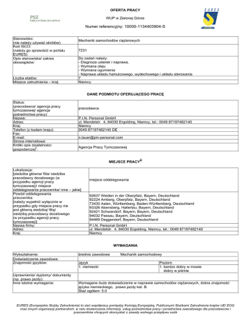 OFERTA PRACY WUP w Zielonej Górze Numer referencyjny: 10000-1134403904-S Stanowisko: (nie należy używać skrótów) Kod ISCO: (należy go sprawdzić w portalu EURES) Opis stanowiska/ zakres obowiązków: Liczba etatów: Miejsce zatrudnienia – kraj: Mechanik samochodów ciężarowych 7231 Do zadań należy: - Diagnoza usterek i naprawa, - Wymiana oleju - Wymiana ogumienia - Naprawa układu hamulcowego, wydechowego i układu sterowania 7 Niemcy DANE PODMIOTU OFERUJĄCEGO PRACĘ Status: (pracodawca/ agencja pracy tymczasowej/ agencja pośrednictwa pracy) Nazwa: Adres: Kraj: Telefon (z kodem kraju): Fax: E-mail: Strona internetowa: Krótki opis działalności gospodarczeji: pracodawca P.I.N. Personal GmbH ul. Mendelstr. 4, 84030 Ergolding, Niemcy, tel.: 0049 87197482140 Niemcy 0049 87197482140 DE [email protected] Agencja Pracy Tymczasowej MIEJSCE PRACYii Lokalizacja: [siedziba główna/ filia/ siedziba pracodawcy docelowego (w przypadku agencji pracy tymczasowej)/ miejsce oddelegowania pracownika/ inne – jakie] Powód oddelegowania pracownika: [należy wypełnić wyłącznie w przypadku gdy miejsce pracy nie jest główną siedzibą/ filią/ siedzibą pracodawcy docelowego (w przypadku agencji pracy tymczasowej)] Nazwa firmy: Adres: Kraj: miejsce oddelegowania 92637 Weiden in der Oberpfalz, Bayern, Deutschland 92224 Amberg, Oberpfalz, Bayern, Deutschland 73430 Aalen, Württemberg, Baden-Württemberg, Deutschland 93326 Abensberg, Hallertau, Bayern, Deutschland 92421 Schwandorf, Bayern, Bayern, Deutschland 94032 Passau, Bayern, Deutschland 94469 Deggendorf, Bayern, Deutschland P.I.N. Personal GmbH ul. Mendelstr. 4, 84030 Ergolding, Niemcy, tel.: 0049 87197482140 Niemcy WYMAGANIA Wykształcenie: Doświadczenie zawodowe: Znajomość języków: Uprawnienia/ dyplomy/ dokumenty (np. prawo jazdy): Inne istotne wymagania: średnie zawodowe Język 1. niemiecki Mechanik samochodowy Poziom 1. bardzo dobry w mowie dobry w piśmie Wymagane duże doświadczenie w naprawie samochodów ciężarowych, dobra znajomość języka niemieckiego, prawo jazdy kat. B. Staż ogółem: 5.0 EURES (Europejskie Służby Zatrudnienia) to sieć współpracy pomiędzy Komisją Europejską, Publicznymi Służbami Zatrudnienia krajów UE/ EOG oraz innych organizacji partnerskich, w celu dostarczania informacji, usług pośrednictwa pracy i poradnictwa zawodowego dla pracodawców i pracowników chcących skorzystać z zasady wolnego przepływu osób WYNAGRODZENIE I WARUNKI ZATRUDNIENIA Wysokość pensji brutto: Wysokość pensji netto: Waluta, w jakiej wypłacana jest pensja: Rodzaj stawki wynagrodzenia: (godzinowa/ tygodniowa/ miesięczna/ roczna/ inna) Premie: Dodatkowe świadczenia (zakwaterowanie, wyżywienie, koszty związane ze zmianą miejsca zamieszkania, koszty podróży itp.): Nazwa firmy, z którą zostanie podpisana umowa: Rodzaj umowy: (umowa o pracę, umowa zlecenia, wolontariat, praktyka zawodowa/ staż, praca zdalna, agencja pracy tymczasowej, inne): Wymiar czasu pracy (praca na pełen etat/ część etatu): Czas trwania umowy: (nieokreślony/ określony) 8,80 Liczba godzin tygodniowo: Zmiany i praca w dni wolne: 40,00 Pracodawca pomaga w znalezieniu zakwaterowania oraz w załatwieniu wszystkich formalności urzędowych. Wynagrodzenie podlega negocjacjom i jest zgodne z układem zbiorowym BAP. 2015-11-16 Pracodawca pomaga w znalezieniu zakwaterowania oraz w załatwieniu wszystkich formalności urzędowych. Wynagrodzenie podlega negocjacjom i jest zgodne z układem zbiorowym BAP. Data rozpoczęcia: Inne informacje: Euro Czasowy ze stawką godzinową tak Pracodawca pomaga w znalezieniu zakwaterowania oraz w załatwieniu wszystkich formalności urzędowych. Wynagrodzenie podlega negocjacjom i jest zgodne z układem zbiorowym BAP. P.I.N. Personal GmbH umowa o pracę pełny etat nieokreślony Data wygaśnięcia umowy (w przypadku umowy na czas określony): SPOSÓB SKŁADANIA WNIOSKU Wymagane dokumenty (list motywacyjny, CV itp.): Język, w którym muszą być sporządzone przedkładane dokumenty: Do kogo należy wysłać dokumenty: (do pracodawcy/ doradcy EURES) Gdzie należy wysłać dokumenty: (adres, adres e-mail, nr faksu z kodem kraju itp.) Dane teleadresowe doradcy EURES lub przedstawiciela pracodawcy: (nazwisko, adres, telefon, fax, e-mail itp.) Życiorys w języku niemieckim należy przesłać do pracodawcy na adres [email protected] podając w tytule wiadomości nazwę stanowiska pracy :" Mechanik samochodowy-EuresPL". niemiecki do pracodawcy Życiorys w języku niemieckim należy przesłać do pracodawcy na adres [email protected] podając w tytule wiadomości nazwę stanowiska pracy :" Mechanik samochodowy-EuresPL". Życiorys w języku niemieckim należy przesłać do pracodawcy na adres [email protected] podając w tytule wiadomości nazwę stanowiska pracy :" Mechanik samochodowy-EuresPL". DODATKOWE INFORMACJE WAŻNOŚĆ 2015-11-13 Data publikacji: Termin przedkładania podań o pracę / zakończenia ważności oferty: Uprzejmie informujemy, że skontaktujemy się wyłącznie z wybranymi kandydatami. UWAGA: 1. Umowa z zagranicznym pracodawcą jest zawierana, co do zasady, zgodnie z prawem kraju zatrudnienia. Oznacza to, że wszystkie roszczenia odnośnie warunków, które obejmuje umowa, można kierować wyłącznie do odpowiedniego sądu w kraju zatrudnienia. Publiczne służby zatrudnienia (EURES) nie mogą pośredniczyć ani reprezentować pracownika w sądzie kraju zatrudnienia w przypadku sporu z pracodawcą. 2. Publiczne służby zatrudnienia (EURES) dokładają wszelkich starań, aby zapewnić rzetelność i wiarygodność ofert pracy zgłoszonych w lokalnym urzędzie pracy. Należy wyjaśnić, że oferta pracy została zgłoszona przez stronę trzecią i EURES nie EURES (Europejskie Służby Zatrudnienia) to sieć współpracy pomiędzy Komisją Europejską, Publicznymi Służbami Zatrudnienia krajów UE/ EOG oraz innych organizacji partnerskich, w celu dostarczania informacji, usług po