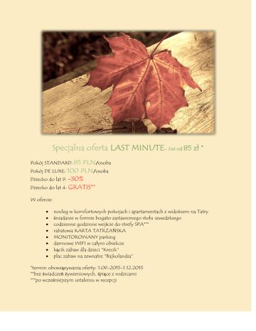 Specjalna oferta LAST MINUTE- Już od 85 zł * Pokój STANDARD: 85 PLN/osoba Pokój DE LUXE: 100 PLN/osoba Dziecko do lat 9: -30% Dziecko do lat 4: GRATIS** W ofercie: nocleg w komfortowych pokojach i apartamentach z widokiem na Tatry śniadanie w formie bogato zastawionego stołu szwedzkiego codzienne godzinne wejście do strefy SPA*** rabatowa KARTA TATRZAŃSKA MONITOROWANY parking darmowe WIFI w całym obiekcie kącik zabaw dla dzieci "Krecik" plac zabaw na zewnatrz "Bajkolandia" *termin obowiązywania oferty: 1.09-2015-1.12.2015 **bez świadczeń żywieniowych, śpiące z rodzicami ***po wcześniejszym ustaleniu w recepcji