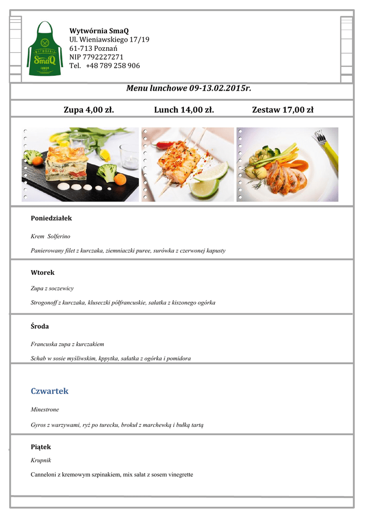 Wytwórnia SmaQ Ul. Wieniawskiego 17/19 61-713 Poznań NIP 7792227271 Tel. +48 789 258 906 Menu lunchowe 09-13.02.2015r. Zupa 4,00 zł. Lunch 14,00 zł. Poniedziałek Krem Solferino Panierowany filet z kurczaka, ziemniaczki puree, surówka z czerwonej kapusty Wtorek Zupa z soczewicy Strogonoff z kurczaka, kluseczki półfrancuskie, sałatka z kiszonego ogórka Środa Francuska zupa z kurczakiem Schab w sosie myśliwskim, kppytka, sałatka z ogórka i pomidora Czwartek Minestrone Gyros z warzywami, ryż po turecku, brokuł z marchewką i bułką tartą Piątek Krupnik Canneloni z kremowym szpinakiem, mix sałat z sosem vinegrette Zestaw 17,00 zł