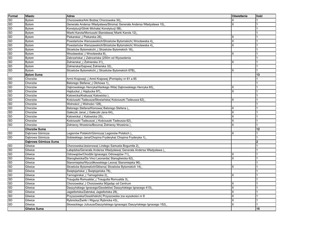 Format SD SD SD SD SD SD SD SD SD SD SD SD SD SD SD SD SD SD SD SD SD SD SD SD SD SD SD SD SD SD SD SD SD SD SD SD SD SD SD SD SD SD Miasto Bytom Bytom Bytom Bytom Bytom Bytom Bytom Bytom Bytom Bytom Bytom Bytom Bytom Bytom Suma Chorzów Chorzów Chorzów Chorzów Chorzów Chorzów Chorzów Chorzów Chorzów Chorzów Chorzów Chorzów Chorzów Suma Dąbrowa Górnicza Dąbrowa Górnicza Dąbrowa Górnicza Suma Gliwice Gliwice Gliwice Gliwice Gliwice Gliwice Gliwice Gliwice Gliwice Gliwice Gliwice Gliwice Gliwice Gliwice Gliwice Gliwice Suma Adres Chorzowska/Arki Bożka( Chorzowska 30)_ Generała Andersa Władysława/Stroma( Generała Andersa Władysława 15)_ Konstytucji/Glinki Michała( Konstytucji 5B)_ Miarki Karola/Moniuszki Stanisława( Miarki Karola 12)_ Piekarska/_( Piekarska 26)_ Powstańców Warszawskich/Strzelców Bytomskich( Wrocławska 4)_ Powstańców Warszawskich/Strzelców Bytomskich( Wrocławska 4)_ Strzelców Bytomskich/_( Strzelców Bytomskich 16)_ Wrocławska/_( Wrocławska 8)_ Zabrzańska/_( Zabrzańska )250m od Wyzwolenia Żołnierska/_( Żołnierska 31)_ Żołnierska/Gajowa( Żołnierska 32)_ Strzelców Bytomskich/_( Strzelców Bytomskich 87B)_ Armii Krajowej/_( Armii Krajowej )Pomiędzy nr 81 a 85 Batorego Stefana/_( Olchowa 1)_ Dąbrowskiego Henryka/Hankego Wita( Dąbrowskiego Henryka 65)_ Hajducka/_( Hajducka 97)_ Katowicka/Krakusa( Katowicka )_ Kościuszki Tadeusza/Słowiańska( Kościuszki Tadeusza 62)_ Wolności/_( Wolności 128)_ Batorego Stefana/Klonowa( Batorego Stefana )_ Gałeczki Jana/_( Gałeczki Jana 64)_ Katowicka/_( Katowicka 25)_ Kościuszki Tadeusza/_( Kościuszki Tadeusza 62)_ Żołnierzy Września/Boczna( Żołnierzy Września )_ Legionów Polskich/Górnicza( Legionów Polskich )_ Sobieskiego Jana/Chopina Fryderyka( Chopina Fryderyka 1)_ Chorzowska/Jesionowa( Lindego Samuela Bogumiła 2)_ Łabędzka/Generała Andersa Władysława( Generała Andersa Władysława )_ Odrowążów/Chodźki Ignacego( Odrowążów 71)_ Starogliwicka/Da Vinci Leonarda( Starogliwicka 62)_ Staromiejska/Wyczółkowskiego Leona( Staromiejska 96)_ Strzelców Bytomskich/Główna( Strzelców Bytomskich 14)_ Świętojańska/_( Świętojańska 78)_ Tarnogórska/_( Tarnogórska 2)_ Traugutta Romualda/_( Traugutta Romualda 3)_ Chorzowska/_( Chorzowska 56)jadąc od Centrum Daszyńskiego Ignacego/Geodetów( Daszyńskiego Ignacego 413)_ Jagiellońska/Zabrska( Jagiellońska 28)_ Przyszowska/Ossolińskich( Przyszowska )na wysokości nr 8 Rybnicka/Żwirki i Wigury( Rybnicka 43)_ Słowackiego Juliusza/Daszyńskiego Ignacego( Daszyńskiego Ignacego 152)_ Oświetlenie X X X X X X X X X X X X X X X X X X X X X X X X X X X Ilość 1 1 1 1 1 1 1 1 1 1 1 1 1 13 1 1 1 1 1 1 1 1 1 1 1 1 12 1 1 2 1 1 1 1 1 1 1 1 1 1 1 1 1 1 1 15 Format SD SD SD SD SD SD SD SD SD SD SD SD SD SD SD SD SD SD SD SD SD SD SD SD SD SD SD SD SD SD SD SD SD SD SD SD SD SD SD SD SD SD SD SD SD Miasto Katowice Katowice Katowice Katowice Katowice Katowice Katowice Katowice Katowice Katowice Katowice Katowice Katowice Katowice Katowice Katowice Katowice Katowice Katowice Katowice Katowice Katowice Katowice Katowice Katowice Katowice Katowice Katowice Katowice Katowice Katowice Katowice Katowice Katowice Suma Kraków Kraków Kraków Kraków Kraków Kraków Kraków Kraków Kraków Kraków Kraków Kraków Adres 1-go Maja/Marcinkowskiego Karola( 1-go Maja 131)_ Armii Krajowej/_( Armii Krajowej 145)_ Armii Krajowej/_( Armii Krajowej 316)_ Ceglana/_( Ceglana 67)_ Chorzowska/_( Piastów 3)_ Generała Jankego Zygmunta Waltera/Darwina Karola( Generała Jankego Zygmunta Waltera 217)_ Gliwicka/_( Gliwicka 90)_ Jordana Henryka/Kościuszki Tadeusza( Jordana Henryka 25)_ Józefowska/_( Józefowska 111)_ Kłodnicka/Kiepury Jana( Kłodnicka 22)_ Kościuszki Tadeusza/Brynowska( Kościuszki Tadeusza 186)_ Krucza/Mała( Krucza 52)_ Ligocka/Wilcze Kąty( Ligocka )_ Mikołowska/_( Mikołowska 131)_ Mysłowicka/_( Mysłowicka 15)_ Obrońców Westerplatte/_( Obrońców Westerplatte 75)_ Panewnicka/Partyzantów( Panewnicka 319)_ Sokolska/_( Sokolska 17)_ Strzelców Bytomskich/_( Strzelców Bytomskich )230m za skrzyż z ul.Grzegorzka Szarych Szeregów/_( Szarych Szeregów 26)_ Uniczowska/Hortensji( Uniczowska 85)_ Warszawska/Wodna( Warszawska 32)_ Wiosny Ludów/_( Wiosny Ludów 63)_ Wróblewskiego Walerego/Wrocławska( Wróblewskiego Walerego )_ Zamkowa/_( Zamkowa 33)_ Armii Krajowej/_( Stabika Karola 2)_ Dębowa/Wiejska( Wiejska 7)_ Generała Jankego Zygmunta Waltera/Żużlowa( Generała Jankego Zygmunta Waltera )na wys. nr 16; vis'a vis LECLRC Gliwicka/_( Gliwicka 71)_ Kościuszki Tadeusza/Małachowskiego Stanisława( Kościuszki Tadeusza )_ Oswobodzenia/_( Oswobodzenia )na wysokości nr 64 Strzelców Bytomskich/Pod Młynem( Strzelców Bytomskich 24)_ Szopienicka/Górniczego Dorobku( Szopienicka )_ Aleja 29-go Listopada/_( Aleja 29-go Listopada 57)_ Aleja 29-go Listopada/Powstańców( Aleja 29-go Listopada 130)_ Aleja Generała Bora-Komorowskiego Tadeusza/_( Aleja Jana Pawła II 39)_ Aleja Kijowska/_( Aleja Kijowska 34)_ Aleja Słowackiego Juliusza/_( Montelupich 4)_ Armii Krajowej/_( Lea Juliusza 244)_ Armii Krajowej/Zarzecze( Armii Krajowej 85)_ Centrum Handlowe 'Krokus'/_( Dobrego Pasterza 118)wjazd do marketu OBI Czyżewskiego Tytusa/Głowackiego Bartosza( Głowackiego Bartosza 58)_ Długa/Szlak( Długa 72)_ Generała Okulickiego Leopolda/Bohomolca Franciszka( Osiedle Oświecenia 30)_ Igołomska/_( Igołomska 82)_ Oświetlenie X X X X X X X X X X X X X X X X X X X X X Ilość 1 1 1 1 1 1 1 1 1 1 1 1 1 1 1 1 1 1 1 1 1 1 1 1 1 1 1 1 1 1 1 1 1 33 1 1 1 1 1 1 1 1 1 1 1 1 Format SD SD SD SD SD SD SD SD SD SD SD SD SD SD SD SD SD Miasto Kraków Kraków Kraków Kraków Kraków Kraków Kraków Kraków Kraków Kraków Kraków Kraków Kraków Kraków Kraków Kraków Kraków Adres Jugowicka/Armii Kraków( Jugowicka 7a)_ Kobierzyńska/Raciborska( Kobierzyńska 142)_ Kocmyrzowska/Darwina Karola( Darwina Karola 2)_ Konopnickiej Marii/Kalwaryjska( Rydlówka 8)