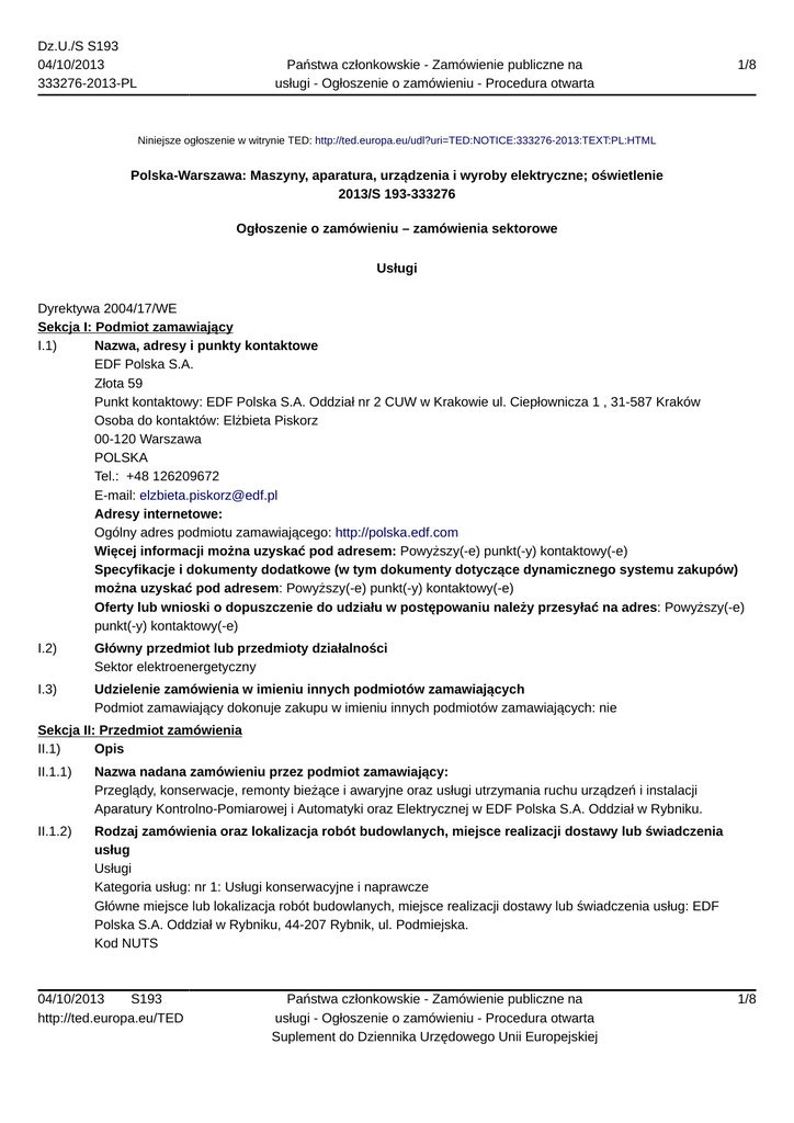 Dz.U./S S193 04/10/2013 333276-2013-PL Państwa członkowskie - Zamówienie publiczne na usługi - Ogłoszenie o zamówieniu - Procedura otwarta 1/8 Niniejsze ogłoszenie w witrynie TED: http://ted.europa.eu/udl?uri=TED:NOTICE:333276-2013:TEXT:PL:HTML Polska-Warszawa: Maszyny, aparatura, urządzenia i wyroby elektryczne; oświetlenie 2013/S 193-333276 Ogłoszenie o zamówieniu – zamówienia sektorowe Usługi Dyrektywa 2004/17/WE Sekcja I: Podmiot zamawiający I.1) Nazwa, adresy i punkty kontaktowe EDF Polska S.A. Złota 59 Punkt kontaktowy: EDF Polska S.A. Oddział nr 2 CUW w Krakowie ul. Ciepłownicza 1 , 31-587 Kraków Osoba do kontaktów: Elżbieta Piskorz 00-120 Warszawa POLSKA Tel.: +48 126209672 E-mail: [email protected] Adresy internetowe: Ogólny adres podmiotu zamawiającego: http://polska.edf.com Więcej informacji można uzyskać pod adresem: Powyższy(-e) punkt(-y) kontaktowy(-e) Specyfikacje i dokumenty dodatkowe (w tym dokumenty dotyczące dynamicznego systemu zakupów) można uzyskać pod adresem: Powyższy(-e) punkt(-y) kontaktowy(-e) Oferty lub wnioski o dopuszczenie do udziału w postępowaniu należy przesyłać na adres: Powyższy(-e) punkt(-y) kontaktowy(-e) I.2) Główny przedmiot lub przedmioty działalności Sektor elektroenergetyczny I.3) Udzielenie zamówienia w imieniu innych podmiotów zamawiających Podmiot zamawiający dokonuje zakupu w imieniu innych podmiotów zamawiających: nie Sekcja II: Przedmiot zamówienia II.1) Opis II.1.1) Nazwa nadana zamówieniu przez podmiot zamawiający: Przeglądy, konserwacje, remonty bieżące i awaryjne oraz usługi utrzymania ruchu urządzeń i instalacji Aparatury Kontrolno-Pomiarowej i Automatyki oraz Elektrycznej w EDF Polska S.A. Oddział w Rybniku. II.1.2) Rodzaj zamówienia oraz lokalizacja robót budowlanych, miejsce realizacji dostawy lub świadczenia usług Usługi Kategoria usług: nr 1: Usługi konserwacyjne i naprawcze Główne miejsce lub lokalizacja robót budowlanych, miejsce realizacji dostawy lub świadczenia usług: EDF Polska S.A. Oddział w Rybniku, 44-207 Rybnik, ul. Podmiejska. Kod NUTS 04/10/2013 S193 http://ted.europa.eu/TED Państwa członkowskie - Zamówienie publiczne na usługi - Ogłoszenie o zamówieniu - Procedura otwarta Suplement do Dziennika Urzędowego Unii Europejskiej 1/8 Dz.U./S S193 04/10/2013 333276-2013-PL Państwa członkowskie - Zamówienie publiczne na usługi - Ogłoszenie o zamówieniu - Procedura otwarta II.1.3) Informacje na temat zamówienia publicznego, umowy ramowej lub dynamicznego systemu zakupów (DSZ) Ogłoszenie dotyczy zamówienia publicznego II.1.4) Informacje na temat umowy ramowej II.1.5) Krótki opis zamówienia lub zakupu: Przeglądy, konserwacje, remonty bieżące i awaryjne oraz usługi utrzymania ruchu urządzeń i instalacji Aparatury Kontrolno-Pomiarowej i Automatyki oraz Elektrycznej w EDF Polska S.A. Oddział w Rybniku. II.1.6) Wspólny Słownik Zamówień (CPV) 31000000 II.1.7) Informacje na temat Porozumienia w sprawie zamówień rządowych (GPA) Zamówienie jest objęte Porozumieniem w sprawie zamówień rządowych (GPA): tak II.1.8) Informacje o częściach zamówienia To zamówienie podzielone jest na części: nie II.1.9) Informacje o ofertach wariantowych Dopuszcza się składanie ofert wariantowych: nie II.2) Wielkość lub zakres zamówienia II.2.1) Całkowita wielkość lub zakres: Przeglądy, konserwacje, remonty bieżące i awaryjne oraz usługi utrzymania ruchu urządzeń i instalacji Aparatury Kontrolno-Pomiarowej i Automatyki oraz Elektrycznej w EDF Polska S.A. Oddział w Rybniku. II.2.2) Informacje o opcjach Opcje: nie II.2.3) Informacje o wznowieniach Jest to zamówienie podlegające wznowieniu: nie II.3) Czas trwania zamówienia lub termin realizacji Rozpoczęcie 1.2.2014 Zakończenie 31.12.2016 2/8 Sekcja III: Informacje o charakterze prawnym, ekonomicznym, finansowym i technicznym III.1) Warunki dotyczące zamówienia III.1.1) Wymagane wadia i gwarancje: Wadium w wysokości 200 000 PLN. Zabezpieczenie należytego wykonania umowy 3 % wartości brutto przedmiotu umowy. III.1.2) Główne warunki finansowe i uzgodnienia płatnicze i/lub odniesienie do odpowiednich przepisów je regulujących: Płatne ze środków Zamawiającego. III.1.3) Forma prawna, jaką musi przyjąć grupa wykonawców, której zostanie udzielone zamówienie: Konsorcjum. III.1.4) Inne szczególne warunki: Wykonanie zamówienia podlega szczególnym warunkom: nie III.2) Warunki udziału III.2.1) Sytuacja podmiotowa wykonawców, w tym wymogi związane z wpisem do rejestru zawodowego lub handlowego 04/10/2013 S193 http://ted.europa.eu/TED Państwa członkowskie - Zamówienie publiczne na usługi - Ogłoszenie o zamówieniu - Procedura otwarta Suplement do Dziennika Urzędowego Unii Europejskiej 2/8 Dz.U./S S193 04/10/2013 333276-2013-PL Państwa członkowskie - Zamówienie publiczne na usługi - Ogłoszenie o zamówieniu - Procedura otwarta 3/8 Informacje i formalności konieczne do dokonania oceny spełniania wymogów: A/ Oświadczenie Wykonawcy o spełnieniu warunków określonych w ogłoszeniu o zamówieniu, na formularzu zgodnym z treścią załącznika nr 1 do Formularza oferty. B/ Oświadczenie o braku podstaw do wykluczenia z postępowania o udzielenie zamówienia z powodu okoliczności określonych na podstawie 30 ust. 1 Regulaminu, na formularzu zgodnym z treścią załącznika nr 2 do Formularza oferty. C/ Oświadczenie Wykonawcy o zapoznaniu się z treścią Regulaminu, a także z treścią regulaminu sądu polubownego stanowiącego załącznik nr 2 do Regulaminu, i o pełnej akceptacji treści obu ww. regulaminów i uznaniu ich za wiążące, a także, że wyraża zgodę na poddanie sądowi polubownemu rozstrzygnięcia wszelkich, ewentualnych sporów związanych z udzielaniem zamówień na podstawie Regulaminu, zgodnie z postanowieniami obu ww. regulaminów. Oświadczenie jest składane na formularzu zgodnym ze wzorem Załącznika nr 9 Formularza Ofertowego -
