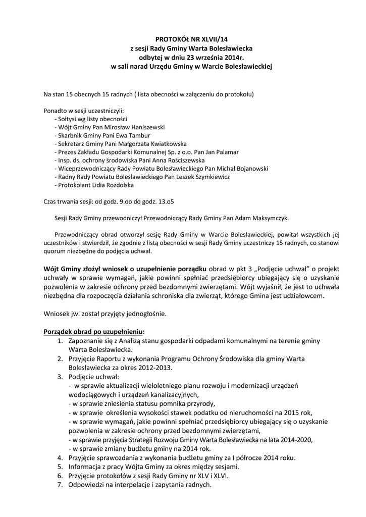 PROTOKÓŁ NR XLVII/14 z sesji Rady Gminy Warta Bolesławiecka odbytej w dniu 23 września 2014r. w sali narad Urzędu Gminy w Warcie Bolesławieckiej Na stan 15 obecnych 15 radnych ( lista obecności w załączeniu do protokołu) Ponadto w sesji uczestniczyli: - Sołtysi wg listy obecności - Wójt Gminy Pan Mirosław Haniszewski - Skarbnik Gminy Pani Ewa Tambur - Sekretarz Gminy Pani Małgorzata Kwiatkowska - Prezes Zakładu Gospodarki Komunalnej Sp. z o.o. Pan Jan Palamar - Insp. ds. ochrony środowiska Pani Anna Rościszewska - Wiceprzewodniczący Rady Powiatu Bolesławieckiego Pan Michał Bojanowski - Radny Rady Powiatu Bolesławieckiego Pan Leszek Szymkiewicz - Protokolant Lidia Rozdolska Czas trwania sesji: od godz. 9.oo do godz. 13.o5 Sesji Rady Gminy przewodniczył Przewodniczący Rady Gminy Pan Adam Maksymczyk. Przewodniczący obrad otworzył sesję Rady Gminy w Warcie Bolesławieckiej, powitał wszystkich jej uczestników i stwierdził, że zgodnie z listą obecności w sesji Rady Gminy uczestniczy 15 radnych, co stanowi quorum niezbędne do podjęcia uchwał. Wójt Gminy złożył wniosek o uzupełnienie porządku obrad w pkt 3 „Podjęcie uchwał” o projekt uchwały w sprawie wymagań, jakie powinni spełniać przedsiębiorcy ubiegający się o uzyskanie pozwolenia w zakresie ochrony przed bezdomnymi zwierzętami. Wójt wyjaśnił, że jest to uchwała niezbędna dla rozpoczęcia działania schroniska dla zwierząt, którego Gmina jest udziałowcem. Wniosek jw. został przyjęty jednogłośnie. Porządek obrad po uzupełnieniu: 1. Zapoznanie się z Analizą stanu gospodarki odpadami komunalnymi na terenie gminy Warta Bolesławiecka. 2. Przyjęcie Raportu z wykonania Programu Ochrony Środowiska dla gminy Warta Bolesławiecka za okres 2012-2013. 3. Podjęcie uchwał: - w sprawie aktualizacji wieloletniego planu rozwoju i modernizacji urządzeń wodociągowych i urządzeń kanalizacyjnych, - w sprawie zniesienia statusu pomnika przyrody, - w sprawie określenia wysokości stawek podatku od nieruchomości na 2015 rok, - w sprawie wymagań, jakie powinni spełniać przedsiębiorcy ubiegający się o uzyskanie pozwolenia w zakresie ochrony przed bezdomnymi zwierzętami, - w sprawie przyjęcia Strategii Rozwoju Gminy Warta Bolesławiecka na lata 2014-2020, - w sprawie zmiany budżetu gminy na 2014 rok. 4. Przyjęcie sprawozdania z wykonania budżetu gminy za I półrocze 2014 roku. 5. Informacja z pracy Wójta Gminy za okres między sesjami. 6. Przyjęcie protokołów z sesji Rady Gminy nr XLV i XLVI. 7. Odpowiedzi na interpelacje i zapytania radnych. 2 8. Wolne wnioski i sprawy różne. Porządek obrad jw. został przyjęty jednogłośnie. Przebieg sesji: Do pkt.1. Zapoznanie się z Analizą stanu gospodarki odpadami komunalnymi na terenie gminy Warta Bolesławiecka Wójt Gminy przedstawił Analizę stanu gospodarki odpadami komunalnymi na terenie gminy Warta Bolesławiecka. Wójt Gminy poinformował także, że w budynkach wielorodzinnych wielu mieszkańców nie rozumie jeszcze, że odpowiedzialność za prawidłową selektywną zbiórkę odpadów u źródła, za utrzymanie czystości na nieruchomości wspólnej spada na nich. Wójt poinformował, że ponownie na osiedlu w Szczytnicy dochodzi do takich sytuacji, że kubły do selektywnej zbiórki są puste a wokół nich nawrzucanych jest pełno odpadów, co wg oceny lokalnych dziennikarzy bolesławieckich jest to wina Spółki ZGK i Gminy, bo nieterminowo wywozi odpady. Wójt stwierdził, że nie można oczekiwać od pracowników ZGK, że pozbierają odpady luzem rzucone i wywiozą je na wysypisko. Takiej sytuacji Gmina nie może tolerować. Została zwrócona uwaga Zarządcy nieruchomości tj. CEWITAS i reakcja była dosyć szybka – odpady wywiózł ZGK a fakturę za posprzątanie boksu z odpadami. Wójt poinformował, że w dniu wczorajszym mieszkańcy tego osiedla, odpowiedzialni za czystość na swojej posesji, dziękowali Redakcji BolecInfo, że tak sprawnie i szybko postraszyła Spółkę ZGK, bo Spółka szybko posprzątała. Zdaniem Wójta nadal więc widać, że osoby odpowiedzialne tj. właściciele lokali mieszkalnych nie czują problemu zapisu ustawowego, bo to właściciel nieruchomości musi zadbać o swoją posesję, o swoje kubły. To, że Gmina zabezpiecza i wydzierżawia kubły, to nie znaczy, że ma jeszcze przy tych śmietnikach sprzątać. Wójt dodał, że w przypadku osiedla w Szczytnicy świadomość Zarządcy tego obowiązku jest prawidłowa ale pełnej świadomości i odpowiedzialności za gospodarkę odpadową nie mają jeszcze właściciele mieszkań. Wójt wyjaśnił, że w przypadku tego osiedla przed Gminą stoi zadanie uświadomienia mieszkańców co do ich odpowiedzialności za utrzymanie czystości na własnej nieruchomości. Pani Anna Rościszewska poinformowała, że Analiza stanu gospodarki odpadami jest standardowym dokumentem, jaki Gmina będzie analizowała każdego roku. Analiza mówi o kosztach i osiągnięciach Gminy odnośnie gospodarki odpadami komunalnymi Gminy. Pani Rościszewska m.in. stwierdziła, że wyniki selektywne zbiórki, jakie osiągnęła Gmina w roku 2013 zostały osiągnięte na wysokości wymaganych przez przepisy dla roku 2018. Pani Rościszewska dodała, że można być spokojnym o osiągane przez Gminę wyniki selektywnej zbiórki, które z roku na rok są coraz lepsze. Pani Rościszewska wyjaśniła, że instalacja ZGK jest praktycznie bez przerwy kontrolowana przez Wojewódzki Inspektorat Ochrony Środowiska i przez Urząd Marszałkowski więc dane ujmowane w sprawozdaniach są jak najbardziej rzetelne. Prezes Spółki ZGK Pan Jan Palamar potwierdził, że Zarządca osiedla w Szczytnicy Sp. CEWITAS zleciła ZGK posprzątanie boksów na odpady i terenu wokół boksu. Pan Prezes wyjaśnił, że 9 września br. zadzwonił do niego dziennikarz BolecInfo Pan Marczewski pytając o stan prawny, bo nie rozumiał dlaczego ZGK robi zdjęcia pustym kubłom na zaśmieco