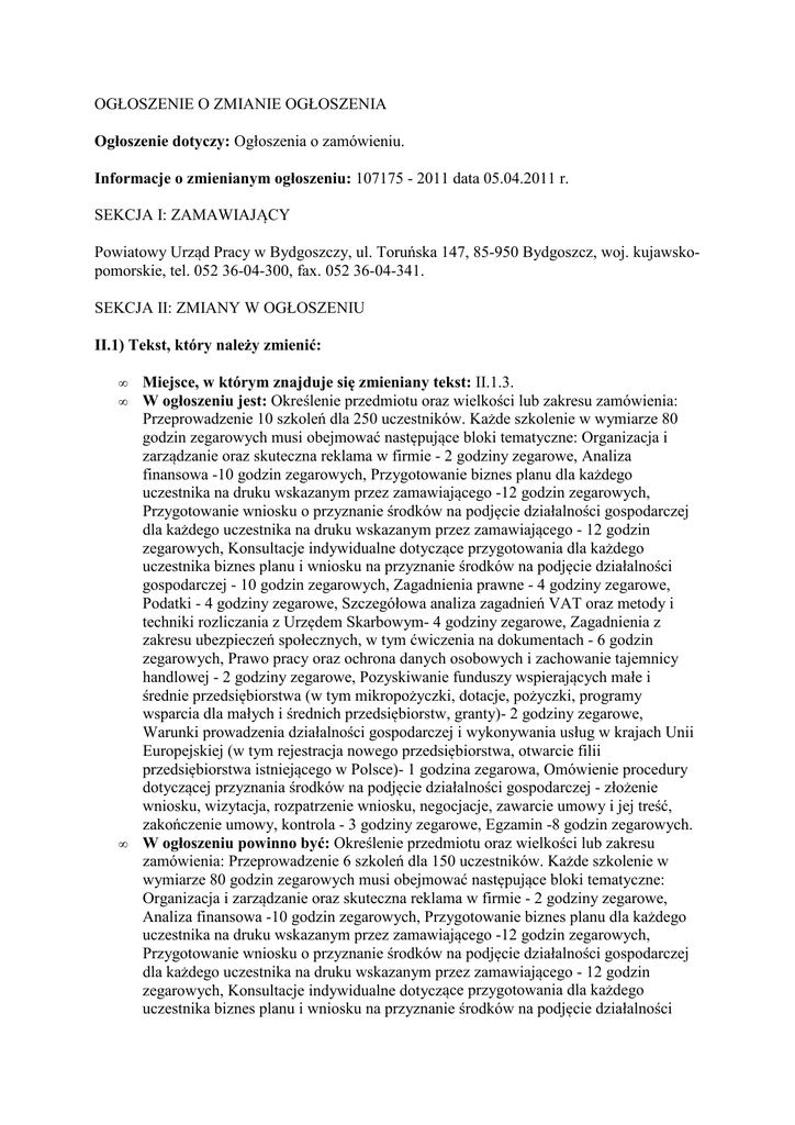 OGŁOSZENIE O ZMIANIE OGŁOSZENIA Ogłoszenie dotyczy: Ogłoszenia o zamówieniu. Informacje o zmienianym ogłoszeniu: 107175 - 2011 data 05.04.2011 r. SEKCJA I: ZAMAWIAJĄCY Powiatowy Urząd Pracy w Bydgoszczy, ul. Toruńska 147, 85-950 Bydgoszcz, woj. kujawskopomorskie, tel. 052 36-04-300, fax. 052 36-04-341. SEKCJA II: ZMIANY W OGŁOSZENIU II.1) Tekst, który należy zmienić: • • • Miejsce, w którym znajduje się zmieniany tekst: II.1.3. W ogłoszeniu jest: Określenie przedmiotu oraz wielkości lub zakresu zamówienia: Przeprowadzenie 10 szkoleń dla 250 uczestników. Każde szkolenie w wymiarze 80 godzin zegarowych musi obejmować następujące bloki tematyczne: Organizacja i zarządzanie oraz skuteczna reklama w firmie - 2 godziny zegarowe, Analiza finansowa -10 godzin zegarowych, Przygotowanie biznes planu dla każdego uczestnika na druku wskazanym przez zamawiającego -12 godzin zegarowych, Przygotowanie wniosku o przyznanie środków na podjęcie działalności gospodarczej dla każdego uczestnika na druku wskazanym przez zamawiającego - 12 godzin zegarowych, Konsultacje indywidualne dotyczące przygotowania dla każdego uczestnika biznes planu i wniosku na przyznanie środków na podjęcie działalności gospodarczej - 10 godzin zegarowych, Zagadnienia prawne - 4 godziny zegarowe, Podatki - 4 godziny zegarowe, Szczegółowa analiza zagadnień VAT oraz metody i techniki rozliczania z Urzędem Skarbowym- 4 godziny zegarowe, Zagadnienia z zakresu ubezpieczeń społecznych, w tym ćwiczenia na dokumentach - 6 godzin zegarowych, Prawo pracy oraz ochrona danych osobowych i zachowanie tajemnicy handlowej - 2 godziny zegarowe, Pozyskiwanie funduszy wspierających małe i średnie przedsiębiorstwa (w tym mikropożyczki, dotacje, pożyczki, programy wsparcia dla małych i średnich przedsiębiorstw, granty)- 2 godziny zegarowe, Warunki prowadzenia działalności gospodarczej i wykonywania usług w krajach Unii Europejskiej (w tym rejestracja nowego przedsiębiorstwa, otwarcie filii przedsiębiorstwa istniejącego w Polsce)- 1 godzina zegarowa, Omówienie procedury dotyczącej przyznania środków na podjęcie działalności gospodarczej - złożenie wniosku, wizytacja, rozpatrzenie wniosku, negocjacje, zawarcie umowy i jej treść, zakończenie umowy, kontrola - 3 godziny zegarowe, Egzamin -8 godzin zegarowych. W ogłoszeniu powinno być: Określenie przedmiotu oraz wielkości lub zakresu zamówienia: Przeprowadzenie 6 szkoleń dla 150 uczestników. Każde szkolenie w wymiarze 80 godzin zegarowych musi obejmować następujące bloki tematyczne: Organizacja i zarządzanie oraz skuteczna reklama w firmie - 2 godziny zegarowe, Analiza finansowa -10 godzin zegarowych, Przygotowanie biznes planu dla każdego uczestnika na druku wskazanym przez zamawiającego -12 godzin zegarowych, Przygotowanie wniosku o przyznanie środków na podjęcie działalności gospodarczej dla każdego uczestnika na druku wskazanym przez zamawiającego - 12 godzin zegarowych, Konsultacje indywidualne dotyczące przygotowania dla każdego uczestnika biznes planu i wniosku na przyznanie środków na podjęcie działalności gospodarczej - 10 godzin zegarowych, Zagadnienia prawne - 4 godziny zegarowe, Podatki - 4 godziny zegarowe, Szczegółowa analiza zagadnień VAT oraz metody i techniki rozliczania z Urzędem Skarbowym- 4 godziny zegarowe, Zagadnienia z zakresu ubezpieczeń społecznych, w tym ćwiczenia na dokumentach - 6 godzin zegarowych, Prawo pracy oraz ochrona danych osobowych i zachowanie tajemnicy handlowej - 2 godziny zegarowe, Pozyskiwanie funduszy wspierających małe i średnie przedsiębiorstwa (w tym mikropożyczki, dotacje, pożyczki, programy wsparcia dla małych i średnich przedsiębiorstw, granty)- 2 godziny zegarowe, Warunki prowadzenia działalności gospodarczej i wykonywania usług w krajach Unii Europejskiej (w tym rejestracja nowego przedsiębiorstwa, otwarcie filii przedsiębiorstwa istniejącego w Polsce)- 1 godzina zegarowa, Omówienie procedury dotyczącej przyznania środków na podjęcie działalności gospodarczej - złożenie wniosku, wizytacja, rozpatrzenie wniosku, negocjacje, zawarcie umowy i jej treść, zakończenie umowy, kontrola - 3 godziny zegarowe, Egzamin -8 godzin zegarowych.