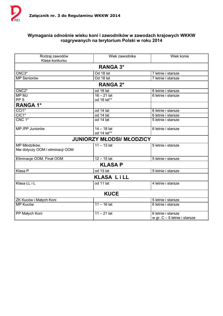 Załącznik nr. 3 do Regulaminu WKKW 2014 Wymagania odnośnie wieku koni i zawodników w zawodach krajowych WKKW rozgrywanych na terytorium Polski w roku 2014 Rodzaj zawodów Klasa konkursu Wiek zawodnika Wiek konia RANGA 3* CNC3* MP Seniorów Od 18 lat Od 18 lat 7 letnie i starsze 7 letnie i starsze RANGA 2* CNC2* MP MJ PP S od 16 lat 16 – 21 lat od 16 lat** 6 letnie i starsze 6 letnie i starsze CCI1* CIC1* CNC 1* od 14 lat od 14 lat od 14 lat 6 letnie i starsze 6 letnie i starsze 5 letnie i starsze MP /PP Juniorów 14 – 18 lat od 14 lat** 6 letnie i starsze RANGA 1* JUNIORZY MŁODSI/ MŁODZICY MP Młodzików. Nie dotyczy OOM i eliminacji OOM 11 – 13 lat 5 letnie i starsze Eliminacje OOM, Finał OOM 12 – 15 lat 5 letnie i starsze Klasa P od 13 lat KLASA P 5 letnie i starsze KLASA L i LL Klasa LL i L od 11 lat 4 letnie i starsze KUCE ZK Kuców i Małych Koni MP Kuców 11 – 16 lat PP Małych Koni 11 – 21 lat 5 letnie i starsze 6 letnie i starsze 6 letnie i starsze w gr. C – 5 letnie i starsze