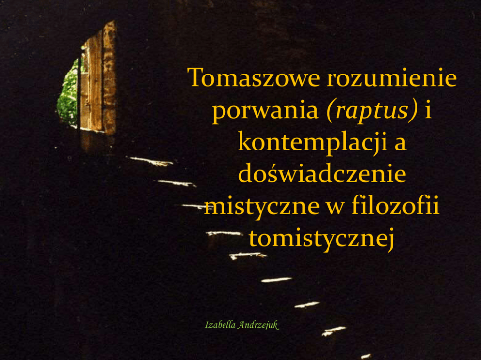 Tomaszowe rozumienie porwania (raptus) i kontemplacji a doświadczenie mistyczne w filozofii tomistycznej Izabella Andrzejuk Plan wystąpienia 1. Co św. Tomasz z Akwinu mówi o poznaniu per raptum? 1. Raptus jako rodzaj kontemplacji 2. Odróżnienie porwania od ekstazy 2. Czy raptus może być doświadczeniem mistycznym? 1. Istota doświadczenia mistycznego 2. Kontemplacja a doświadczenie mistyczne 1. Próba zestawienia wybranych autorów 3. Zakończenie 2 Św. Tomasz z Akwinu o poznaniu per raptum • Jest bezpośrednim poznaniem istoty Boga przez intelekt ludzki • Jest najwyższym stanem kontemplacji, jakiego może doświadczyć człowiek w życiu doczesnym • Do jego cech należą: – – – – Bierność Bezpośredniość Krótkość Nagłość 3 Kontemplacja • Kontemplacja – proste ujęcie prawdy, ale osiągane stopniowo – Poszczególne etapy kontemplacji stanowią jedność dzięki ostatniej czynności – właśnie prostemu ujęciu prawdy • Punktem wyjścia kontemplacji jest poznanie zmysłowe • Kontemplacja jest poznaniem mądrościowym 4 Rozwój kontemplacji Kontemplacja Bożej Prawdy Kontemplacja prawd intelektualnych Rozważanie czystych prawd intelektualnych Ocena w świetle prawd intelektualnych Przejście do rzeczy poznawalnych intelektualnie Zmysłowe ujęcie rzeczy 5 Porwanie a ekstaza • „..raptus addit aliquid supra extasim. Nam extasis importat simpliciter excessum a seipso, secundum quem scilicet aliquis extra suam ordinationem ponitur, sed raptus supra hoc addit violentiam quandam” • Tomasz akcentuje różnicę między ekstazą a porwaniem poprzez zaznaczenie, że w pierwszym przypadku chodzi o działanie władzy pożądawczej, zaś w drugim o działanie władzy poznawczej 6 Porwanie – zebrane cechy Jako wydarzenie niespodziewane Jako bezpośrednie ujęcie istoty Boga przez intelekt R APTUS Relacja poznania Boga przez człowieka Nieosiągalne przyrodzonymi siłami 7 Porwanie doświadczeniem mistycznym? Doświadczenie mistyczne • Bezpośrednie i świadome doświadczenie Boga „…rozum, ile mi się zdaje, nie myśli, ani się nie gubi, tylko, jak mówię, nie działa, jakby przerażony wielkością tych rzeczy, które ogląda” 9 Doświadczenie mistyczne – problem rozbieżności Tomasz z Akwinu • Raptus jest bezpośrednim doświadczeniem przez ludzki intelekt istoty Boga Mieczysław Gogacz • Doświadczenie mistyczne jest bezpośrednim doznaniem przez ludzki intelekt istnienia Boga Intelekt możnościowy człowieka jest wrażliwy na pryncypia istotowe bytu Skoro istota Boga jest Jego istnieniem, to doznając istoty Boga, doznajemy Jego istnienia 10 M.Gogacz o św. Tomaszu • „Św. Tomasz z Akwinu wiązał doświadczenie mistyczne z poznaniem istoty Boga. Ponieważ takie poznanie nie jest nam dostępne w tym życiu, uważał, że doświadczenie mistyczne jest pozornym doświadczeniem. Wiązał je jednak mocno z intelektem i nie zawsze odróżniał od kontemplacji” M. Gogacz, Modlitwa i mistyka 11 Kontemplacja i doświadczenie mistyczne Reginald Garrigou-Lagrange „Trzy okresy życia wewnętrznego” Aleksander Żychliński „Rozważania filozoficzno – teologiczne”, „Umiejętność świętych” Mieczysław Gogacz „Modlitwa i mistyka”, „Filozoficzne aspekty mistyki” 12 R. Garrigou - Lagrange • Kontemplacja - Proste widzenie prawdy połączone z zachwytem. Proste, serdeczne poznanie Boga i Jego dzieł • Doświadczenie mistyczne - Poznanie doświadczalne Boga (obecnego w człowieku w Swoich skutkach) pochodzące z daru mądrości 13 A. Żychliński • Kontemplacja Proste ujęcie prawdy, ogląd, intuicja prawdy • Doświadczenie mistyczne Nadprzyrodzona kontemplacja mistyczna (dary Ducha Świętego, wlewane przez Boga + łaska uświęcająca) 14 M. Gogacz • Kontemplacja Świadczenie intelektu o trwających relacjach osobowych, połączone z zachwytem • Doświadczenie mistyczne - Nagłe i krótkotrwałe doświadczenie przez intelekt możnościowy człowieka istnienia Boga 15 Pytania na zakończenie 1. Czy można uznać, że porwanie opisywane przez Akwinatę jest doświadczeniem mistycznym? 2. Czym różni się ono od lumen gloriae? 3. Jacy autorzy mogli być inspiracją dla Tomasza w omawianiu tematu raptus? 4. Na ile Tomaszowa koncepcja porwania przypomina koncepcję św. Bonawentury? 5. Dlaczego ujęcia Garrigou – Lagrange`a i A. Żychlińskiego różnią się od ujęć M. Gogacza? 16