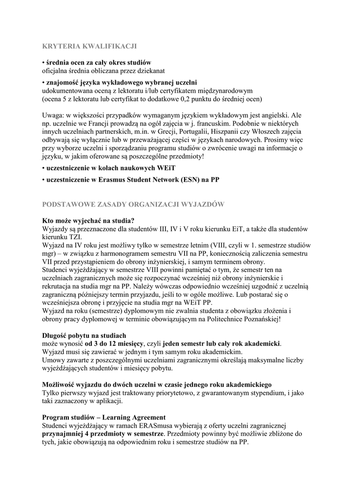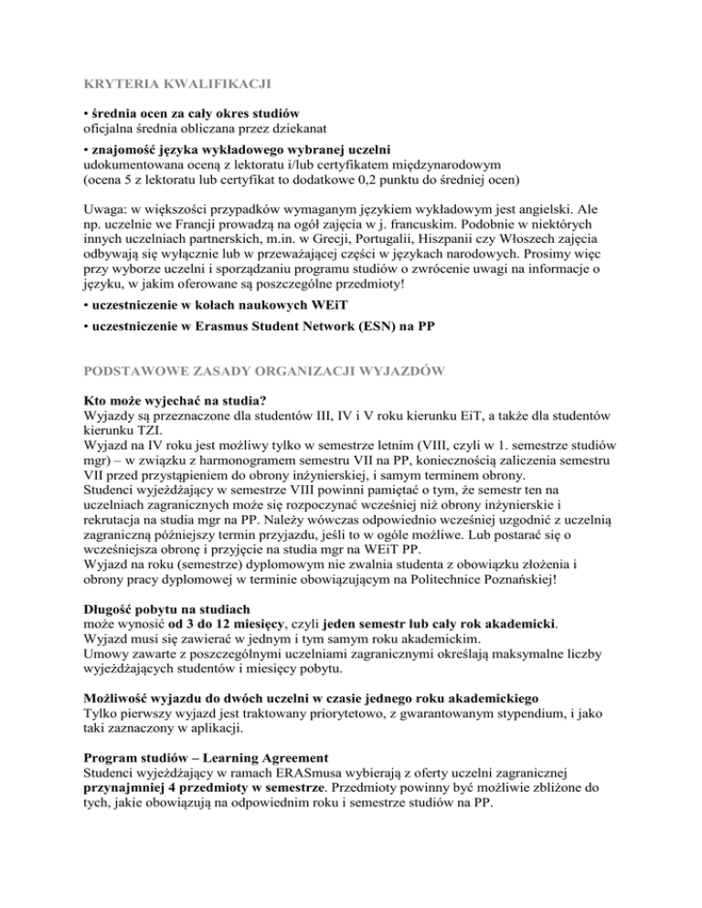 KRYTERIA KWALIFIKACJI • średnia ocen za cały okres studiów oficjalna średnia obliczana przez dziekanat • znajomość języka wykładowego wybranej uczelni udokumentowana oceną z lektoratu i/lub certyfikatem międzynarodowym (ocena 5 z lektoratu lub certyfikat to dodatkowe 0,2 punktu do średniej ocen) Uwaga: w większości przypadków wymaganym językiem wykładowym jest angielski. Ale np. uczelnie we Francji prowadzą na ogół zajęcia w j. francuskim. Podobnie w niektórych innych uczelniach partnerskich, m.in. w Grecji, Portugalii, Hiszpanii czy Włoszech zajęcia odbywają się wyłącznie lub w przeważającej części w językach narodowych. Prosimy więc przy wyborze uczelni i sporządzaniu programu studiów o zwrócenie uwagi na informacje o języku, w jakim oferowane są poszczególne przedmioty! • uczestniczenie w kołach naukowych WEiT • uczestniczenie w Erasmus Student Network (ESN) na PP PODSTAWOWE ZASADY ORGANIZACJI WYJAZDÓW Kto może wyjechać na studia? Wyjazdy są przeznaczone dla studentów III, IV i V roku kierunku EiT, a także dla studentów kierunku TZI. Wyjazd na IV roku jest możliwy tylko w semestrze letnim (VIII, czyli w 1. semestrze studiów mgr) – w związku z harmonogramem semestru VII na PP, koniecznością zaliczenia semestru VII przed przystąpieniem do obrony inżynierskiej, i samym terminem obrony. Studenci wyjeżdżający w semestrze VIII powinni pamiętać o tym, że semestr ten na uczelniach zagranicznych może się rozpoczynać wcześniej niż obrony inżynierskie i rekrutacja na studia mgr na PP. Należy wówczas odpowiednio wcześniej uzgodnić z uczelnią zagraniczną późniejszy termin przyjazdu, jeśli to w ogóle możliwe. Lub postarać się o wcześniejsza obronę i przyjęcie na studia mgr na WEiT PP. Wyjazd na roku (semestrze) dyplomowym nie zwalnia studenta z obowiązku złożenia i obrony pracy dyplomowej w terminie obowiązującym na Politechnice Poznańskiej! Długość pobytu na studiach może wynosić od 3 do 12 miesięcy, czyli jeden semestr lub cały rok akademicki. Wyjazd musi się zawierać w jednym i tym samym roku akademickim. Umowy zawarte z poszczególnymi uczelniami zagranicznymi określają maksymalne liczby wyjeżdżających studentów i miesięcy pobytu. Możliwość wyjazdu do dwóch uczelni w czasie jednego roku akademickiego Tylko pierwszy wyjazd jest traktowany priorytetowo, z gwarantowanym stypendium, i jako taki zaznaczony w aplikacji. Program studiów – Learning Agreement Studenci wyjeżdżający w ramach ERASmusa wybierają z oferty uczelni zagranicznej przynajmniej 4 przedmioty w semestrze. Przedmioty powinny być możliwie zbliżone do tych, jakie obowiązują na odpowiednim roku i semestrze studiów na PP. Wybrany zestaw przedmiotów zatwierdza opiekun naukowy wyjazdu, podpisując Learning Agreement – porozumienie o programie studiów. Zmiany w Learning Agrement W praktyce zwykle po przyjeździe na uczelnię zagraniczna studenci dokonują zmian w swoich LA, gdyż ostateczna oferta przedmiotów na dany rok lub semestr jest w większości uczelni dostępna znacznie później niż terminy rekrutacji na wyjazdy ERASMUSa. Zaliczanie semestrów na uczelni zagranicznej i macierzystej Warunki zaliczenia odpowiednich semestrów na WEiT PP to: • uzyskanie min. 30 punktów kredytowych ECTS za semestr (min. 60 punktów za cały rok) • zdanie wszystkich wymaganych egzaminów na uczelni zagranicznej. Oceny uzyskane za granicą wpisuje do indeksu opiekun naukowy wyjazdu, a o zaliczeniu semestrów decyduje ostatecznie prodziekan ds. kształcenia WEiT. Przedłużenie okresu studiów za granicą Przedłużenie pobytu powinno się odbywać na zasadach wynikających z systemu ECTS, za zgodą obu uczelni. Jest ono możliwe wyłącznie po wyjeździe na semestr zimowy – tak, aby cały pobyt zawierał się w jednym roku akademickim. Wnioski w sprawie przedłużenia pobytu i jego finansowania, wraz z pisemną zgodą prodziekana ds. kształcenia na dalsze studia za granicą, należy kierować do Koordynator Uczelnianej Programu ERASMUS możliwie jak najwcześniej – decyduje kolejność zgłoszeń! Finansowanie w postaci stypendium ERASMUSa nie jest jednak wówczas gwarantowane! UWAGA: czas pobytu na studiach za granicą, łącznie z okresem studiów w ramach ERASMUSa, nie może przekraczać 4 semestrów, jeżeli student ubiega się o uzyskanie dyplomu Politechniki Poznańskiej. Studia za granicą poza programem ERASMUS Wyjazdy na studia zagraniczne mogą się odbywać również poza programem ERASMUS, na zasadach wynikających z systemu ECTS/ Student, który zamierza w ten sposób odbyć część studiów, powinien: • przede wszystkim uzyskać pisemną zgodę wybranej uczelni na przyjęcie na studia • uzgodnić program studiów za granicą, czyli Learning Agreement, z wybranym przez siebie opiekunem naukowym (samodzielnym pracownikiem naukowym WEiT). Jeżeli wyjazd ma się odbyć na semestrze czy roku dyplomowym, najlepiej, aby opiekunem był promotor pracy dyplomowej. Należy wówczas uzgodnić również zasady przygotowania, złożenia i obrony pracy na PP, a także na uczelni zagranicznej, jeśli student zamierza uzyskać również dyplom zagranicznej uczelni. • uzyskać zgodę na wyjazd prodziekana WEiT ds. kształcenia.