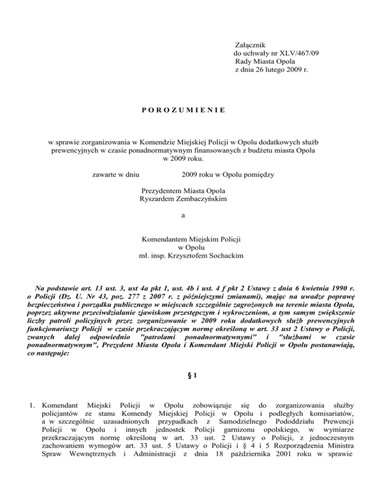 Załącznik do uchwały nr XLV/467/09 Rady Miasta Opola z dnia 26 lutego 2009 r. POROZUMIENIE w sprawie zorganizowania w Komendzie Miejskiej Policji w Opolu dodatkowych służb prewencyjnych w czasie ponadnormatywnym finansowanych z budżetu miasta Opola w 2009 roku. zawarte w dniu 2009 roku w Opolu pomiędzy Prezydentem Miasta Opola Ryszardem Zembaczyńskim a Komendantem Miejskim Policji w Opolu mł. insp. Krzysztofem Sochackim Na podstawie art. 13 ust. 3, ust 4a pkt 1, ust. 4b i ust. 4 f pkt 2 Ustawy z dnia 6 kwietnia 1990 r. o Policji (Dz. U. Nr 43, poz. 277 z 2007 r. z późniejszymi zmianami), mając na uwadze poprawę bezpieczeństwa i porządku publicznego w miejscach szczególnie zagrożonych na terenie miasta Opola, poprzez aktywne przeciwdziałanie zjawiskom przestępczym i wykroczeniom, a tym samym zwiększenie liczby patroli policyjnych przez zorganizowanie w 2009 roku dodatkowych służb prewencyjnych funkcjonariuszy Policji w czasie przekraczającym normę określoną w art. 33 ust 2 Ustawy o Policji, zwanych dalej odpowiednio "patrolami ponadnormatywnymi" i "służbami w czasie ponadnormatywnym", Prezydent Miasta Opola i Komendant Miejski Policji w Opolu postanawiają, co następuje: §1 1. Komendant Miejski Policji w Opolu zobowiązuje się do zorganizowania służby policjantów ze stanu Komendy Miejskiej Policji w Opolu i podległych komisariatów, a w szczególnie uzasadnionych przypadkach z Samodzielnego Pododdziału Prewencji Policji w Opolu i innych jednostek Policji garnizonu opolskiego, w wymiarze przekraczającym normę określoną w art. 33 ust. 2 Ustawy o Policji, z jednoczesnym zachowaniem wymogów art. 33 ust. 5 Ustawy o Policji i § 4 i 5 Rozporządzenia Ministra Spraw Wewnętrznych i Administracji z dnia 18 października 2001 roku w sprawie -2- 2. 3. 4. 5. rozkładu czasu służby policjantów (Dz. U. Nr 131, poz. 1471 z 2001 r.), natomiast Prezydent Miasta Opola zapewni środki finansowe z przeznaczeniem na rekompensaty pieniężne dla policjantów podejmujących służbę w czasie ponadnormatywnym. W ramach służby, o której mowa w ust. 1 policjanci realizują w szczególności następujące zadania: 1) ochrona życia i zdrowia ludzi oraz ich mienia przed bezprawnymi zamachami naruszającymi te dobra; 2) ochrona bezpieczeństwa i porządku publicznego, w tym zapewnienie spokoju w miejscach publicznych, oraz w ruchu drogowym; 3) kontrola przestrzegania przepisów porządkowych i administracyjnych związanych z działalnością publiczną lub obowiązujących w miejscach publicznych; 4) zdecydowane reagowanie i podejmowanie przewidzianych prawem działań wobec sprawców przestępstw i wykroczeń oraz innych osób okazujących lekceważenie i brak poszanowania dla obowiązującego porządku i norm prawnych; 5) zwracanie szczególnej uwagi na zachowanie się młodzieży w tym nieletnich w godzinach wieczorowych i nocnych oraz przeciwdziałanie przejawom wandalizmu. Przyjmuje się, że służba w czasie ponadnormatywnym pełniona będzie na obszarze miasta Opola w patrolach pieszych i zmotoryzowanych, w rejonach najbardziej zagrożonych identyfikowanych, w oparciu o bieżące analizy oraz zgodnie ze społecznym zapotrzebowaniem i wskazaniami władz samorządowych Opola. W uzasadnionych przypadkach wynikających między innymi z konieczności zapewnienia bezpieczeństwa dzieciom i młodzieży szkolnej oraz bezpieczeństwa w miejscach publicznych i środkach komunikacji publicznej, a także związanych ze zwalczaniem zjawisk kryminogennych i przestępczości, służba może być pełniona w patrolach nieumundurowanych. Za organizację służb w czasie ponadnormatywnym, sprawność i efektywność działania odpowiada Komendant Miejski Policji w Opolu. Zasady organizowania dodatkowych służb prewencyjnych w czasie ponadnormatywnym w Komendzie Miejskiej Policji w Opolu na terenie miasta Opola w 2009 roku określi w drodze decyzji Komendant Miejski Policji w Opolu. §2 1. Prezydent Miasta Opola zobowiązuje się przekazać w 2009 roku środki finansowe w kwocie 363.000,00 zł. (słownie: trzysta sześćdziesiąt trzy tysiące złotych) z przeznaczeniem na rekompensatę pieniężną za służby w czasie ponadnormatywnym pełnione przez policjantów wykonujących zadania z zakresu służb prewencyjnych określonych w §1 ust. 2 pkt 1-5 oraz innych zadań wynikających w toku pełnionej służby. 2. Prezydent Miasta Opola zobowiązuje się do przekazywania na wyodrębniony rachunek „Funduszu Wsparcia Policji Komendy Wojewódzkiej Policji w Opolu” prowadzony przez Narodowy Bank Polski Odział Okręgowy w Opolu, 45 - 950 Opole, ul. Damrota 2B o numerze: 12 1010 1401 0010 0718 9810 0000, kwoty o której mowa w ust 1, z przeznaczeniem dla Komendy Miejskiej Policji w Opolu. 3. Podstawę przekazania środków finansowych określonych w ust. 1 będą specyfikacje wykonanych dodatkowych służb patrolowych w czasie ponadnormatywnym sporządzane dwa razy w miesiącu za okres dwóch tygodni. Przekazanie środków finansowych za wykonane służby nastąpi w ciągu 7 dni od dnia otrzymania specyfikacji. Wzór specyfikacji - zestawienia wykonanych dodatkowych służb patrolowych w czasie ponadnormatywnym stanowi załącznik nr 1 do Porozumienia. 4. Komenda Miejska Policji w Opolu zobowiązuje się do sporządzenia zbiorczego zestawienia środków wykorzystanych na dodatkowe patrole ponadnormatywne w 2009 roku i przesłania go do Urzędu Miasta Opola do 15 grudnia 2009 roku. Wzór specyfikacji - zbiorczego zestawienia środków z wykonanych służb stanowi załącznik nr 2 do Porozumienia. 5. Zwrot niewykorzystanych środków finansowych nastąpi do 15 grudnia 2009 roku. -3§3 1. Komendant Miejski Policji w Opolu za pomocą służb finansowych Komendy Wojewódzkiej Policji w Opolu zobowiązuje się do wydatkowania przeznaczonych niniejszym Porozumieniem środków finansowych na służby w czasie ponadnormatywnym oraz do dokonania rozliczenia podatku dochodowego od osób fiz