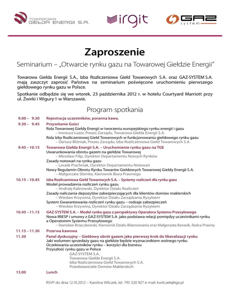 Zaproszenie Seminarium – „Otwarcie rynku gazu na Towarowej Giełdzie Energii” Towarowa Giełda Energii S.A., Izba Rozliczeniowa Giełd Towarowych S.A. oraz GAZ-SYSTEM S.A. mają zaszczyt zaprosić Państwa na seminarium poświęcone uruchomieniu pierwszego giełdowego rynku gazu w Polsce. Spotkanie odbędzie się we wtorek, 23 października 2012 r. w hotelu Courtyard Marriott przy ul. Żwirki i Wigury 1 w Warszawie. Program spotkania 9.00 – 9.30 9.30 – 9.45 9.45 – 10.15 10.15 – 10.45 10.45 – 11.15 11.15 – 11.30 11.30 13.00 Rejestracja uczestników, poranna kawa. Przywitanie Gości Rola Towarowej Giełdy Energii w tworzeniu europejskiego rynku energii i gazu – Ireneusz Łazor, Prezes Zarządu, Towarowa Giełda Energii S.A. Rola Izby Rozliczeniowej Giełd Towarowych w funkcjonowaniu giełdowego rynku gazu – Dariusz Bliźniak, Prezes Zarządu, Izba Rozliczeniowa Giełd Towarowych S.A. Towarowa Giełda Energii S.A. – Uruchomienie rynku gazu na TGE Uwarunkowania obrotu gazem na giełdzie Towarowej – Mirosław Filip, Dyrektor Departamentu Nowych Rynków Zasady notowań na rynku gazu – Leszek Prachniak, Dyrektor Departamentu Notowań Nowy Regulamin Obrotu Rynku Towarów Giełdowych Towarowej Giełdy Energii S.A. – Małgorzata Słomko, Kierownik Biura Prawnego Izba Rozliczeniowa Giełd Towarowych S.A. – Systemy rozliczeń dla rynku gazu Model prowadzenia rozliczeń rynku gazu – Andrzej Kalinowski, Dyrektor Działu Rozliczeń Zasady naliczania depozytów zabezpieczających dla klientów domów maklerskich – Wiesław Krzywina, Dyrektor Działu Zarządzania Ryzykiem System Gwarantowania rozliczeń rynku gazu – rodzaje zabezpieczeń – Wiesław Krzywina, Dyrektor Działu Zarządzania Ryzykiem GAZ-SYSTEM S.A. – Model rynku gazu z perspektywy Operatora Systemu Przesyłowego Nowa IRiESP i umowy z GAZ-SYSTEM S.A. jako podstawa relacji pomiędzy uczestnikami rynku a Operatorem Systemu Przesyłowego – Stanisław Brzęczkowski, Kierownik Działu Bilansowania oraz Małgorzata Banasik, Radca Prawny Przerwa kawowa Panel dyskusyjny – Giełdowy obrót gazem jako pierwszy krok do liberalizacji rynku Jaki wolumen sprzedaży gazu na giełdzie będzie wyznacznikiem wolnego rynku Oczekiwania uczestników rynku – korzyści dla biznesu Przyszłość rynku gazu w Polsce GAZ-SYSTEM S.A. Towarowa Giełda Energii S.A. Izba Rozliczeniowa Giełd Towarowych S.A. Przedstawiciele Domów Maklerskich Lunch RSVP do dnia 12.10.2012 – Karolina Wilczek, tel. 795 520 927 e-mail: [email protected]