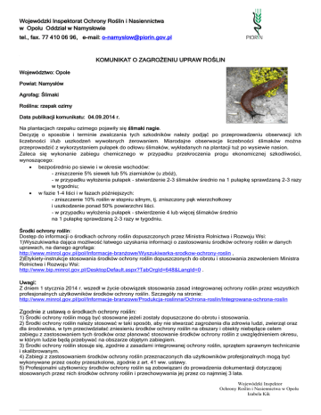 Wojewódzki Inspektorat Ochrony Roślin i Nasiennictwa w Opolu Oddział w Namysłowie tel., fax. 77 410 06 96, e-mail: [email protected] KOMUNIKAT O ZAGROŻENIU UPRAW ROŚLIN Województwo: Opole Powiat: Namysłów Agrofag: Ślimaki Roślina: rzepak ozimy Data publikacji komunikatu: 04.09.2014 r. Na plantacjach rzepaku ozimego pojawiły się ślimaki nagie. Decyzję o sposobie i terminie zwalczania tych szkodników należy podjąć po przeprowadzeniu obserwacji ich liczebności i/lub uszkodzeń wywołanych żerowaniem. Miarodajne obserwacje liczebności ślimaków można przeprowadzić z wykorzystaniem pułapek do odłowu ślimaków, wykładanych na plantacji tuż po wysiewie nasion. Zaleca się wykonanie zabiegu chemicznego w przypadku przekroczenia progu ekonomicznej szkodliwości, wynoszącego: bezpośrednio po siewie i w okresie wschodów: - zniszczenie 5% siewek lub 5% ziarniaków (u zbóż), - w przypadku wyłożenia pułapek – stwierdzenie 2-3 ślimaków średnio na 1 pułapkę sprawdzaną 2-3 razy w tygodniu; w fazie 1-4 liści i w fazach późniejszych: - zniszczenie 10% roślin w stopniu silnym, tj. zniszczony pąk wierzchołkowy i uszkodzenie ponad 50% powierzchni liści. - w przypadku wyłożenia pułapek – stwierdzenie 4 lub więcej ślimaków średnio na 1 pułapkę sprawdzaną 2-3 razy w tygodniu. Środki ochrony roślin: Dostęp do informacji o środkach ochrony roślin dopuszczonych przez Ministra Rolnictwa i Rozwoju Wsi: 1)Wyszukiwarka dająca możliwość łatwego uzyskania informacji o zastosowaniu środków ochrony roślin w danych uprawach, na danego agrofaga: http://www.minrol.gov.pl/pol/Informacje-branżowe/Wyszukiwarka-srodkow-ochrony-roslin , 2)Etykiety-instrukcje stosowania środków ochrony roślin dopuszczonych do obrotu i stosowania zezwoleniem Ministra Rolnictwa i Rozwoju Wsi: http://www.bip.minrol.gov.pl/DesktopDefault.aspx?TabOrgId=648&LangId=0 . Uwagi: Z dniem 1 stycznia 2014 r. wszedł w życie obowiązek stosowania zasad integrowanej ochrony roślin przez wszystkich profesjonalnych użytkowników środków ochrony roślin. Szczegóły na stronie: http://www.minrol.gov.pl/pol/Informacje-branzowe/Produkcja-roslinna/Ochrona-roslin/Integrowana-ochrona-roslin Zgodnie z ustawą o środkach ochrony roślin: 1) Środki ochrony roślin mogą być stosowane jeżeli zostały dopuszczone do obrotu i stosowania. 2) Środki ochrony roślin należy stosować w taki sposób, aby nie stwarzać zagrożenia dla zdrowia ludzi, zwierząt oraz dla środowiska, w tym przeciwdziałać zniesieniu środków ochrony roślin na obszary i obiekty niebędące celem zabiegu z zastosowaniem tych środków oraz planować stosowanie środków ochrony roślin z uwzględnieniem okresu, w którym ludzie będą przebywać na obszarze objętym zabiegiem. 3) Środki ochrony roślin stosuje się, zgodnie z zasadami integrowanej ochrony roślin, sprzętem sprawnym technicznie i skalibrowanym. 4) Zabiegi z zastosowaniem środków ochrony roślin przeznaczonych dla użytkowników profesjonalnych mogą być wykonywane przez osoby przeszkolone, zgodnie z art. 41 ww. ustawy. 5) Profesjonalni użytkownicy środków ochrony roślin są zobowiązani do prowadzenia dokumentacji dotyczącej stosowanych przez nich środków ochrony roślin i przechowywania jej przez co najmniej 3 lata. Wojewódzki Inspektor Ochrony Roślin i Nasiennictwa w Opolu Izabela Kik