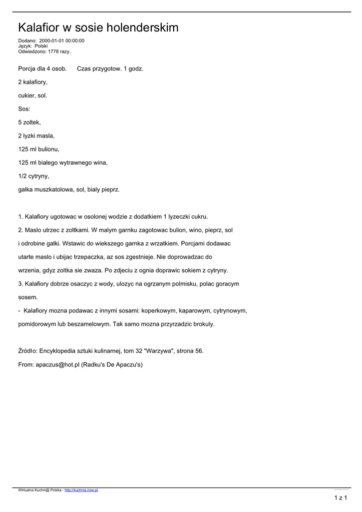 Kalafior w sosie holenderskim Dodano: 2000-01-01 00:00:00 Język: Polski Odwiedzono: 1778 razy. Porcja dla 4 osob. Czas przygotow. 1 godz. 2 kalafiory, cukier, sol. Sos: 5 zoltek, 2 lyzki masla, 125 ml bulionu, 125 ml bialego wytrawnego wina, 1/2 cytryny, galka muszkatolowa, sol, bialy pieprz. 1. Kalafiory ugotowac w osolonej wodzie z dodatkiem 1 lyzeczki cukru. 2. Maslo utrzec z zoltkami. W malym garnku zagotowac bulion, wino, pieprz, sol i odrobine galki. Wstawic do wiekszego garnka z wrzatkiem. Porcjami dodawac utarte maslo i ubijac trzepaczka, az sos zgestnieje. Nie doprowadzac do wrzenia, gdyz zoltka sie zwaza. Po zdjeciu z ognia doprawic sokiem z cytryny. 3. Kalafiory dobrze osaczyc z wody, ulozyc na ogrzanym polmisku, polac goracym sosem. - Kalafiory mozna podawac z innymi sosami: koperkowym, kaparowym, cytrynowym, pomidorowym lub beszamelowym. Tak samo mozna przyrzadzic brokuly. Źródło: Encyklopedia sztuki kulinarnej, tom 32 "Warzywa", strona 56. From: [email protected] (Radku's De Apaczu's) Wirtualna Kuchni@ Polska - http://kuchnia.now.pl przepis nr 5328, plik wygenerowano 2017.03.08 19:29 1z1