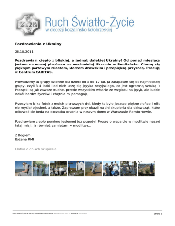 Pozdrowienia z Ukrainy 26.10.2011 Pozdrawiam ciepło z bliskiej, a jednak dalekiej Ukrainy! Od ponad miesiąca jestem na nowej placówce we wschodniej Ukrainie w Berdiańsku. Cieszę się pięknym portowym miastem, Morzem Azowskim i przepiękną przyrodą. Pracuję w Centrum CARITAS. Prowadzimy tu grupy dzienne dla dzieci od 3 do 17 lat. Ja załapałam się do najmłodszej grupy, czyli 3-4 latki i od nich uczę się języka rosyjskiego, co jest ogromną sztuką :) Początki są jak zawsze trudne, przede wszystkim właśnie ze względu na język, ale ludzie wokół bardzo życzliwi i chętnie mi pomagają. Przesyłam kilka fotek z moich pierwszych dni, kiedy to było jeszcze piękne słońce i nikt nie myślał o jesieni, a także. Zapraszam przy okazji na dni skupienia dla dziewcząt, które odbywać się będą na początku grudnia w naszym domu w Warszawie Rembertowie. Pozdrawiam ciepło pomimo jesiennej juz pogody! Proszę o wsparcie w modlitwie naszej tutaj misji, ja również pamiętam w modlitwe... Z Bogiem Bożena RMI Ulotka o dniach skupienia Ruch Światło-Życie w diecezji koszalińsko-kołobrzeskiej: www.koszalin.oaza.pl; realizacja: kokoma.pl Strona 1