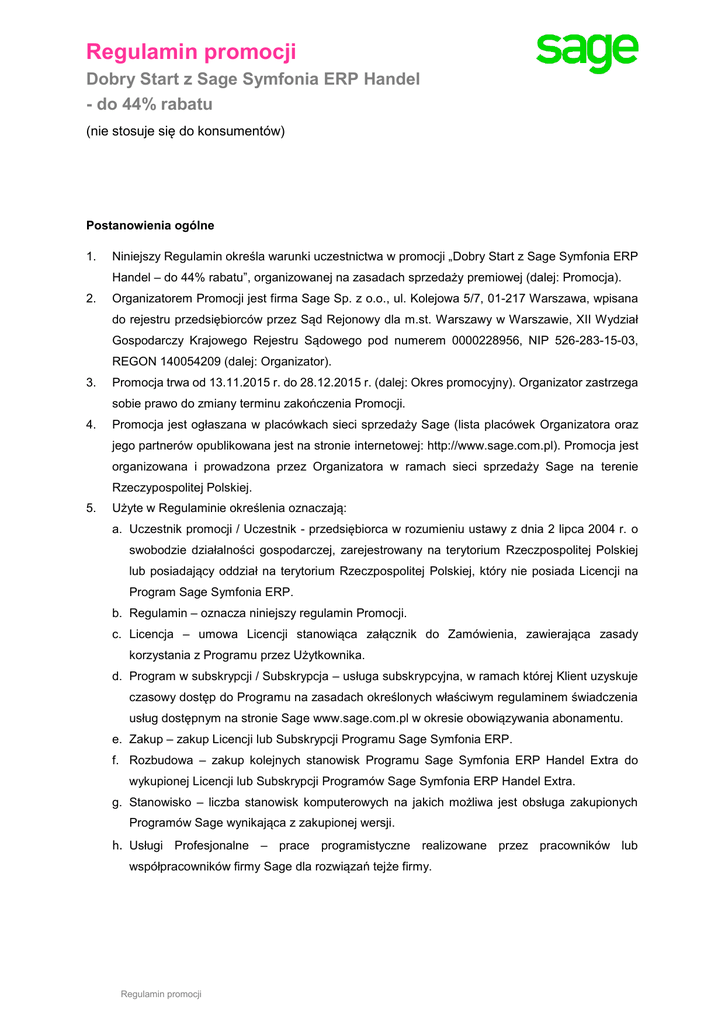 Regulamin promocji Dobry Start z Sage Symfonia ERP Handel - do 44% rabatu (nie stosuje się do konsumentów) Postanowienia ogólne 1. Niniejszy Regulamin określa warunki uczestnictwa w promocji „Dobry Start z Sage Symfonia ERP Handel – do 44% rabatu”, organizowanej na zasadach sprzedaży premiowej (dalej: Promocja). 2. Organizatorem Promocji jest firma Sage Sp. z o.o., ul. Kolejowa 5/7, 01-217 Warszawa, wpisana do rejestru przedsiębiorców przez Sąd Rejonowy dla m.st. Warszawy w Warszawie, XII Wydział Gospodarczy Krajowego Rejestru Sądowego pod numerem 0000228956, NIP 526-283-15-03, REGON 140054209 (dalej: Organizator). 3. Promocja trwa od 13.11.2015 r. do 28.12.2015 r. (dalej: Okres promocyjny). Organizator zastrzega sobie prawo do zmiany terminu zakończenia Promocji. 4. Promocja jest ogłaszana w placówkach sieci sprzedaży Sage (lista placówek Organizatora oraz jego partnerów opublikowana jest na stronie internetowej: http://www.sage.com.pl). Promocja jest organizowana i prowadzona przez Organizatora w ramach sieci sprzedaży Sage na terenie Rzeczypospolitej Polskiej. 5. Użyte w Regulaminie określenia oznaczają: a. Uczestnik promocji / Uczestnik - przedsiębiorca w rozumieniu ustawy z dnia 2 lipca 2004 r. o swobodzie działalności gospodarczej, zarejestrowany na terytorium Rzeczpospolitej Polskiej lub posiadający oddział na terytorium Rzeczpospolitej Polskiej, który nie posiada Licencji na Program Sage Symfonia ERP. b. Regulamin – oznacza niniejszy regulamin Promocji. c. Licencja – umowa Licencji stanowiąca załącznik do Zamówienia, zawierająca zasady korzystania z Programu przez Użytkownika. d. Program w subskrypcji / Subskrypcja – usługa subskrypcyjna, w ramach której Klient uzyskuje czasowy dostęp do Programu na zasadach określonych właściwym regulaminem świadczenia usług dostępnym na stronie Sage www.sage.com.pl w okresie obowiązywania abonamentu. e. Zakup – zakup Licencji lub Subskrypcji Programu Sage Symfonia ERP. f. Rozbudowa – zakup kolejnych stanowisk Programu Sage Symfonia ERP Handel Extra do wykupionej Licencji lub Subskrypcji Programów Sage Symfonia ERP Handel Extra. g. Stanowisko – liczba stanowisk komputerowych na jakich możliwa jest obsługa zakupionych Programów Sage wynikająca z zakupionej wersji. h. Usługi Profesjonalne – prace programistyczne realizowane przez pracowników lub współpracowników firmy Sage dla rozwiązań tejże firmy. Regulamin promocji Zasady promocji 6. Promocja skierowana jest do Uczestników promocji spełniających warunki wskazane w niniejszym Regulaminie, którzy w Okresie promocyjnym złożą u Organizatora lub sieci Partnerów Sage zamówienie zgodnie z punktem 7 niniejszego regulaminu. 7. W ramach promocji Uczestnik może dokonać Zakupu Licencji lub Subskrypcji Produktów Sage Symfonia ERP na poniższych zasadach: a. Z 44% rabatem na Zakup Programu Sage Symfonia ERP Handel Extra 10 Stanowisk wraz z Gwarancją Komfort, Gwarancją VIP, Gwarancją Komfort+ lub Gwarancją VIP+. b. Z 33% rabatem na Zakup Programu Sage Symfonia ERP Handel Extra 5 Stanowisk wraz z Gwarancją Komfort, Gwarancją VIP, Gwarancją Komfort+ lub Gwarancją VIP+. c. Z 22% rabatem na Zakup Programu Sage Symfonia ERP Handel Extra 3 Stanowisk wraz z Gwarancją Podstawową, Gwarancją Komfort, Gwarancją VIP, Gwarancją Podstawową+, Gwarancją Komfort+ lub Gwarancją VIP+. d. Z 17% rabatem na Zakup Programu Sage Symfonia ERP Handel Extra 2 Stanowisk wraz z Gwarancją Podstawową, Gwarancją Komfort, Gwarancją VIP, Gwarancją Podstawową+, Gwarancją Komfort+ lub Gwarancją VIP+. 8. Dodatkowo Uczestnik promocji spełniający warunki wskazane w punkcie 7 niniejszego Regulaminu może skorzystać ze specjalnej oferty: a. 14% rabatu na Usługi Profesjonalne przy zakupie powyżej 3 pakietów 7 godzinnych. b. 9% rabatu na Usługi Profesjonalne przy zakupie 1, 2 lub 3 pakietów 7 godzinnych. 9. Zakup produktu Sage Symfonia ERP Handel Extra nie obejmuje wdrożenia, które stanowi odrębny element oferty. Postanowienia końcowe 10. Uczestnictwo w Promocji oznacza akceptację zasad określonych w niniejszym Regulaminie. 11. Promocja nie jest grą losową, zakładem wzajemnym, ani grą na automatach których wynik zależy od przypadku w rozumieniu art. 2 ustawy z dnia 19 listopada 2009 r. o grach hazardowych. 12. Zasady licencjonowania Programów określa każdorazowo umowa Licencji. 13. Niniejszy regulamin jest jedynym dokumentem określającym zasady Promocji. Materiały reklamowe mają jedynie charakter promocyjno-informacyjny. 14. Aktualnie obowiązujący cennik Sage dostępny jest w sieci sprzedaży Sage. 15. Organizator zastrzega sobie prawo wykluczenia Uczestnika z Promocji ze skutkiem natychmiastowym, w przypadku stwierdzenia naruszenia postanowienia Regulaminu, mogącego mieć wpływ na przyznanie rabatu. W takim wypadku Uczestnik promocji będzie zobowiązany do zwrotu przyznanego rabatu. 16. W sprawach nieuregulowanych niniejszym Regulaminem stosuje się odpowiednio przepisy Kodeksu Cywilnego. 17. Wszelkie spory mogące wyniknąć w związku z realizacją Promocji będą rozstrzygane przez sąd właściwy miejscowo dla siedziby Organizatora Promocji. 18. Organizator Promocji zastrzega sobie prawo do dokonania zmian w niniejszym Regulaminie lub zawieszenia Promocji w każdym czasie bez podania przyczyny, z zastrzeżeniem praw uprzednio Regulamin promocji Dobry Start z Sage Symfonia ERP Handel - do 44% rabatu (nie stosuje się do konsumentów) nabytych. Zmieniony Regulamin zostanie opublikowany na stronie http://www.sage.com.pl/regulaminy oraz w placówkach sieci sprzedaży Sage. Regulamin promocji internetowej