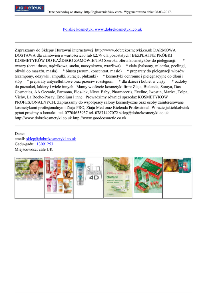 Dane pochodzą ze strony: http://ogloszenia24uk.com/. Wygenerowano dnia: 08-03-2017. Polskie kosmetyki www.dobrekosmetyki.co.uk Zapraszamy do Sklepu/ Hurtowni internetowej http://www.dobrekosmetyki.co.uk DARMOWA DOSTAWA dla zamówień o wartości £50 lub £2.79 dla pozostałych! BEZPŁATNE PRÓBKI KOSMETYKÓW DO KAŻDEGO ZAMÓWIENIA! Szeroka oferta kosmetyków do pielęgnacji: * twarzy (cera: tłusta, trądzikowa, sucha, naczynkowa, wrażliwa) * ciała (balsamy, mleczka, peelingi, oliwki do masażu, masła) * biustu (serum, koncentrat, masło) * preparaty do pielęgnacji włosów (szampony, odżywki, ampułki, kuracje, płukanki) * kosmetyki ochronne i pielęgnacyjne do dłoni i stóp * preparaty antycellulitowe oraz przeciw rozstępom * dla dzieci i kobiet w ciąży * ozdoby do paznokci, lakiery i wiele innych. Mamy w ofercie kosmetyki firm: Ziaja, Bielenda, Soraya, Dax Cosmetics, AA Oceanic, Farmona, Flos-lek, Nivea Baby, Pharmaceris, Eveline, Iwostin, Mariza, Tołpa, Vichy, La Roche-Posay, Emolium i inne. Prowadzimy również sprzedaż KOSMETYKÓW PROFESJONALNYCH. Zapraszamy do współpracy salony kosmetyczne oraz osoby zainteresowane kosmetykami profesjonalnymi Ziaja PRO, Ziaja Med oraz Bielenda Professional. W razie jakichkolwiek pytań prosimy o kontakt. tel. 07704655937 tel. 07871497072 [email protected] http://www.dobrekosmetyki.co.uk http://www.goodcosmetic.co.uk Dane: email: [email protected] Gadu-gadu: 13091253 Miejscowość: całe UK