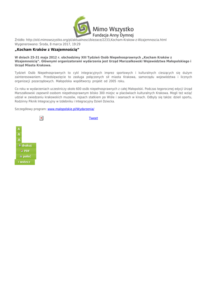 Źródło: http://old.mimowszystko.org/pl/aktualnosci/biezace/2233,Kocham-Krakow-z-Wzajemnoscia.html Wygenerowano: Środa, 8 marca 2017, 19:29 „Kocham Kraków z Wzajemnością” W dniach 25-31 maja 2012 r. obchodzimy XIII Tydzień Osób Niepełnosprawnych „Kocham Kraków z Wzajemnością”. Głównymi organizatorami wydarzenia jest Urząd Marszałkowski Województwa Małopolskiego i Urząd Miasta Krakowa. Tydzień Osób Niepełnosprawnych to cykl integracyjnych imprez sportowych i kulturalnych cieszących się dużym zainteresowaniem. Przedsięwzięcie to zasługa połączonych sił miasta Krakowa, samorządu województwa i licznych organizacji pozarządowych. Małopolska współtworzy projekt od 2005 roku. Co roku w wydarzeniach uczestniczy około 600 osób niepełnosprawnych z całej Małopolski. Podczas tegorocznej edycji Urząd Marszałkowski zapewnił osobom niepełnosprawnym blisko 300 miejsc w placówkach kulturalnych Krakowa. Mogli też wziąć udział w zwiedzaniu krakowskich muzeów, rejsach statkiem po Wiśle i seansach w kinach. Odbyły się także: dzień sportu, Rodzinny Piknik Integracyjny w Izdebniku i Integracyjny Dzień Dziecka. Szczegółowy program: www.malopolskie.pl/Wydarzenia/ Tweet