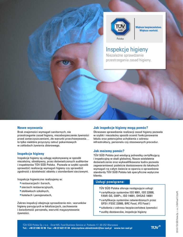Inspekcje higieny Niezależne sprawdzenie przestrzegania zasad higieny. Nowe wyzwania Jak inspekcje higieny mogą pomóc? Brak znajomości wymagań sanitarnych, nie przestrzeganie zasad higieny, niezabezpieczenie żywności przed zanieczyszczeniami, złe warunki przechowywania… to tylko niektóre przyczyny zatruć pokarmowych w zakładach żywienia zbiorowego. Okresowe sprawdzenie realizacji zasad higieny pozwala w szybki i niezależny sposób ocenić funkcjonowanie lokalu oraz potencjalne uchybienia z zakresu infrastruktury, personelu czy stosowanych procedur. Inspekcje higieny są usługą wykonywaną w sposób niezależny, obiektywny, przez doświadczonych auditorów i inspektorów TÜV SÜD Polska. Pozwala w szybki sposób sprawdzić realizację wymagań higieny czy sprawdzić zgodność z działalność obiektu z standardami sieciowymi. Inspekcje higieniczne realizujemy w: restauracjach i barach, sieciach restauracyjnych, stołówkach szkolnych, hotelach i pensjonatach, Zakres inspekcji obejmuje sprawdzenie min.: warunków higieny panujących w lokalizacjach, zachowanie i świadomość personelu, warunki magazynowania żywności. Jak możemy pomóc? TÜV SÜD Polska jest wiodącą jednostką certyfikującą i inspekcyjną w skali globalnej. Nasze wieloletnie doświadczenie oraz wykwalifikowana kadra pozwala zagwarantować podeście dostosowane do lokalnych wymagań na całym świecie w oparciu o sprawdzone standardy TÜV SÜD Polska lub specyficzne wytyczne klienta. Usługi powiązane: TÜV SÜD Polska oferuje następujące usługi: certyfikacja systemów ISO 9001, ISO 22000, FAMI-QS, GMP+, ISO 14001, OHSAS 18001 certyfikacja systemów zatwierdzonych przez GFSI ( FSSC 22000, BRC Food, IFS Food ) szkolenia z zakresu bezpieczeństwa żywności audity dostawców, inspekcje higieny TÜV SÜD Polska Sp. z o.o. · Dział MS, Food Business Service ul. Podwale 17, 00-252 Warszawa Tel.: +48 22 696 43 96 Fax: +48 22 622 41 04 [email protected] www.tuv-sud.pl 2014 © TÜV SÜD Polska Sp. z . o.o. | V-IM/Food/12.0/pl/PL Inspekcje higieny