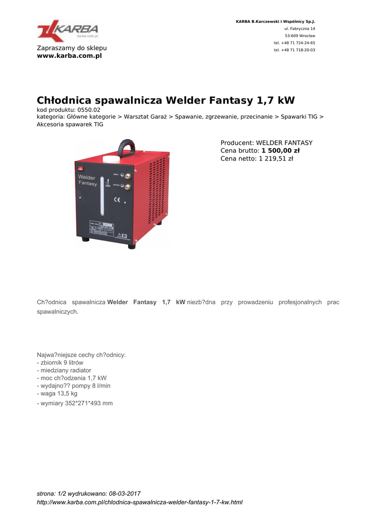 KARBA B.Karczewski i Wspólnicy Sp.J. ul. Fabryczna 14 53-609 Wrocław tel. +48 71 724-24-65 Zapraszamy do sklepu www.karba.com.pl tel. +48 71 718-20-03 Chłodnica spawalnicza Welder Fantasy 1,7 kW kod produktu: 0550.02 kategoria: Główne kategorie > Warsztat Garaż > Spawanie, zgrzewanie, przecinanie > Spawarki TIG > Akcesoria spawarek TIG Producent: WELDER FANTASY Cena brutto: 1 500,00 zł Cena netto: 1 219,51 zł Ch?odnica spawalnicza Welder Fantasy 1,7 kW niezb?dna przy prowadzeniu profesjonalnych prac spawalniczych. Najwa?niejsze cechy ch?odnicy: - zbiornik 9 litrów - miedziany radiator - moc ch?odzenia 1,7 kW - wydajno?? pompy 8 l/min - waga 13,5 kg - wymiary 352*271*493 mm strona: 1/2 wydrukowano: 08-03-2017 http://www.karba.com.pl/chlodnica-spawalnicza-welder-fantasy-1-7-kw.html *Przy zakupie na Fakturę VAT gwarancja 1 rok strona: 2/2 wydrukowano: 08-03-2017 http://www.karba.com.pl/chlodnica-spawalnicza-welder-fantasy-1-7-kw.html