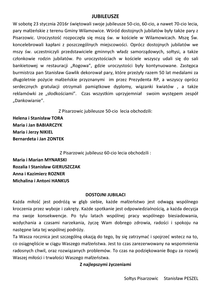 JUBILEUSZE W sobotę 23 stycznia 2016r świętowali swoje jubileusze 50-cio, 60-cio, a nawet 70-cio lecia, pary małżeńskie z terenu Gminy Wilamowice. Wśród dostojnych jubilatów były także pary z Pisarzowic. Uroczystość rozpoczęła się mszą św. w kościele w Wilamowicach. Mszę Św. koncelebrowali kapłani z poszczególnych miejscowości. Oprócz dostojnych jubilatów we mszy św. uczestniczyli przedstawiciele gminnych władz samorządowych, sołtysi, a także członkowie rodzin jubilatów. Po uroczystościach w kościele wszyscy udali się do sali bankietowej w restauracji „Rogowa”, gdzie uroczystości były kontynuowane. Zastępca burmistrza pan Stanisław Gawlik dekorował pary, które przeżyły razem 50 lat medalami za długoletnie pożycie małżeńskie przyznanymi im przez Prezydenta RP, a wszyscy oprócz serdecznych gratulacji otrzymali pamiątkowe dyplomy, wiązanki kwiatów , a także reklamówki ze „słodkościami”. Czas wszystkim uprzyjemniał swoim występem zespół „Dankowianie”. Z Pisarzowic jubileusze 50-cio lecia obchodzili: Helena i Stanisław TORA Maria i Jan BABIARCZYK Maria i Jerzy NIKIEL Bernardeta i Jan ZONTEK Z Pisarzowic jubileusz 60-cio lecia obchodzili : Maria i Marian MYNARSKI Rozalia I Stanisław GIERUSZCZAK Anna i Kazimierz ROZNER Michalina i Antoni HANKUS DOSTOJNI JUBILACI Każda miłość jest podróżą w głąb siebie, każde małżeństwo jest odwagą wspólnego kroczenia przez wyboje i zakręty. Każde spotkanie jest odpowiedzialnością, a każda decyzja ma swoje konsekwencje. Po tylu latach wspólnej pracy wspólnego biesiadowania, wzdychania a czasami narzekania, życzę Wam dobrego zdrowia, radości i spokoju na następne lata tej wspólnej podróży. Ta Wasza rocznica jest szczególną okazją do tego, by się zatrzymać i spojrzeć wstecz na to, co osiągnęliście w ciągu Waszego małżeństwa. Jest to czas zarezerwowany na wspomnienia radosnych chwil, oraz rozwiązanych problemów. To czas na podziękowanie Bogu za rozwój Waszej miłości i trwałości Waszego małżeństwa. Z najlepszymi życzeniami Sołtys Pisarzowic Stanisław PESZEL