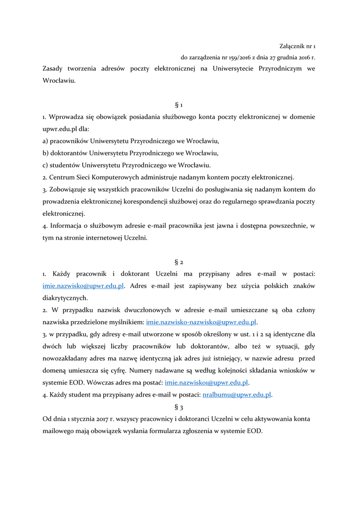 Załącznik nr 1 do zarządzenia nr 159/2016 z dnia 27 grudnia 2016 r. Zasady tworzenia adresów poczty elektronicznej na Uniwersytecie Przyrodniczym we Wrocławiu. §1 1. Wprowadza się obowiązek posiadania służbowego konta poczty elektronicznej w domenie upwr.edu.pl dla: a) pracowników Uniwersytetu Przyrodniczego we Wrocławiu, b) doktorantów Uniwersytetu Przyrodniczego we Wrocławiu, c) studentów Uniwersytetu Przyrodniczego we Wrocławiu. 2. Centrum Sieci Komputerowych administruje nadanym kontem poczty elektronicznej. 3. Zobowiązuje się wszystkich pracowników Uczelni do posługiwania się nadanym kontem do prowadzenia elektronicznej korespondencji służbowej oraz do regularnego sprawdzania poczty elektronicznej. 4. Informacja o służbowym adresie e-mail pracownika jest jawna i dostępna powszechnie, w tym na stronie internetowej Uczelni. §2 1. Każdy pracownik i doktorant Uczelni ma przypisany adres e-mail w postaci: [email protected]. Adres e-mail jest zapisywany bez użycia polskich znaków diakrytycznych. 2. W przypadku nazwisk dwuczłonowych w adresie e-mail umieszczane są oba człony nazwiska przedzielone myślnikiem: [email protected]. 3. w przypadku, gdy adresy e-mail utworzone w sposób określony w ust. 1 i 2 są identyczne dla dwóch lub większej liczby pracowników lub doktorantów, albo też w sytuacji, gdy nowozakładany adres ma nazwę identyczną jak adres już istniejący, w nazwie adresu przed domeną umieszcza się cyfrę. Numery nadawane są według kolejności składania wniosków w systemie EOD. Wówczas adres ma postać: [email protected]. 4. Każdy student ma przypisany adres e-mail w postaci: [email protected]. §3 Od dnia 1 stycznia 2017 r. wszyscy pracownicy i doktoranci Uczelni w celu aktywowania konta mailowego mają obowiązek wysłania formularza zgłoszenia w systemie EOD.