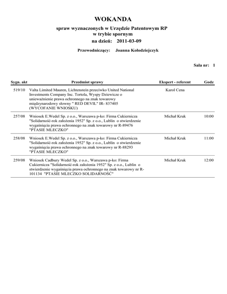 WOKANDA spraw wyznaczonych w Urzędzie Patentowym RP w trybie spornym na dzień: 2011-03-09 Przewodniczący: Joanna Kołodziejczyk Sala nr: 1 Sygn. akt Przedmiot sprawy Ekspert - referent Godz 519/10 Valta Limited Mauren, Lichtenstein przeciwko United National Investments Company Inc. Tortola, Wyspy Dziewicze o unieważnienie prawa ochronnego na znak towarowy międzynarodowy słowny " RED DEVIL" IR- 837405 (WYCOFANIE WNIOSKU) Karol Cena 257/08 Wniosek E.Wedel Sp. z o.o., Warszawa p-ko: Firma Cukiernicza "Solidarność-rok założenia 1952" Sp. z o.o., Lublin o stwierdzenie wygaśnięcia prawa ochronnego na znak towarowy nr R-89476 "PTASIE MLECZKO" Michał Kruk 10:00 258/08 Wniosek E.Wedel Sp. z o.o., Warszawa p-ko: Firma Cukiernicza "Solidarność-rok założenia 1952" Sp. z o.o., Lublin o stwierdzenie wygaśnięcia prawa ochronnego na znak towarowy nr R-88293 "PTASIE MLECZKO" Michał Kruk 11:00 259/08 Wniosek Cadbury Wedel Sp. z o.o., Warszawa p-ko: Firma Cukiernicza "Solidarność-rok założenia 1952" Sp. z o.o., Lublin o stwierdzenie wygaśnięcia prawa ochronnego na znak towarowy nr R101134 "PTASIE MLECZKO SOLIDARNOŚĆ" Michał Kruk 12:00