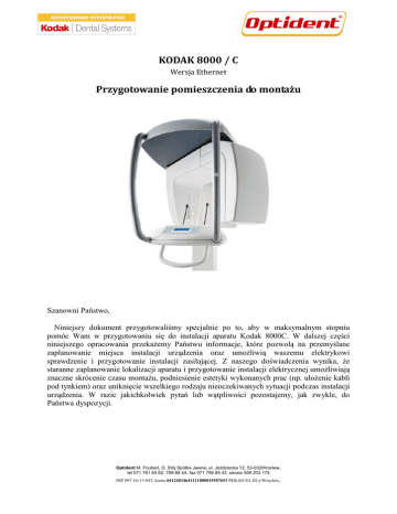 KODAK 8000 / C Wersja Ethernet Przygotowanie pomieszczenia do montażu Szanowni Państwo, Niniejszy dokument przygotowaliśmy specjalnie po to, aby w maksymalnym stopniu pomóc Wam w przygotowaniu się do instalacji aparatu Kodak 8000C. W dalszej części niniejszego opracowania przekażemy Państwu informacje, które pozwolą na przemyślane zaplanowanie miejsca instalacji urządzenia oraz umożliwią waszemu elektrykowi sprawdzenie i przygotowanie instalacji zasilającej. Z naszego doświadczenia wynika, że staranne zaplanowanie lokalizacji aparatu i przygotowanie instalacji elektrycznej umożliwiają znaczne skrócenie czasu montażu, podniesienie estetyki wykonanych prac (np. ułożenie kabli pod tynkiem) oraz uniknięcie wszelkiego rodzaju nieoczekiwanych sytuacji podczas instalacji urządzenia. W razie jakichkolwiek pytań lub wątpliwości pozostajemy, jak zwykle, do Państwa dyspozycji. Optident M. Foubert, D. Stój Spółka Jawna, ul. Jeździecka 12, 53-032Wrocław, tel 071 781 84 62, 799 89 44, fax 071 799 89 43, serwis 509 203 175 NIP 897-16-15-843, konto 04124034641111000035587653 PEKAO SA III o/Wrocław . Wymiary urządzenia KODAK8000 Wymiary urządzenia zależą od tego czy urządzenie jest wyposażone w moduł cefalometryczny. Podane na poniższym rysunku wymiary uwzględniają fizyczne gabaryty urządzenia. Przy wyborze lokalizacji urządzenia należy uwzględnić dodatkową przestrzeń komunikacyjną. Pomieszczenie, w którym będzie zainstalowane urządzenie musi odpowiadać polskim przepisom i normom dotyczącym pomieszczeń dla urządzeń radiologicznych. Prosimy o kontakt z Państwa regionalną stacją Sanepid. KODAK8000 bez przystawki cefalometrycznej TROPHYPAN C ( 1260.5mm ) Optident M. Foubert, D. Stój Spółka Jawna, ul. Jeździecka 12, 53-032Wrocław, tel 071 781 84 62, 799 89 44, fax 071 799 89 43, serwis 509 203 175 NIP 897-16-15-843, konto 04124034641111000035587653 PEKAO SA III o/Wrocław . KODAK8000 przystawką cefalometryczną Aparat KODAK8000C jest dostępny w dwóch opcjach • Z przystawką cefalometryczna z prawej strony – aparat prawostronny • Z przystawka cefalometryczną z lewej strony – aparaty lewostronny Urządzenie jest montowane do ściany i do podłogi. Jeżeli w podłodze biegną przewody lub rury prosimy o wcześniejsze poinformowanie. W takim przypadku aparat zostanie zainstalowane na dodatkowej płycie (opcja płatna dodatkowo). Zawsze należy upewnić się czy w miejscu planowanego montażu w ścianie nie biegną kable lub rury. Jeżeli ściana jest wykonana w technologii płyt gipsowo – kartonowych lub gazobetonu prosimy o wcześniejszą informację. Wymiar od ściany pomieszczenie do tyłu urządzenia (210 mm) został podany do tylnej płaszczyzny kolumny. Należy zwrócić uwagę, że na tylnej ścianie kolumny są zainstalowane dodatkowe ruchome części, które zmniejszają prześwit pomiędzy kolumną, a ścianą. W Optident M. Foubert, D. Stój Spółka Jawna, ul. Jeździecka 12, 53-032Wrocław, tel 071 781 84 62, 799 89 44, fax 071 799 89 43, serwis 509 203 175 NIP 897-16-15-843, konto 04124034641111000035587653 PEKAO SA III o/Wrocław . związku z powyższym na ścianie za kolumną nie mogą znajdować się żadne dodatkowe elementy (np. skrzynki przyłączeniowe, itd.). Na następnym rysunku przedstawiono stopę montażową kolumny w wersji standardowej czyli bez dodatkowej płyty montażowej. Rysunek zawiera wymiary dodatkowe, które mogą być pomocne przy nietypowym montażu urządzenia. Optident M. Foubert, D. Stój Spółka Jawna, ul. Jeździecka 12, 53-032Wrocław, tel 071 781 84 62, 799 89 44, fax 071 799 89 43, serwis 509 203 175 NIP 897-16-15-843, konto 04124034641111000035587653 PEKAO SA III o/Wrocław . Instalacja elektryczna Okablowanie dla urządzenia Kodak 8000 powinno zostać przyłączone do sieci energetycznej zgodnie z załączonym schematem. Ze względu na duży pobór mocy oraz czułość urządzenia na ewentualne zakłócenia musi ono pracować w wydzielonym obwodzie elektrycznym zabezpieczonym oddzielnym zabezpieczeniem. Urządzenie musi zostać podłączone trwale do sieci zasilającej. Zastosowanie jakichkolwiek gniazd i przedłużaczy elektrycznych grozi uszkodzeniami nie objętymi gwarancją. Ethernet UTP 4x2x0,5 kat. 5E K8000 Legenda: 1) Zasilanie – 230V, 50 Hz, Moc 6 kW (impuls), zabezpieczenie 16A, maksymalna rezystancja pętli zwarcia – 0,5 Ω 2) Wyłącznik różnicowoprądowy d=30 mA, charakterystyka B16 3) Wyłącznik bezpieczeństwa – montaż przy przycisku wyzwalającym 4) Dodatkowy wyłącznik bezpieczeństwa – montaż w pobliżu urządzenia 5) Lampa informująca o włączeniu urządzenia. 7) Lampa informująca o emisji promieniowania 8) Skrzynka przyłączeniowa na dole kolumny urządzenia Optident M. Foubert, D. Stój Spółka Jawna, ul. Jeździecka 12, 53-032Wrocław, tel 071 781 84 62, 799 89 44, fax 071 799 89 43, serwis 509 203 175 NIP 897-16-15-843, konto 04124034641111000035587653 PEKAO SA III o/Wrocław . 9) Zdalny przycisk wyzwolenia ekspozycji. Połączenie przewodem YDY 2x0,5 lub linką 2x0,5 10) Wyłącznik drzwiowy - blokada ekspozycji. (wyłącznik zwarty przy drzwiach zamkniętych). Połączenie przewodem YDY 2x0,5 lub linką 2x0,5 11) Komputer. Pomiędzy skrzynką przyłączeniową urządzenia, a komputerem należy poprowadzić kabel sieci komputerowej (skrętka UTP kat. 5E - linka). Dopuszcza się wykonanie instalacji skrętką UTP kat. 5E – drut pod warunkiem jej zakończenia gniazdami RJ 45 kat. 5E. Komputer musi być zgodny ze specyfikacją zawartą w instrukcji obsługi urządzenia. 12) Przekaźnik – awaryjne wyłączenie aparatu. Minimalne obciążalność styków przekaźnika 16A. Napięcia zasilania cewki 230V AC. 13) Rozdzielnia elektryczna Wszystkie urządzenia, kable i trasy kablowe zaznaczone kolorem zielonym leżą w zakresie dostawy, montażu i uruchomienia aparatu. Wszystkie urządzenia, kable i trasy kablowe zaznaczone kolorem czerwonym i 