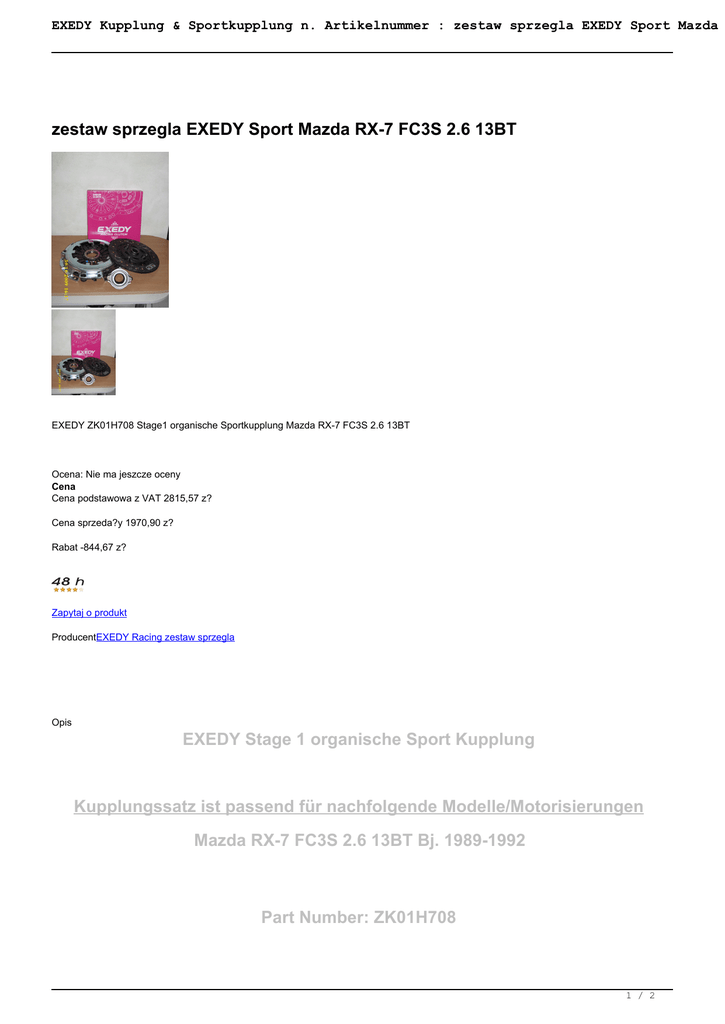 EXEDY Kupplung & Sportkupplung n. Artikelnummer : zestaw sprzegla EXEDY Sport Mazda zestaw sprzegla EXEDY Sport Mazda RX-7 FC3S 2.6 13BT EXEDY ZK01H708 Stage1 organische Sportkupplung Mazda RX-7 FC3S 2.6 13BT Ocena: Nie ma jeszcze oceny Cena Cena podstawowa z VAT 2815,57 z? Cena sprzeda?y 1970,90 z? Rabat -844,67 z? Zapytaj o produkt ProducentEXEDY Racing zestaw sprzegla Opis EXEDY Stage 1 organische Sport Kupplung Kupplungssatz ist passend für nachfolgende Modelle/Motorisierungen Mazda RX-7 FC3S 2.6 13BT Bj. 1989-1992 Part Number: ZK01H708 1 / 2 EXEDY Kupplung & Sportkupplung n. Artikelnummer : zestaw sprzegla EXEDY Sport Mazda Clutch Type: Stage 1 Organic Friction Facing: Organic Disc Diameter: 240mm Sprung Centre: Yes Clamp Load (N): 8430 Torque at Flywheel: 280 lb-ft / 370 Nm Torque at Wheels: 230 lb-ft / 300 Nm W opakowaniu1 2 / 2 Powered by TCPDF (www.tcpdf.org)