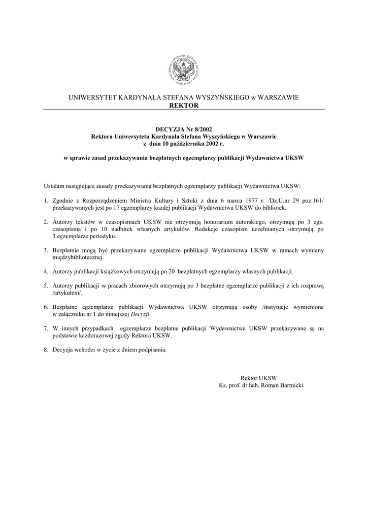 UNIWERSYTET KARDYNAŁA STEFANA WYSZYŃSKIEGO w WARSZAWIE REKTOR DECYZJA Nr 8/2002 Rektora Uniwersytetu Kardynała Stefana Wyszyńskiego w Warszawie z dnia 10 października 2002 r. w sprawie zasad przekazywania bezpłatnych egzemplarzy publikacji Wydawnictwa UKSW Ustalam następujące zasady przekazywania bezpłatnych egzemplarzy publikacji Wydawnictwa UKSW: 1. Zgodnie z Rozporządzeniem Ministra Kultury i Sztuki z dnia 6 marca 1977 r. /Dz.U.nr 29 poz.161/ przekazywanych jest po 17 egzemplarzy każdej publikacji Wydawnictwa UKSW do bibliotek. 2. Autorzy tekstów w czasopismach UKSW nie otrzymują honorarium autorskiego, otrzymują po 3 egz. czasopisma i po 10 nadbitek własnych artykułów. Redakcje czasopism uczelnianych otrzymują po 3 egzemplarze periodyku. 3. Bezpłatnie mogą być przekazywane egzemplarze publikacji Wydawnictwa UKSW w ramach wymiany międzybibliotecznej. 4. Autorzy publikacji książkowych otrzymują po 20 bezpłatnych egzemplarzy własnych publikacji. 5. Autorzy publikacji w pracach zbiorowych otrzymują po 3 bezpłatne egzemplarze publikacji z ich rozprawą /artykułem/. 6. Bezpłatne egzemplarze publikacji Wydawnictwa UKSW otrzymują osoby /instytucje wymienione w załączniku nr 1 do niniejszej Decyzji. 7. W innych przypadkach egzemplarze bezpłatne publikacji Wydawnictwa UKSW przekazywane są na podstawie każdorazowej zgody Rektora UKSW. 8. Decyzja wchodzi w życie z dniem podpisania. Rektor UKSW Ks. prof. dr hab. Roman Bartnicki Załącznik Nr 1 do Decyzji Nr 8/2002 Rektora UKSW z dnia 10 października 2002 r. Wykaz osób/instytucji otrzymujących bezpłatne egzemplarze publikacji Wydawnictwa UKSW. 1. Rektor 1 egz. 2. Biblioteka 6 egz. 3. Wydawnictwo 2 egz. 4. Ministerstwo Edukacji Narodowej i Sportu 1 egz. 5. Kuria Metropolitalna Warszawska – Wydział Nauki 1 egz. 6. Wielki Kanclerz 1 egz. 7. Nuncjusz Apostolski 1 egz. 8. Kongregacja ds. Nauki Katolickiej /tylko z teologii i prawa kan./ 1 egz. 9. Instytut Studiów nad Rodziną UKSW /biblioteka/ 1 egz. 10. Telegazeta 1 egz. 11. Katolicka Agencja Informacyjna 1 egz. 12. Cenzor 1 egz. 13. Przewodniczący Komisji Episkopatu Polski ds. Nauki 1 egz. 14. Grafik 1 egz. 15. Notes Wydawniczy 1 egz.
