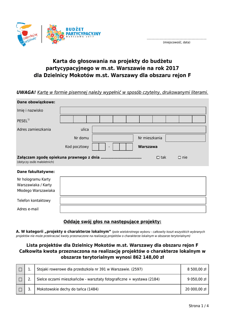 ..................................................................... (miejscowość, data) Karta do głosowania na projekty do budżetu partycypacyjnego w m.st. Warszawie na rok 2017 dla Dzielnicy Mokotów m.st. Warszawy dla obszaru rejon F UWAGA! Kartę w formie pisemnej należy wypełnić w sposób czytelny, drukowanymi literami. Dane obowiązkowe: Imię i nazwisko PESEL1) Adres zamieszkania ulica Nr domu Kod pocztowy Nr mieszkania - Warszawa Załączam zgodę opiekuna prawnego z dnia ……………………………… tak nie (dotyczy osób małoletnich) Dane fakultatywne: Nr hologramu Karty Warszawiaka / Karty Młodego Warszawiaka Telefon kontaktowy Adres e-mail Oddaję swój głos na następujące projekty: A. W kategorii „projekty o charakterze lokalnym” (pole wielokrotnego wyboru - całkowity koszt wszystkich wybranych projektów nie może przekraczać kwoty przeznaczone na realizację projektów o charakterze lokalnym w obszarze terytorialnym) Lista projektów dla Dzielnicy Mokotów m.st. Warszawy dla obszaru rejon F Całkowita kwota przeznaczona na realizację projektów o charakterze lokalnym w obszarze terytorialnym wynosi 862 148,00 zł □ 1. Stojaki rowerowe dla przedszkola nr 391 w Warszawie. (2597) 8 500,00 zł □ 2. Sielce oczami mieszkańców - warsztaty fotograficzne + wystawa (2184) 9 050,00 zł □ 3. Mokotowskie dechy do tańca (1484) 20 000,00 zł Strona 1 / 4 □ 4. Chodnik, ławka, kwietna łąka (1088) 28 002,00 zł □ 5. Odświeżenie i zagospodarowanie zieleni w okolicach ulic Zakrzewskiej, Sieleckiej i Stępińskiej (2083) 72 000,00 zł □ 6. 44 ławki dla Sielc (1175) 43 560,00 zł □ 7. Wypożyczalnie gier planszowych w bibliotece – Mokotów Rejon F (2349) □ 8. UŚMIECH DLA WSZYSTKICH ... integracja z osobami niepełnosprawnymi (2540) 32 185,00 zł □ 9. Międzypokoleniowe potańcówki na sieleckich podwórkach (1487) 53 260,00 zł □ 10. Modernizacja placu zabaw przy przedszkolu nr 391 - bezpieczny dla dzieci i rozwijający ruchowo (687) □ 11. Turnieje tenisa stołowego dla amatorów "Sielce 2017" (2352) □ 12. Nasz wymarzony ogród przedszkolny, zgodny ze standardami europejskimi. (1271) □ 13. Nie taki diabeł straszny ... sala komputerowa dla seniorów (2537) 59 400,00 zł □ 14. Wakacyjne kino plenerowe na Sielcach (1476) 42 650,00 zł □ 15. Centrum Nauki CERVANTES. (1074) 703 000,00 zł □ 16. Wymiana nawierzchni placów zabaw pomiędzy ulicami Gagarina, Czerską i Iwicką z piaskowej na granulat EPDM. (2129) 150 000,00 zł □ 17. Usprawnienie ruchu rowerowego na Sielcach (325) 116 000,00 zł □ 18. KLUB 3D (1287) 310 050,00 zł □ 19. Łąka Sobieskiego - EKO MIASTO (1763) 103 800,00 zł □ 20. Życzliwość wobec kobiet w ciąży dla mieszkanek Mokotowa. (1702) □ 21. Plac Stępiński - miejsce odpoczynku i relaksu w miejscu zaniedbanego placu węglowego (1911) 81 000,00 zł □ 22. Sielecki plac zabaw. (2644) 99 000,00 zł □ 23. Drzewa owocowe na Sielcach (1479) 26 100,00 zł □ 24. Zajęcia sportowe dla seniorów (1483) 7 520,00 zł □ 25. 70 drzew dla Osiedla Wschodnia Czerniakowska (2536) □ 26. Ścieżka rowerowa wzdłuż ul. Gagarina (78) □ 27. Sielce tańczą i śpiewają Grzesiuka - warsztaty śpiewacze i taneczne z muzyką na żywo (1475) □ 28. Okno na skwer (760) 4 000,00 zł 198 700,00 zł 21 550,00 zł 320 000,00 zł 2 900,00 zł 80 500,00 zł 720 000,00 zł 26 230,00 zł 126 000,00 zł Strona 2 / 4 □ 29. Kurs samoobrony dla mieszkańców Mokotowa (736) 570 000,00 zł □ 30. Remont ogrodzenia wokół Szkoły Podstawowej nr 190 (1374) 230 000,00 zł □ 31. Wsparcie dla Biblioteki dla Dzieci i Młodzieży nr LIV - zakup gier edukacyjnych i zabawek kreatywnych (1817) 7 400,00 zł □ 32. Rewitalizacja Parku Promenada KONTYNUACJA ZWYCIĘSKIEGO PROJEKTU 2015 (1961) 350 000,00 zł □ 33. Ochrona ptaków w Parku Morskie Oko (Promenada) i Sieleckim (2517) □ 34. AKADEMIA SKUTECZNEJ KOMUNIKACJI - ASK (1087) 15 900,00 zł □ 35. Zróbmy sobie skwer na Sielcach! (1481) 18 300,00 zł □ 36. Usunięcie niebezpiecznych drzew oraz remont nawierzchni na terenie boiska Szkoły Podstawowej nr 190 (1386) □ 37. Zakup nowości książkowych do Wypożyczalni nr 104 i Biblioteki LIV oraz audiobooków do Wypożyczalni nr 104 (735) □ 38. Prenumerata czasopism do Wypożyczalni nr 104 oraz Biblioteki dla Dzieci i Młodzieży nr LIV (1831) □ 39. Letnie warsztaty artystyczne dla dzieci (1490) 10 650,00 zł □ 40. Nauka przez ruch i zabawę – sala terapii integracji sensorycznej, Przedszk. Nr 391, Czerniakowska nr 20A (464) 77 000,00 zł □ 41. Spotkania z poczytnymi i znanymi autorami (733) 24 350,00 zł □ 42. Doposażenie Szkoły Podstawowej nr 190 w pomoce dydaktyczne – Plac zbaw (1397) 156 000,00 zł □ 43. MIEJSCA PARKINGOWE CZERNIAKOWSKO-HOŁÓWKOWE (2175) 170 000,00 zł □ 44. WYPOSAŻENIE SALI WIDOWISKOWEJ (2532) 111 313,00 zł □ 45. Ławki i kosze na śmieci na Sielcach (1478) 117 000,00 zł □ 46. WARSZTATY ZDROWEGO ŻYWIENIA DLA MIESZKAŃCÓW MOKOTOWA (346) 260 000,00 zł □ 47. Kreator Karier (1732) Wybrałam(/-łem) 2 000,00 zł 248 000,00 zł 77 700,00 zł 3 800,00 zł 39 800,00 zł projekt(y/-ów) o charakterze lokalnym, (liczba słownie) których łączny koszt realizacji wynosi zł (kwota liczbowa) Strona 3 / 4 Na podstawie art. 23 ust. 1 pkt 1 ustawy z dnia 29 sierpnia 1997 r. o ochronie danych osobowych (Dz.U. z 2014 r. poz. 1182, z późn. zm.), wyrażam zgodę na przetwarzanie moich danych osobowych przez Prezydenta m.st. Warszawy w celu realizacji budżetu partycypacyjnego w m.st. Warszawie na rok 20172). Oświadczam, iż wszystkie informacje podane w formularzu, w tym o zamieszkiwaniu na terenie m.st. Warszawy, są zgodne z aktualnym stanem faktycznym. Oświadczam także, iż zapoznałem się z treścią zarządzenia nr 1400/2015 Prezydenta m.st. Warszawy z dnia 08.10.2015 r. w sprawie konsultacji społecznych z mieszkańcami m.st. Warszawy w zakresie budżetu partycypacyjnego n