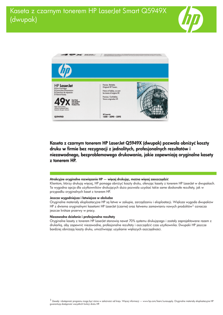 Kaseta z czarnym tonerem HP LaserJet Smart Q5949X (dwupak) Kaseta z czarnym tonerem HP LaserJet Q5949X (dwupak) pozwala obniżyć koszty druku w firmie bez rezygnacji z jednolitych, profesjonalnych rezultatów i niezawodnego, bezproblemowego drukowania, jakie zapewniają oryginalne kasety z tonerem HP. Atrakcyjne oryginalne rozwiązanie HP — więcej drukując, można więcej zaoszczędzić Klientom, którzy drukują więcej, HP pomaga obniżyć koszty druku, oferując kasety z tonerem HP LaserJet w dwupakach. Ta wygodna opcja dla użytkowników drukujących dużo pozwala uzyskać takie same doskonałe rezultaty, jak w przypadku oryginalnych kaset z tonerem HP. Jeszcze wygodniejsza i łatwiejsza w obsłudze Oryginalne materiały eksploatacyjne HP są łatwe w zakupie, zarządzaniu i eksploatacji. Większa wygoda dwupaków HP z dwiema oryginalnymi kasetami HP LaserJet (czarne) oraz łatwemu zamawianiu nowych produktów1 oznacza jeszcze krótsze przerwy w pracy. Niezawodne działanie i profesjonalne rezultaty Oryginalne kasety z tonerem HP LaserJet stanowią nawet 70% systemu drukującego i zostały zaprojektowane razem z drukarką, aby zapewnić niezawodne, profesjonalne rezultaty i oszczędzić czas użytkownika. Dwupaki HP jeszcze bardziej obniżają koszty druku, umożliwiając uzyskanie większych oszczędności. 1 Zasady i dostępność programu mogą być różne w zależności od kraju. Więcej informacji — www.hp.com/learn/suresupply. Oryginalne materiały eksploatacyjne HP gwarantują dostępność wszystkich funkcji druku HP. Kaseta z czarnym tonerem HP LaserJet Smart Q5949X (dwupak) Właściwości techniczne Dwie oryginalne kasety HP w jednym opakowaniu pozwalają wydrukować dwa razy więcej po niższej cenie. Można obniżyć koszty druku w firmie, nie rezygnując z niezawodnych, profesjonalnych rezultatów. Oryginalny toner HP i drukarki HP powstają razem, aby zapewnić niezmienne, profesjonalne rezultaty. HP SureSupply* ułatwia kupowanie i ponowne zamawianie oryginalnych materiałów eksploatacyjnych HP. Bezpłatny, wygodny zwrot i recykling w ponad 40 krajach* — więcej na www.hp.com/recycle. * Zasady programu i jego dostępność mogą być różne. Więcej informacji — www.hp.com/learn/suresupply * Oryginalne materiały eksploatacyjne HP gwarantują dostępność wszystkich funkcji druku HP. Dane techniczne produktu P/N Opis Kod UPC Wymiary (dł x szer x gł) Waga Średnia wydajność kasety z tonerem Q5949XD Kaseta z czarnym tonerem HP LaserJet Smart Q5949X (dwupak) 882780984912 388 x 248 x 210 mm Średnia wydajność wkładu: 6000 stron standardowych. Deklarowana wydajność zgodna z normą ISO/IEC 19752. © Copyright 2007 Hewlett-Packard Development Company L.P. Specyfikacje zawarte w tym dokumencie mogą bez uprzedzenia ulec zmianie. Wszystkie gwarancje udzielane w odniesieniu do produktów i usług HP określone zostały w oświadczeniach gwarancyjnych załączanych do każdego produktu i usługi. Żaden zapis niniejszego dokumentu nie może być uważany za dodatkową gwarancję. HP nie ponosi odpowiedzialności za błędy techniczne lub drukarskie w niniejszym dokumencie. Aby uzyskać więcej informacji na temat materiałów konsumpcyjnych HP, odwiedź http://www.hp.pl Publikacja na region EMEA 05/07 4AA0-7492 PLE 2,52 kg