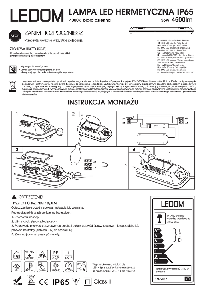 LAMPA LED HERMETYCZNA IP65 4000K biała dzienna 56W 4500lm ZANIM ROZPOCZNIESZ Przeczytaj uważnie wszystkie polecenia. PL - Lampa LED SMD / biała dzienna CZ - SMD LED žárovka / bílá denně DE - SMD LED lampe / Weiß Wohn ES - SMD LED lámpara / blanca Living FR - LED SMD lampe / Salon Blanc GB - SMD LED lamp / day white IT - Lampada LED SMD / Soggiorno Bianco LT - SMD LED lemputé / Baltas Gyvenimas LV - SMD LED spuldze / Baltas katru dienu SK - SMD žiarovka / biela denne RU - SMD лампа / Белый день NL - SMD LED lamp / wit dagelijks SE - SMD LED lampa / Día Blanco FI - SMD LED lamput / valkoinen päivittäin ZACHOWAJ INSTRUKCJĘ Używaj produktu według zaleceń producenta. Jeżeli masz jakieś pytania skontaktuj się z producentem. Wymagania elektryczne Lampa LED musi być podłączona do sieci elektrycznej zgodnie z zaleceniami na etykiecie produktu. Urządzenie jest oznaczone symbolem przekreślonego kołowego kontenera na śmieci zgodnie z Dyrektywą Europejską 2002/96/WE oraz Ustawą z dnia 29 lipca 2005 r. o zużytym sprzęcie elektrycznym i elektronicznym. To oznakowanie informuje, że sprzęt ten, po okresie jego użytkowania nie może być umieszczany łącznie z innymi odpadami pochodzącymi z gospodarstwa domowego. Użytkownik jest zobowiązany do oddania go prowadzącym zbieranie zużytego sprzętu elektrycznego i elektronicznego. Prowadzący zbieranie, w tym lokalne punkty zbiórki, sklepy oraz gminne jednostki, tworzą odpowiedni system umożliwiający oddanie tego sprzętu. Właściwe postępowanie ze zużytym sprzętem elektrycznym i elektronicznym przyczynia się do uniknięcia szkodliwych dla zdrowia ludzi i środowiska naturalnego konsekwencji, wynikających z obecności składników niebezpiecznych oraz niewłaściwego składowania i przetwarzania takiego sprzętu. INSTRUKCJA MONTAŻU 1 2 Driver 3 4 OSTRZEŻENIE! RYZYKO PORAŻENIA PRĄDEM Odłącz zasilanie przed inspekcją, instalacją lub wymianą. Postępuj zgodnie z zaleceniami na ilustracjach: 1. Zdemontuj nasadę. 2. Użyj śrubokręta do zdjęcia osłony 3. Poprowadź przewód przez otwór do środka i połącz przewód fazowy (brązowy - L) do zacisku (L), przewód neutralny (niebieski - N) do zacisku (N) 4. Zamontuj osłonę i przykręć nasadę. PF ≥0,9 220~240V 50/60Hz I 0,271A 60% 180˚ 4500 lm 50.000 4000 K W skład oprawy wchodzą wbudowane lampy LED. 30.000h IP65 1s Wyprodukowano w P.R.C. dla LEDIN Sp. z o.o. Spółka Komandytowa ul. Kołobrzeska 15/B 07-410 Ostrołęka Class II Nie można wymieniać lamp w oprawie.