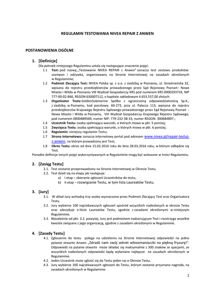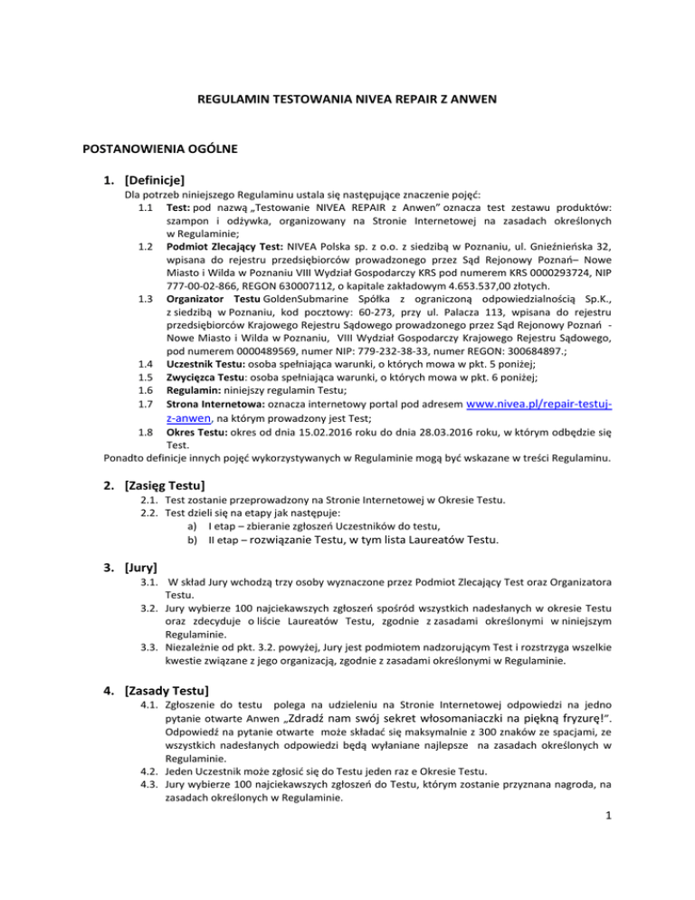 REGULAMIN TESTOWANIA NIVEA REPAIR Z ANWEN POSTANOWIENIA OGÓLNE 1. [Definicje] Dla potrzeb niniejszego Regulaminu ustala się następujące znaczenie pojęć: 1.1 Test: pod nazwą „Testowanie NIVEA REPAIR z Anwen” oznacza test zestawu produktów: szampon i odżywka, organizowany na Stronie Internetowej na zasadach określonych w Regulaminie; 1.2 Podmiot Zlecający Test: NIVEA Polska sp. z o.o. z siedzibą w Poznaniu, ul. Gnieźnieńska 32, wpisana do rejestru przedsiębiorców prowadzonego przez Sąd Rejonowy Poznań– Nowe Miasto i Wilda w Poznaniu VIII Wydział Gospodarczy KRS pod numerem KRS 0000293724, NIP 777-00-02-866, REGON 630007112, o kapitale zakładowym 4.653.537,00 złotych. 1.3 Organizator Testu GoldenSubmarine Spółka z ograniczoną odpowiedzialnością Sp.K., z siedzibą w Poznaniu, kod pocztowy: 60-273, przy ul. Palacza 113, wpisana do rejestru przedsiębiorców Krajowego Rejestru Sądowego prowadzonego przez Sąd Rejonowy Poznań Nowe Miasto i Wilda w Poznaniu, VIII Wydział Gospodarczy Krajowego Rejestru Sądowego, pod numerem 0000489569, numer NIP: 779-232-38-33, numer REGON: 300684897.; 1.4 Uczestnik Testu: osoba spełniająca warunki, o których mowa w pkt. 5 poniżej; 1.5 Zwycięzca Testu: osoba spełniająca warunki, o których mowa w pkt. 6 poniżej; 1.6 Regulamin: niniejszy regulamin Testu; 1.7 Strona Internetowa: oznacza internetowy portal pod adresem www.nivea.pl/repair-testujz-anwen, na którym prowadzony jest Test; 1.8 Okres Testu: okres od dnia 15.02.2016 roku do dnia 28.03.2016 roku, w którym odbędzie się Test. Ponadto definicje innych pojęć wykorzystywanych w Regulaminie mogą być wskazane w treści Regulaminu. 2. [Zasięg Testu] 2.1. Test zostanie przeprowadzony na Stronie Internetowej w Okresie Testu. 2.2. Test dzieli się na etapy jak następuje: a) I etap – zbieranie zgłoszeń Uczestników do testu, b) II etap – rozwiązanie Testu, w tym lista Laureatów Testu. 3. [Jury] 3.1. W skład Jury wchodzą trzy osoby wyznaczone przez Podmiot Zlecający Test oraz Organizatora Testu. 3.2. Jury wybierze 100 najciekawszych zgłoszeń spośród wszystkich nadesłanych w okresie Testu oraz zdecyduje o liście Laureatów Testu, zgodnie z zasadami określonymi w niniejszym Regulaminie. 3.3. Niezależnie od pkt. 3.2. powyżej, Jury jest podmiotem nadzorującym Test i rozstrzyga wszelkie kwestie związane z jego organizacją, zgodnie z zasadami określonymi w Regulaminie. 4. [Zasady Testu] 4.1. Zgłoszenie do testu polega na udzieleniu na Stronie Internetowej odpowiedzi na jedno pytanie otwarte Anwen „Zdradź nam swój sekret włosomaniaczki na piękną fryzurę!”. Odpowiedź na pytanie otwarte może składać się maksymalnie z 300 znaków ze spacjami, ze wszystkich nadesłanych odpowiedzi będą wyłaniane najlepsze na zasadach określonych w Regulaminie. 4.2. Jeden Uczestnik może zgłosić się do Testu jeden raz e Okresie Testu. 4.3. Jury wybierze 100 najciekawszych zgłoszeń do Testu, którym zostanie przyznana nagroda, na zasadach określonych w Regulaminie. 1 4.4. Przebieg I etapu Testu (15 lutego – 28 lutego 2016 r.) – Zgłoszenia Uczestników jest następujący: a) Uczestnik Testu musi udzielić odpowiedzi na jedno pytanie otwarte oraz podać swoje dane teleadresowe na Stronie Internetowej; b) Uczestnik Testu może dokonać jeden raz. 4.5. Przebieg II etapu Testu – wybór zwycięzców jest następujący: a) Jury wyłoni 100 najlepszych jego zdaniem zgłoszeń, które zostaną zwycięskimi i nagrodzonymi. Przy podejmowaniu decyzji Jury kieruje się subiektywną oceną w oparciu o kryterium pomysłowości, oryginalności, kreatywności, humoru oraz zgodności z tematyką pytania otwartego. b) Decyzja Jury jest ostateczna i nie podlega procedurze odwoławczej i w stosunku do każdego Zwycięzcy Testu zostanie podana e-mailem do 10 marca 2016 r. 4.6. Zwycięzcy Testu po przetestowaniu produktów zostaną poproszeni mailowo o wypełnienie ankiety z wyrażeniem opinii na temat przetestowanych produktów. 5. [Uczestnicy Testu] 5.1. Uczestnikiem Testu może być każda osoba fizyczna posiadająca pełną zdolność do czynności prawych, mająca miejsce zamieszkania w Polsce. 5.2. Warunkiem udziału w Teście jest pozostawienie na Stronie internetowej danych teleadresowych: imię, nazwisko, ulica, numer domu, kod pocztowy, miejscowość, adres email. 5.3. Warunkiem przystąpienia do Testu jest kliknięcie i akceptacja niniejszego Regulaminu oraz kliknięcie i wyrażenie zgody na przetwarzanie danych osobowych w zakresie niezbędnym do udziału w Teście. Zgłoszenie udziału w Teście oznacza akceptację jego zasad przewidzianych w niniejszym Regulaminie, w szczególności potwierdza prawdziwość informacji podanych przez Uczestnika Testu zgodnie z ust. 5.1 i 5.2 powyżej. 5.4. Kategorycznie zabrania się naruszania zasad uczciwego współzawodnictwa pod rygorem dyskwalifikacji z uczestnictwa w Teście decyzją Jury. 5.5. W Teście nie mogą uczestniczyć pracownicy Organizatora oraz Podmiotu Zlecającego Test, a także członkowie ich najbliższych rodzin, przez co rozumie się małżonka, wstępnych, zstępnych, rodzeństwo, przysposobionych i przysposabiających. 5.6. Uczestnictwo w Teście jest dobrowolne i nieodpłatne. Test prowadzony jest w celu promocji marki NIVEA. Uczestnicy Testu są zobowiązani do zapoznania się i przestrzegania zasad zawartych w niniejszym Regulaminie. W przypadku stwierdzenia istotnego naruszenia Regulaminu Organizator będzie uprawniony do wykluczenia Uczestnika z udziału w Teście. 5.7. Za istotne naruszenia Regulaminu uważa się w szczególności: a) naruszenia polegające na ingerencji w mechanizm działania Testu, w szczególności naruszenia pkt. 12.1 Regulaminu; b) naruszenia związane z zamieszczaniem odpowiedzi na pytanie otwarte oraz opinii zabronionych w świetle pkt 5.8 Regulaminu.; c) naruszenia polegające na niespełnienia warunków uczestnictwa w Teście, o których mowa w pkt. 5.1- 5.3. R