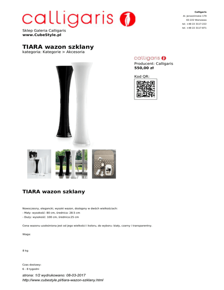 Calligaris Al. Jerozolimskie 179 02-222 Warszawa tel. +48 22 3117-222 tel. +48 22 3117-871 Sklep Galeria Calligaris www.CubeStyle.pl TIARA wazon szklany kategoria: Kategorie > Akcesoria Producent: Calligaris 550,00 zł Kod QR: TIARA wazon szklany Nowoczesny, elegancki, wysoki wazon, dostępny w dwóch wielkościach: - Mały: wysokość: 80 cm, średnica: 28.5 cm - Duży: wysokość: 100 cm, średnica:25 cm Cena wazonu uzależniona jest od jego wielkości i koloru, do wyboru: biały, czarny i transparentny. Waga: 8 kg Czas dostawy: 6 - 8 tygodni strona: 1/2 wydrukowano: 08-03-2017 http://www.cubestyle.pl/tiara-wazon-szklany.html Dostępne wersje: strona: 2/2 wydrukowano: 08-03-2017 http://www.cubestyle.pl/tiara-wazon-szklany.html