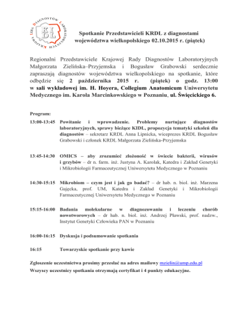 BO I I ZB A D LA N O S TÓW AG JN O Y WA R ATO R Spotkanie Przedstawicieli KRDL z diagnostami województwa wielkopolskiego 02.10.2015 r. (piątek) YC H KR A J Regionalni Przedstawiciele Krajowej Rady Diagnostów Laboratoryjnych Małgorzata Zielińska–Przyjemska i Bogusław Grabowski serdecznie zapraszają diagnostów województwa wielkopolskiego na spotkanie, które odbędzie się 2 października 2015 r. (piątek) o godz. 13:00 w sali wykładowej im. H. Hoyera, Collegium Anatomicum Uniwersytetu Medycznego im. Karola Marcinkowskiego w Poznaniu, ul. Święcickiego 6. Program: 13:00-13:45 Powitanie i wprowadzenie. Problemy nurtujące diagnostów laboratoryjnych, sprawy bieżące KIDL, propozycja tematyki szkoleń dla diagnostów – sekretarz KRDL Anna Lipnicka, wiceprezes KRDL Bogusław Grabowski i członek KRDL Małgorzata Zielińska-Przyjemska 13:45-14:30 OMICS – aby zrozumieć złożoność w świecie bakterii, wirusów i grzybów – dr n. farm. inż. Justyna A. Karolak, Katedra i Zakład Genetyki i Mikrobiologii Farmaceutycznej Uniwersytetu Medycznego w Poznaniu 14:30-15:15 Mikrobiom – czym jest i jak go badać? – dr hab. n. biol. inż. Marzena Gajęcka, prof. UM, Katedra i Zakład Genetyki i Mikrobiologii Farmaceutycznej Uniwersytetu Medycznego w Poznaniu 15:15-16:00 Badania molekularne w diagnozowaniu i leczeniu chorób nowotworowych – dr hab. n. biol. inż. Andrzej Pławski, prof. nadzw., Instytut Genetyki Człowieka PAN w Poznaniu 16:00-16:15 Dyskusja i podsumowanie spotkania 16:15 Towarzyskie spotkanie przy kawie Zgłoszenie uczestnictwa prosimy przesłać na adres mailowy [email protected] Wszyscy uczestnicy spotkania otrzymają certyfikat i 4 punkty edukacyjne.