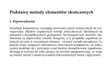 Podstawy metody elementów skończonych 1. Wprowadzenie Symulacje komputerowe wymagają stosowania metod numerycznych do rozwiązywania układów cząstkowych równań różniczkowych określonych na obszarach o skomplikowanych geometriach. Na brzegach tych obszarów zdefiniowane są odpowiednie warunki brzegowe, a w przypadku zagadnień zależnych od czasu w rozważanym obszarze – również warunki początkowe. Co prawda rośnie wydajność obliczeniowa stosowanych komputerów, ale jednocześnie modeluje się i rozwiązuje coraz bardziej skomplikowane zagadnienia. Wymaga to rozwoju nie tylko sprzętu, ale również oprogramowania, co wiąże się między innymi z opracowywaniem efektywniejszych metod i algorytmów. Z matematycznego punktu widzenia metody objętości skończonej [Hym1992], różnic skończonych [Hil1968], elementów brzegowych [Ban1994, Bur1995, Kan1994,], czy też metoda elementów skończonych [Hin1979, Zie2000a, Zie2000b, Zie2000c] są ze sobą blisko powiązane i trudno jest zdecydować, która z nich ma zdecydowaną przewagę nad pozostałymi. Podstawową zaletą tych metod jest możliwość uzyskania rozwiązań dla skomplikowanych kształtów, dla których niemożliwe jest przeprowadzenie obliczeń analitycznych. Każda z metod oparta na dyskretyzacji przestrzennej ma zarówno swoje zalety, jak i wady. Podobnie jest z doskonalonymi w ostatnim czasie metodami bezsiatkowymi [Fas2007, Liu2003]. Wymieniając metody rozwiązywania równań różniczkowych cząstkowych, wspomnieć należy również o metodzie kollokacji brzegowej, należącej do grupy metod brzegowych. Metoda ta może być rozpatrywana jako jeden z wariantów metody Trefftza, w której równanie różniczkowe rządzące zjawiskiem jest spełnione ściśle (przez przyjętą postać funkcji próbnych), a warunki brzegowe są spełnione w sposób przybliżony [Tre1926]. Jednym ze sposobów uzyskania przybliżonego spełnienia jest metoda kollokacji brzegowej. W pracy [Kol2001] zaprezentowano przegląd prac dotyczących zastosowania metody kollokacji brzegowej do rozwiązywania problemów mechaniki stosowanej. Obecnie metoda elementów skończonych (MES) jest szeroko stosowana w rozwiązywaniu zadań wynikających z praktycznych problemów przemysłowych [Hua1999]. W tym rozdziale zawarte jest krótkie wprowadzenie do metody elementów skończonych. Przedstawione są również sposoby badania oraz kontroli stabilności rozwiązań numerycznych z wykorzystaniem MES. Sposoby te można wykorzystać również w innych metodach siatkowych. W latach pięćdziesiątych XX wieku zaczęto do rozwiązywania zagadnień technicznych wykorzystywać metodę różnic skończonych. W późniejszych latach równie skutecznie stosowano metodę elementów skończonych. Szczegółowa teoria metody elementów skończonych została opisana w licznej literaturze, np. [Hue1975, Tay1981, Zie2000a, Zie2000b, Zie2000c]. W książkach Zienkiewicza wypunktowano jej zalety. Jedną z cech decydujących o przewadze metody elementów skończonych nad metodą różnic skończonych jest względna łatwość uwzględniania w obliczeniach warunków brzegowych rozwiązywanych zagadnień [Bur1985]. Wiele rzeczywistych problemów charakteryzuje się warunkami brzegowymi wyrażonymi za pomocą wyznaczanych wielkości oraz nieregularnymi i skomplikowanymi kształtami brzegów obszaru. Powoduje to, że aplikacja warunków brzegowych w metodzie różnic skończonych jest dosyć kłopotliwa. Wymaga bowiem aproksymacji tych warunków na węzłach siatki. Algorytmy oparte na metodzie elementów skończonych są uniezależnione od postaci szczegółowych warunków brzegowych. 2. Metoda residuów ważonych Jedną z metod pozwalających rozwiązać cząstkowe równanie różniczkowe z określonymi warunkami brzegowymi i początkowymi jest metoda residuów ważonych (MRW). Jest to metoda numeryczna, która może być użyta do rozwiązania pojedynczego równania lub układu równań różniczkowych cząstkowych określonego na obszarze z brzegiem = , a dokładne rozwiązanie reprezentuje jedną zmienną lub wektor kolumnowy zmiennych. Zastosowanie tej metody składa się z dwóch kroków. W pierwszym zakłada się, że pewna funkcja w przybliżeniu (aproksymacyjnie) spełnia dane równanie różniczkowe oraz warunki brzegowe. Po podstawieniu tej funkcji aproksymującej do równania różniczkowego i warunków brzegowych można określić błąd spełnienia (dokładność aproksymacji) nazywany residuum. Wymagane jest, by residuum „znikało” (aby jego wartość była równa zero lub bliska zeru) na rozważanym obszarze. Innymi słowy, im mniejsza jest wartość residuum, tym lepsza jest funkcja aproksymująca rozwiązanie. W drugim kroku rozwiązuje się dane równanie (lub równania) z warunkami brzegowymi wynikające z pierwszego kroku i tym samym można uzyskać rozwiązanie. Rozważmy stacjonarne (niezależne od czasu) cząstkowe równanie różniczkowe Lu f , (1) zdefiniowane w obszarze wraz z warunkami brzegowymi określonymi na brzegu . Lu określa operator różniczkowy, w którym znajdują się pochodne funkcji u do drugiego rzędu włącznie. W metodzie residuów ważonych rozwiązanie u jest aproksymowane przez wyrażenie u postaci N u S0 u j S j , (2) j 1 gdzie S j są funkcjami próbnymi, a S 0 musi spełniać wszystkie określone warunki brzegowe zagadnienia ( S 0 0 , jeżeli wszystkie warunki są jednorodne) i S i musi spełniać następujące warunki: S j powinna być taka, aby L S j była dobrze zdefiniowana i niezerowa, to znaczy, aby istniały wymagane jej pochodne; S j musi spełniać przynajmniej warunek brzegowy Dirichleta rozważanego zagadnienia; dla dowolnego N zbiór funkcji próbnych S j , j 1, 2,..., N liniowo niezależny. musi być Wprowadźmy pojęcie błędu lub residuum, RΩ , aproksymacji (przez zastąpienie w równaniu szukanej funkcji jej przybliżeniem u ), które definiujemy jako R Lu f , (3) gdzie u zawiera funkcje
