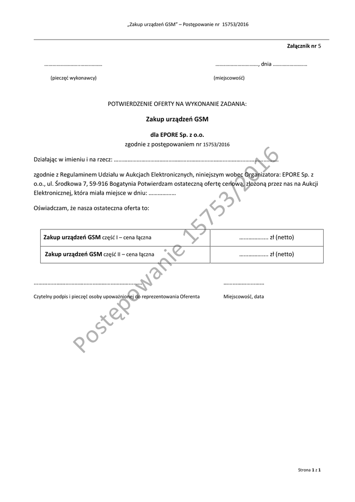 „Zakup urządzeń GSM” – Postępowanie nr 15753/2016 Załącznik nr 5 ……………………..…….……… …….……………………, dnia …………….……… (pieczęć wykonawcy) (miejscowość) POTWIERDZENIE OFERTY NA WYKONANIE ZADANIA: Zakup urządzeń GSM 16 dla EPORE Sp. z o.o. zgodnie z postępowaniem nr 15753/2016 Działając w imieniu i na rzecz: ………………………………………………………………………………………………. 53 /2 0 zgodnie z Regulaminem Udziału w Aukcjach Elektronicznych, niniejszym wobec Organizatora: EPORE Sp. z o.o., ul. Środkowa 7, 59-916 Bogatynia Potwierdzam ostateczną ofertę cenową, złożoną przez nas na Aukcji Elektronicznej, która miała miejsce w dniu: ……………… 15 7 Oświadczam, że nasza ostateczna oferta to: w an Zakup urządzeń GSM część II – cena łączna ie Zakup urządzeń GSM część I – cena łączna po ……………………………………………………………… …………….... zł (netto) ……………………… Miejscowość, data Po st ę Czytelny podpis i pieczęć osoby upoważnionej do reprezentowania Oferenta …………….... zł (netto) Strona 1 z 1