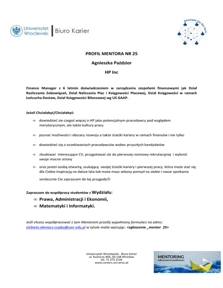 PROFIL MENTORA NR 25 Agnieszka Paździor HP Inc Finance Manager z 6 letnim doświadczeniem w zarządzaniu zespołami finansowymi jak Dział Rozliczania Zobowiązań, Dział Naliczania Plac i Księgowości Placowej, Dział Księgowości w ramach Łańcucha Dostaw, Dział Księgowości Bilansowej wg US GAAP. Jeżeli Chciałabyś/Chciałabyś: • dowiedzieć sie czegoś więcej o HP jako potencjalnym pracodawcy pod względem merytorycznym, ale także kultury pracy • poznać możliwości i obszary rozwoju a także ścieżki kariery w ramach finansów i nie tylko • dowiedzieć się o oczekiwaniach pracodawców wobec przyszłych kandydatów • zbudować interesujące CV, przygotować sie do pierwszej rozmowy rekrutacyjnej i wyłonić swoje mocne strony • oraz jesteś osobą otwartą, szukającą swojej ścieżki kariery i pierwszej pracy, która może stać się dla Ciebie inspiracją na dalsze lata lub może masz własny pomysł na siebie i nasze spotkania serdecznie Cie zapraszam do tej przygody☺ Zapraszam do współpracy studentów z Wydziału: • Prawa, Administracji i Ekonomii, • Matematyki i Informatyki. Jeśli chcesz współpracować z tym Mentorem prześlij wypełniony formularz na adres: [email protected] w tytule maila wpisując: <zgłoszenie _mentor 25> Uniwersytet Wrocławski - Biuro Karier ul. Kuźnicza 49A, 50-138 Wrocław tel. 71 375 2134 www.careers.uni.wroc.pl
