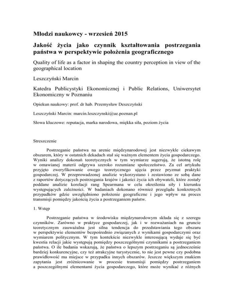 Młodzi naukowcy - wrzesień 2015 Jakość życia jako czynnik kształtowania postrzegania państwa w perspektywie położenia geograficznego Quality of life as a factor in shaping the country perception in view of the geographical location Leszczyński Marcin Katedra Publicystyki Ekonomicznej i Public Relations, Uniwersytet Ekonomiczny w Poznaniu Opiekun naukowy: prof. dr hab. Przemysław Deszczyński Leszczyński Marcin: [email protected] Słowa kluczowe: reputacja, marka narodowa, miękka siła, poziom życia Streszczenie Postrzeganie państwa na arenie międzynarodowej jest niezwykle ciekawym obszarem, który w ostatnich dekadach stał się ważnym elementem życia gospodarczego. Wyniki analizy dokonań teoretycznych w tym wymiarze sugerują, że istotną rolę w omawianej materii odgrywa szeroko rozumiane społeczeństwo. Za cel artykułu przyjęto zweryfikowanie owego teoretycznego ujęcia przez pryzmat praktyki gospodarczej. W przeprowadzonej analizie wykorzystano i zestawiono ze sobą dane z raportów dotyczących postrzegania krajów i jakości życia ich obywateli, które zostały poddane analizie korelacji rang Spearmana w celu określenia siły i kierunku występujących zależności. W badaniach dokonano również przeglądu konkretnych przypadków gdzie uwzględniono położenie geograficzne i jego wpływ na proces transmisji pomiędzy jakością życia a postrzeganiem państw. 1. Wstęp Postrzeganie państwa w środowisku międzynarodowym składa się z szeregu czynników. Zarówno w praktyce gospodarczej, jak i w rozważaniach na gruncie teoretycznym zauważalna jest silna tendencja do przedstawiania tego obszaru w perspektywie elementów bezpośrednio związanych z wynikami gospodarczymi oraz wymiarem politycznym. W tym kontekście niezwykle interesującą wydaje się być kwestia relacji jakie występują pomiędzy poszczególnymi czynnikami a postrzeganiem państwa. O ile badania wskazują, że państwa o lepszym postrzeganiu są jednocześnie bardziej konkurencyjne, czy też atrakcyjne turystycznie, to nie jest pewne czy podobna prawidłowość ma miejsce w przypadku innych obszarów. Jeszcze większym znakiem zapytania jest zróżnicowanie w procesie transmisji pomiędzy postrzeganiem a poszczególnymi elementami życia gospodarczego, które może wynikać z różnych przyczyn. Globalne rozpatrywanie zależności jest miarodajne, ale nie uwzględnia różnic na innych poziomach, które mogą mieć istotny wpływ na ostateczne wyniki. W artykule podjęto się analizy czynnika jakim jest społeczeństwo, który często jest przedstawiany w literaturze właśnie w kontekście postrzegania państwa. Ten szeroko pojęty czynnik składa się z szeregu aspektów, wśród których najbardziej odpowiednim wydaje się być jakość życia rozpatrywana zarówno w wymiarze obiektywnym, jak i subiektywnym. Przedmiotem badań jest relacja jaka zachodzi pomiędzy tym obszarem a postrzeganiem państwa z uwzględnieniem różnic wynikających z położenia geograficznego. W analizie zostały uwzględnione kraje leżące w różnych częściach wszystkich kontynentów, co miało na celu zweryfikowanie różnic występujących w sile i kierunku procesu transmisji pomiędzy omawianymi obszarami. W badaniach wykorzystano dane z raportów dotyczących postrzegania kraju i jakości życia, które zostały poddane trzem rodzajom analiz, gdzie dwie odnosiły się do przeglądu i porównania pod względem miejsc zajmowanych przez konkretne państwa, a jedna była kompleksowym ujęciem kierunku i siły wzajemnej relacji pomiędzy postrzeganiem państwa a jakością życia obywateli, do której wykorzystano analizę korelacji rang Spearmana. 2. Materiał i Metody Postrzeganie państwa na arenie międzynarodowej jest obszarem, który w ostatnich dekadach stał się ważnym elementem życia gospodarczego. Mając świadomość, że zjawisko to miało znaczenie już w czasach starożytnych, czego przykłady można znaleźć w Biblii lub w dziełach Herodota, czy Tacyta (Kunczik 2003), warto zauważyć, że to właśnie w XX w. doszło do profesjonalizacji działań w ramach tej dziedziny w wymiarze państw. Ten stan rzeczy jest wynikiem procesów, które rozwinęły się w tym okresie oraz pogłębiają się do dzisiaj. Pośród takich elementów jak postęp techniczny i technologiczny, czy też rozwój stosunków społecznoekonomicznych, warto zwrócić uwagę na trzy procesy, które w największym stopniu wpłynęły na wzrost znaczenia roli reputacji państw i związanych z tym konsekwencji w życiu gospodarczym. Mowa o demokratyzacji, mediatyzacji i globalizacji. Owe zjawiska doprowadziły do pewnych zmian w funkcjonowaniu w życiu gospodarczym na arenie międzynarodowej, a tym samym spowodowały potrzebę do opisania i wyjaśnienia ich na gruncie teoretycznym. Postrzeganie kraju można rozpatrywać między innymi przez pryzmat trzech różnych dyscyplin, tj. ekonomia, marketing i politologia. W ekonomii postrzeganie kraju należy utożsamiać z reputacją i zaufaniem. W marketingu można mówić o marce narodowej lub marce kraju (Olins 1999; Anholt 2006; Szondi 2008; Hereźniak 2011), z kolei w wymiarze politologicznym o tzw. miękkiej sile kraju. (Nye 2004) Warto zauważyć, że w każdym z tych wymiarów wśród szeregu różnorodnych czynników występują aspekty związane ze społeczeństwem. Przybliżając powiązania występujące pomiędzy postrzeganiem państwa a społeczeństwem warto przeanalizować dokonania teoretyczne w wymiarze ogólnym na temat wizerunku kraju. Za przykład może posłużyć podział zaproponowany przez M. Urbaniaka, który uwzględnia społeczeństwo jako jeden z czynników kształtujących wizerunek kraju, obok zewnętrznego postrzegania, kultury, gospodarki i polityki wewnętrznej. (Urbaniak 2003) Na wagę społeczeństwa w tym wymiarze wskazuje również podział T. Sikory, gdzie wśród tzw. składników kognitywnych wpływających na wizerunek państwa wy