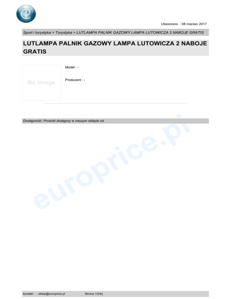 Utworzono : 08 marzec 2017 Sport i turystyka > Turystyka > LUTLAMPA PALNIK GAZOWY LAMPA LUTOWICZA 2 NABOJE GRATIS LUTLAMPA PALNIK GAZOWY LAMPA LUTOWICZA 2 NABOJE GRATIS Model : - No image Producent : - l .p Dostępność: Produkt dostępny w naszym sklepie od o r u e kontakt : - [email protected] r p e ic Strona 1/{nb}