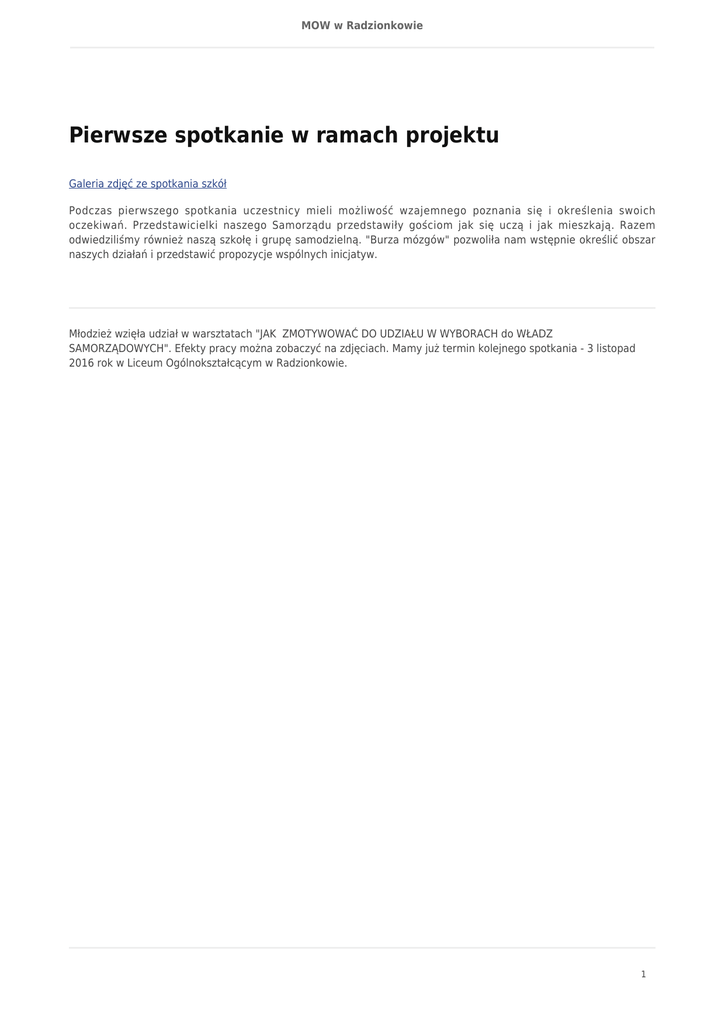 MOW w Radzionkowie Pierwsze spotkanie w ramach projektu Galeria zdjęć ze spotkania szkół Podczas pierwszego spotkania uczestnicy mieli możliwość wzajemnego poznania się i określenia swoich oczekiwań. Przedstawicielki naszego Samorządu przedstawiły gościom jak się uczą i jak mieszkają. Razem odwiedziliśmy również naszą szkołę i grupę samodzielną. "Burza mózgów" pozwoliła nam wstępnie określić obszar naszych działań i przedstawić propozycje wspólnych inicjatyw. Młodzież wzięła udział w warsztatach "JAK ZMOTYWOWAĆ DO UDZIAŁU W WYBORACH do WŁADZ SAMORZĄDOWYCH". Efekty pracy można zobaczyć na zdjęciach. Mamy już termin kolejnego spotkania - 3 listopad 2016 rok w Liceum Ogólnokształcącym w Radzionkowie. 1
