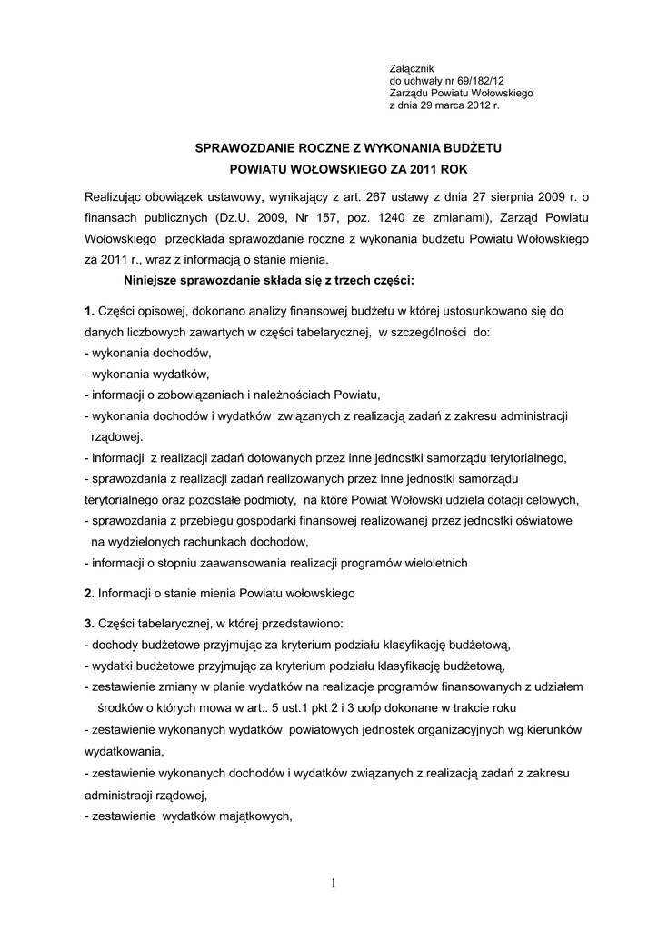 Załącznik do uchwały nr 69/182/12 Zarządu Powiatu Wołowskiego z dnia 29 marca 2012 r. SPRAWOZDANIE ROCZNE Z WYKONANIA BUDśETU POWIATU WOŁOWSKIEGO ZA 2011 ROK Realizując obowiązek ustawowy, wynikający z art. 267 ustawy z dnia 27 sierpnia 2009 r. o finansach publicznych (Dz.U. 2009, Nr 157, poz. 1240 ze zmianami), Zarząd Powiatu Wołowskiego przedkłada sprawozdanie roczne z wykonania budŜetu Powiatu Wołowskiego za 2011 r., wraz z informacją o stanie mienia. Niniejsze sprawozdanie składa się z trzech części: 1. Części opisowej, dokonano analizy finansowej budŜetu w której ustosunkowano się do danych liczbowych zawartych w części tabelarycznej, w szczególności do: - wykonania dochodów, - wykonania wydatków, - informacji o zobowiązaniach i naleŜnościach Powiatu, - wykonania dochodów i wydatków związanych z realizacją zadań z zakresu administracji rządowej. - informacji z realizacji zadań dotowanych przez inne jednostki samorządu terytorialnego, - sprawozdania z realizacji zadań realizowanych przez inne jednostki samorządu terytorialnego oraz pozostałe podmioty, na które Powiat Wołowski udziela dotacji celowych, - sprawozdania z przebiegu gospodarki finansowej realizowanej przez jednostki oświatowe na wydzielonych rachunkach dochodów, - informacji o stopniu zaawansowania realizacji programów wieloletnich 2. Informacji o stanie mienia Powiatu wołowskiego 3. Części tabelarycznej, w której przedstawiono: - dochody budŜetowe przyjmując za kryterium podziału klasyfikację budŜetową, - wydatki budŜetowe przyjmując za kryterium podziału klasyfikację budŜetową, - zestawienie zmiany w planie wydatków na realizacje programów finansowanych z udziałem środków o których mowa w art.. 5 ust.1 pkt 2 i 3 uofp dokonane w trakcie roku - zestawienie wykonanych wydatków powiatowych jednostek organizacyjnych wg kierunków wydatkowania, - zestawienie wykonanych dochodów i wydatków związanych z realizacją zadań z zakresu administracji rządowej, - zestawienie wydatków majątkowych, 1 CZEŚĆ PIERWSZA I. BUDśET POWIATU WOŁOWSKIEGO I JEGO ZMIANY Podstawę gospodarki finansowej Powiatu stanowiły wielkości ekonomiczne zawarte w podjętej w dniu 26 stycznia 2011 r., Uchwałą Rady Powiatu Nr IV/31/1011 w sprawie uchwalenia budŜetu Powiatu Wołowskiego na rok 2011. Przyjęte do realizacji wielkości planistyczne kształtowały się następująco: 1. Dochody: 45 648 501,00 zł, w tym: dochody majątkowe 160 000,00 zł, 2. Wydatki: 45 648 501,00 zł, w tym: wydatki majątkowe 308 200,00 zł, 3. Deficyt: 0,00 zł, 4. Przychody: 2 500 000,00 zł, 5. Rozchody: 2 500 000,00 zł. Do opracowania budŜetu Powiatu Wołowskiego na 2011 r., po raz pierwszy miał zastosowanie przepis art. 242 ustawy o finansach publicznych, obligujący do zachowania równowagi bieŜącej w wielkościach planistycznych. Warunek równowagi zachowany musi być takŜe w odniesieniu do faktycznie wykonanych, na koniec roku budŜetowego, wielkości dochodów i wydatków bieŜących. BudŜet Powiatu Wołowskiego został uchwalony przez Radę jako budŜet zrównowaŜony, załoŜono, Ŝe źródłem finansowania rozchodów z tytułu wykupu obligacji, będą przychody z emisji nowych obligacji. Prognozowana łączna kwota długu na koniec 2011r., stanowiła 44,03% planowanych dochodów i wynosiła 20 100 000,00 zł UpowaŜniając do zmian wielkości planistycznych w trakcie realizacji budŜetu, ustawodawca podzielił kompetencje do dokonywania określonych czynności pomiędzy organy Powiatu. Dokonane w zakresie przyznanych uprawnień, na mocy podejmowanych zarówno przez Radę Powiatu jak i Zarząd Powiatu uchwał, zmiany wielkości planistycznych spowodowały osiągnięcie na koniec 2011 roku wielkości na poziomie: 1. Dochody: 49 008 649,03 zł, w tym: dochody majątkowe 2. Wydatki: 51 945 049,03 zł, w tym: wydatki majątkowe 3 652 082,00 zł, 3. Deficyt: 807 764,00 zł, 2 936 400,00, zł, 4. Przychody: 12 036 400,00 zł, 5. Rozchody: 9 100 000,00 zł. Ostatecznie, w wyniku wprowadzonych zmian budŜet Powiatu Wołowskiego został uchwalony przez Radę Powiatu Wołowskiego, jako budŜet deficytowy. ZałoŜono, Ŝe źródłem 2 finansowania rozchodów z tytułu wykupu obligacji, będą przychody z emisji nowych obligacji oraz wolne środki z 2010 roku o których mowa w art. 217 ust.2 pkt 6 ustawy w kwocie 1.266.400,00 zł Prognozowana łączna kwota długu na koniec 2011r., w kwocie 21 770 000,00 zł, stanowiła 44,42% planowanych dochodów. Uchwałą Rady Powiatu Nr XVI/102/11 z dnia 30 grudnia 2011r., ustalono wykaz wydatków, które nie wygasły z upływem 2011 roku, w wysokości 266 295, 00 zł. Na zmianę budŜetu Powiatu Wołowskiego w omawianym okresie miały wpływ: zwiększenia planu dochodów o kwotę 3 360 148,03 zł (w tym: zwiększenie planu dochodów bieŜących o 2 712 384,03 zł, majątkowych o 647 764,00 zł) oraz, zwiększenie planu wydatków o kwotę 6 296 548,03 zł (w tym zwiększenie planu wydatków bieŜących o 2 952 666,03 zł oraz wydatków majątkowych o 3 343 882,00 zł). Zmiany po stronie planu dochodów 1. Zwiększono plan dochodów własnych o kwotę 1 580 091,17 zł w tym: dochody majątkowe z tytułu planowanego zbycia udziałów spółki Nefromedica 350 000,00zł, pozostałe dochody bieŜące 1 331 637,17 zł. 2. Zwiększono plan dotacji o kwotę 2 604 172,86 zł w tym dotacje na zadania inwestycyjne 297 764,00 zł, na zadania bieŜące 2 306 408,86 zł, 3. Zmniejszono plan subwencji o kwotę 824 116,00 zł w tym: zmniejszenie części oświatowej o 866 769,00 zł, części równowaŜącej o 11,00 zł oraz zwiększenie o kwotę 42 664,00 zł uzupełnienia subwencji ogólnej. PoniŜsza tabela przedstawia zmiany w planie dochodów budŜetu powiatu z uwzględnieniem wykonania dochodów w działach klasyfikacji budŜetowej (w zł) DZIAŁ WYSZCZEGÓLNIENIE PLAN WG UCHWAŁY 1. 2. 3. ZMIANA PLANU W 2011 ROKU PLAN PO ZMIANACH NA 31.12.2011 WYKONANIE DOCHO