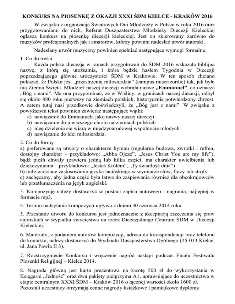 KONKURS NA PIOSENKĘ Z OKAZJI XXXI ŚDM KIELCE - KRAKÓW 2016 W związku z organizacją Światowych Dni Młodzieży w Polsce w roku 2016 oraz przygotowaniami do nich, Referat Duszpasterstwa Młodzieży Diecezji Kieleckiej ogłasza konkurs na piosenkę diecezji kieleckiej. Jest on skierowany zarówno do muzyków profesjonalnych jak i amatorów, którzy powinni nadesłać utwór autorski. Nadesłany utwór muzyczny powinien spełniać następujące wymogi formalne. 1. Co do treści Każda polska diecezja w ramach przygotowań do ŚDM 2016 wskazała biblijną nazwę, z którą się utożsamia, i która będzie hasłem Tygodnia w Diecezji poprzedzającego główne uroczystości ŚDM w Krakowie. W ten sposób chciano pokazać, że Polska jest „przestrzenią miłosierdzia” (campus misericordie) tak, jak była nią Ziemia Święta. Młodzież naszej diecezji wybrała nazwę „Emmanuel”, co oznacza „Bóg z nami”. Ma ona przypominać, że w Wiślicy, w granicach naszej diecezji, odbył się około 880 roku pierwszy na ziemiach polskich, historycznie potwierdzony chrzest. A zatem tutaj nasi przodkowie doświadczyli, że „Bóg jest z nami”. W związku z powyższym tekst powinien zawierać następujące wątki: a) nawiązanie do Emmanuela jako nazwy naszej diecezji b) nawiązanie do pierwszego chrztu na ziemiach polskich c) ideę dzielenia się wiarą w międzynarodowej wspólnocie młodych d) nawiązanie do idei miłosierdzia. 2. Co do formy a) preferowane są utwory o charakterze hymnu (regularna budowa, zwrotki i refren, dostojny charakter – przykładowo: „Abba Ojcze”, „Jesus Christ You are my life”), bądź pieśń chwały (zawiera jedną lub kilka części, ma charakter uwielbienia lub dziękczynienia – przykładowo: „Jesteś Królem”, „Ty światłość dnia”) b) mile widziane zastosowanie języka łacińskiego w wymiarze słów, frazy lub strofy c) zachęcamy, aby jedna część była łatwa do zaśpiewania również dla obcokrajowców lub przetłumaczenia na język angielski. 3. Kompozycję należy dostarczyć w postaci zapisu nutowego i nagrania, najlepiej w formacie mp3. 4. Termin nadsyłania kompozycji upływa z dniem 30 czerwca 2014 roku. 5. Przesłanie utworu do konkursu jest jednoznaczne z akceptacją zrzeczenia się praw autorskich w wypadku zwycięstwa na rzecz Diecezjalnego Centrum ŚDM w Diecezji Kieleckiej. 6. Materiały, z podaniem autorów kompozycji, adresu do korespondencji oraz telefonu do kontaktu, należy dostarczyć do Wydziału Duszpasterstwa Ogólnego (25-013 Kielce, ul. Jana Pawła II 3). 7. Rozstrzygnięcie Konkursu i wręczenie nagród nastąpi podczas Finału Festiwalu Piosenki Religijnej – Kielce 2014. 8. Nagroda główną jest karta prezentowa na kwotę 500 zł do wykorzystania w Księgarni „Jedność” oraz dwa pakiety pielgrzyma A1, uprawniające do uczestnictwa w etapie centralnym XXXI ŚDM – Kraków 2016 o łącznej wartości około 1600 zł. Pozostali uczestnicy otrzymają cenne nagrody książkowe i pamiątkowe dyplomy.