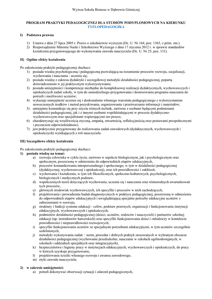 Wyższa Szkoła Biznesu w Dąbrowie Górniczej PROGRAM PRAKTYKI PEDAGOGICZNEJ DLA STUDIÓW PODYPLOMOWYCH NA KIERUNKU TYFLOPEDAGOGIKA I) Podstawa prawna 1) Ustawa z dnia 27 lipca 2005 r. Prawo o szkolnictwie wyższym (Dz. U. Nr 164, poz. 1365, z późn. zm.). 2) Rozporządzenie Ministra Nauki i Szkolnictwa Wyższego z dnia 17 stycznia 2012 r. w sprawie standardów kształcenia przygotowującego do wykonywania zawodu nauczyciela (Dz. U. Nr 25, poz. 131). II) Ogólne efekty kształcenia Po zakończeniu praktyki pedagogicznej słuchacz: 1) posiada wiedzę psychologiczną i pedagogiczną pozwalającą na rozumienie procesów rozwoju, socjalizacji, wychowania i nauczania - uczenia się; 2) posiada wiedzę z zakresu dydaktyki i szczegółowej metodyki działalności pedagogicznej, popartą doświadczeniem w jej praktycznym wykorzystywaniu; 3) posiada umiejętności i kompetencje niezbędne do kompleksowej realizacji dydaktycznych, wychowawczych i opiekuńczych zadań szkoły, w tym do samodzielnego przygotowania i dostosowania programu nauczania do potrzeb i możliwości uczniów; 4) wykazuje umiejętność uczenia się i doskonalenia własnego warsztatu pedagogicznego z wykorzystaniem nowoczesnych środków i metod pozyskiwania, organizowania i przetwarzania informacji i materiałów; 5) umiejętnie komunikuje się przy użyciu różnych technik, zarówno z osobami będącymi podmiotami działalności pedagogicznej, jak i z innymi osobami współdziałającymi w procesie dydaktycznowychowawczym oraz specjalistami wspierającymi ten proces; 6) charakteryzuje się wrażliwością etyczną, empatią, otwartością, refleksyjnością oraz postawami prospołecznymi i poczuciem odpowiedzialności; 7) jest praktycznie przygotowany do realizowania zadań zawodowych (dydaktycznych, wychowawczych i opiekuńczych) wynikających z roli nauczyciela. III) Szczegółowe efekty kształcenia Po zakończeniu praktyki pedagogicznej słuchacz: 1) posiada wiedzę na temat: a) rozwoju człowieka w cyklu życia, zarówno w aspekcie biologicznym, jak i psychologicznym oraz społecznym, poszerzoną w odniesieniu do odpowiednich etapów edukacyjnych, b) procesów komunikowania interpersonalnego i społecznego, w tym w działalności pedagogicznej (dydaktycznej, wychowawczej i opiekuńczej), oraz ich prawidłowości i zakłóceń, c) wychowania i kształcenia, w tym ich filozoficznych, społeczno-kulturowych, psychologicznych, biologicznych i medycznych podstaw, d) współczesnych teorii dotyczących wychowania, uczenia się i nauczania oraz różnorodnych uwarunkowań tych procesów, e) głównych środowisk wychowawczych, ich specyfiki i procesów w nich zachodzących, f) projektowania i prowadzenia badań diagnostycznych w praktyce pedagogicznej, poszerzoną w odniesieniu do odpowiednich etapów edukacyjnych i uwzględniającą specjalne potrzeby edukacyjne uczniów z zaburzeniami w rozwoju, g) struktury i funkcji systemu edukacji - celów, podstaw prawnych, organizacji i funkcjonowania instytucji edukacyjnych, wychowawczych i opiekuńczych, h) podmiotów działalności pedagogicznej (dzieci, uczniów, rodziców i nauczycieli) i partnerów szkolnej edukacji (np. instruktorów harcerskich) oraz specyfiki funkcjonowania dzieci i młodzieży w kontekście prawidłowości i nieprawidłowości rozwojowych, i) specyfiki funkcjonowania uczniów ze specjalnymi potrzebami edukacyjnymi, w tym uczniów szczególnie uzdolnionych, j) metodyki wykonywania zadań − norm, procedur i dobrych praktyk stosowanych w wybranym obszarze działalności pedagogicznej (wychowanie przedszkolne, nauczanie w szkołach ogólnodostępnych, w szkołach i oddziałach specjalnych oraz integracyjnych), k) bezpieczeństwa i higieny pracy w instytucjach edukacyjnych, wychowawczych i opiekuńczych, do pracy w których uzyskuje przygotowanie, l) projektowania ścieżki własnego rozwoju i awansu zawodowego, m) etyki zawodu nauczyciela; 2) w zakresie umiejętności: a) potrafi dokonywać obserwacji sytuacji i zdarzeń pedagogicznych, Wyższa Szkoła Biznesu w Dąbrowie Górniczej b) potrafi wykorzystywać wiedzę teoretyczną z zakresu pedagogiki oraz psychologii do analizowania i interpretowania określonego rodzaju sytuacji i zdarzeń pedagogicznych, a także motywów i wzorów zachowań uczestników tych sytuacji, c) potrafi posługiwać się wiedzą teoretyczną z zakresu pedagogiki, psychologii oraz dydaktyki i metodyki szczegółowej w celu diagnozowania, analizowania i prognozowania sytuacji pedagogicznych oraz dobierania strategii realizowania działań praktycznych na poszczególnych etapach edukacyjnych, d) potrafi samodzielnie zdobywać wiedzę i rozwijać swoje profesjonalne umiejętności związane z działalnością pedagogiczną (dydaktyczną, wychowawczą i opiekuńczą), korzystając z różnych źródeł (w języku polskim i obcym) i nowoczesnych technologii, e) posiada umiejętności diagnostyczne pozwalające na rozpoznawanie sytuacji uczniów ze specjalnymi potrzebami edukacyjnymi, opracowywanie wyników obserwacji i formułowanie wniosków, f) posiada rozwinięte kompetencje komunikacyjne: potrafi porozumiewać się z osobami pochodzącymi z różnych środowisk, będącymi w różnej kondycji emocjonalnej, dialogowo rozwiązywać konflikty i konstruować dobrą atmosferę dla komunikacji w klasie szkolnej, g) potrafi ocenić przydatność typowych metod, procedur i dobrych praktyk do realizacji zadań dydaktycznych, wychowawczych i opiekuńczych związanych z odpowiednimi etapami edukacyjnymi, h) potrafi dobierać i wykorzystywać dostępne materiały, środki i metody pracy w celu projektowania i efektywnego realizowania działań pedagogicznych (dydaktycznych, wychowawczych i opiekuńczych) oraz wykorzystywać nowoczesne technologie do pracy dydaktycznej, i) potrafi kierować procesami kształcenia i wychowania, posiada umiejętność pracy z grupą (zespołem wychowawczym, klasowym), j) potrafi animować prace nad rozwojem uczes